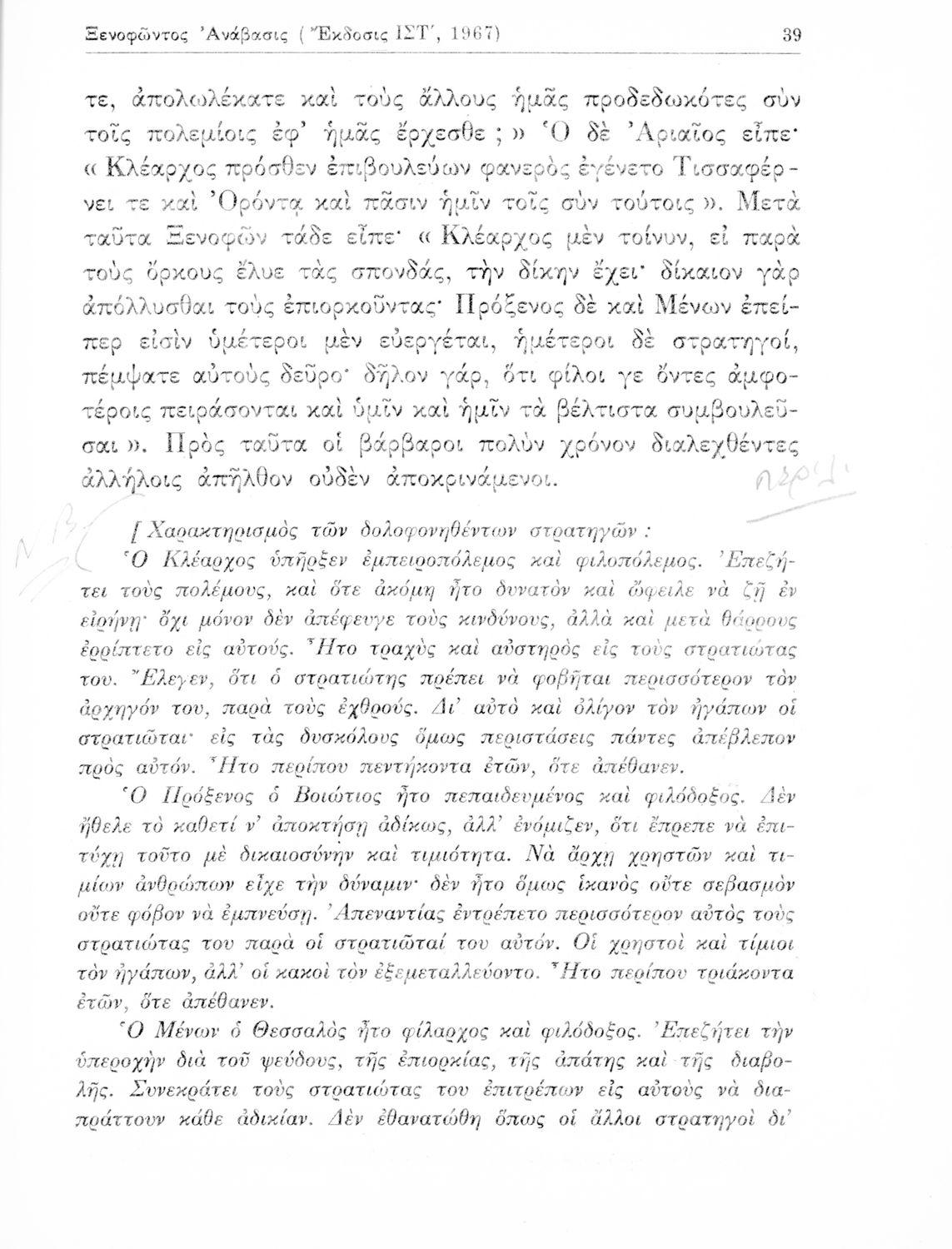 Σχολικό εγχειρίδιο Αρχαίων Ελληνικών για τη Γ' Γυμνασίου που περιέχει αποσπάσματα από την Ανάβαση του Ξενοφώντα και ερμηνευτικά και ετυμολογικά σχόλια.