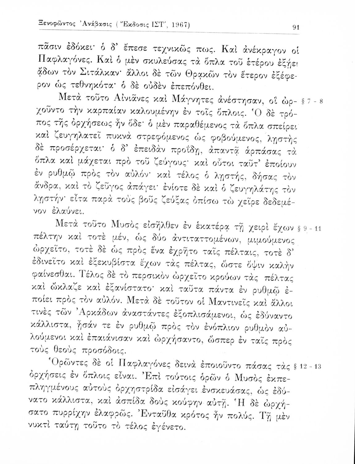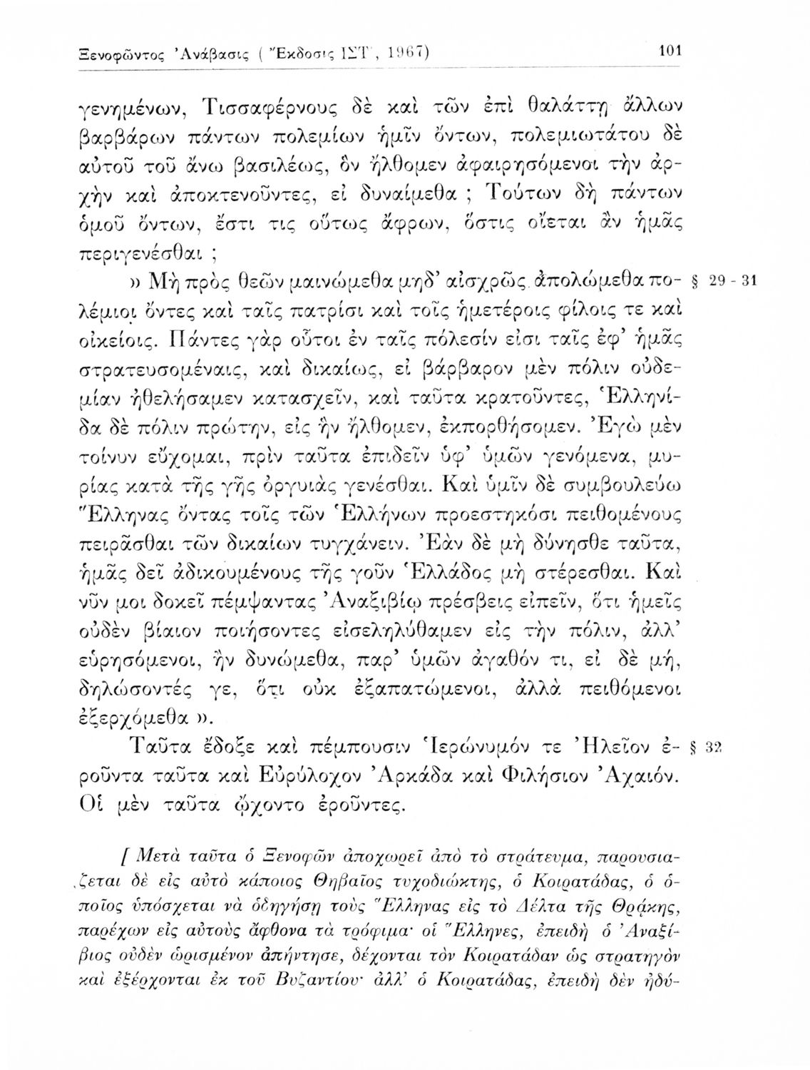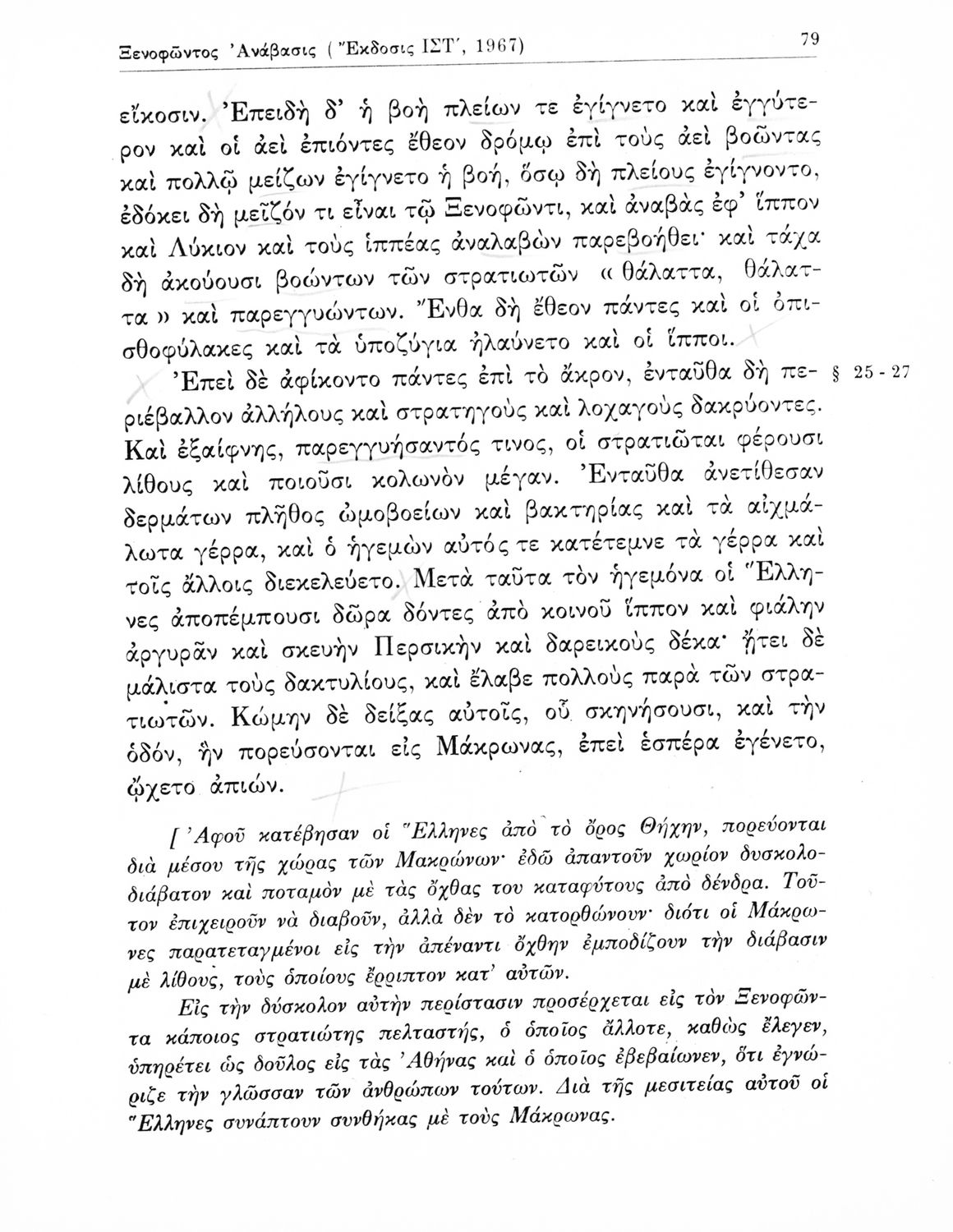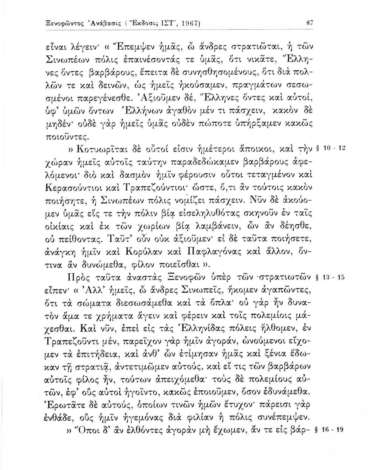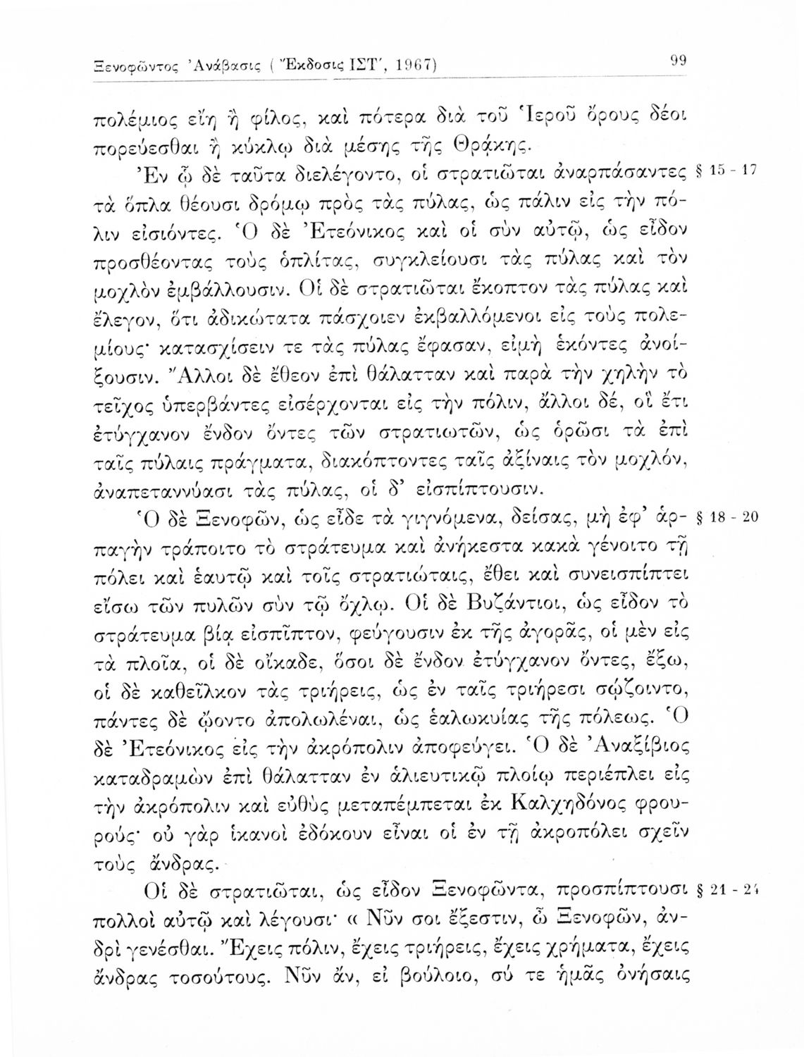 Σχολικό εγχειρίδιο Αρχαίων Ελληνικών για τη Γ' Γυμνασίου που περιέχει αποσπάσματα από την Ανάβαση του Ξενοφώντα και ερμηνευτικά και ετυμολογικά σχόλια.