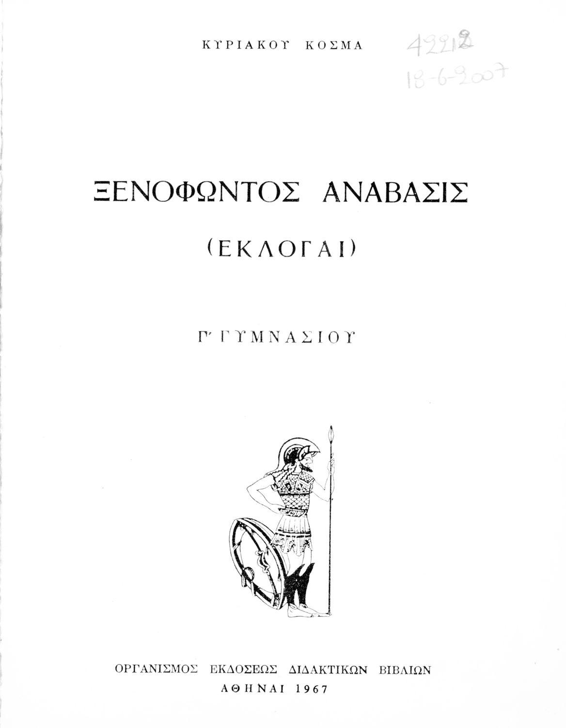 Σχολικό εγχειρίδιο Αρχαίων Ελληνικών για τη Γ' Γυμνασίου που περιέχει αποσπάσματα από την Ανάβαση του Ξενοφώντα και ερμηνευτικά και ετυμολογικά σχόλια.