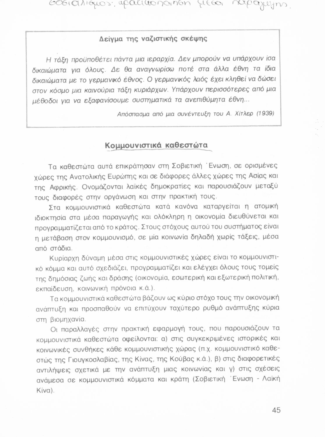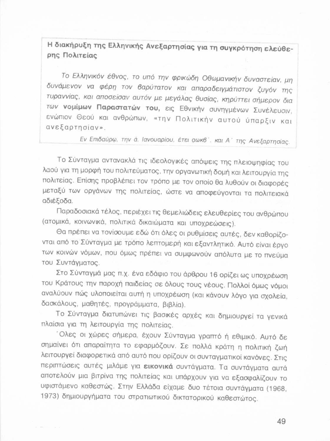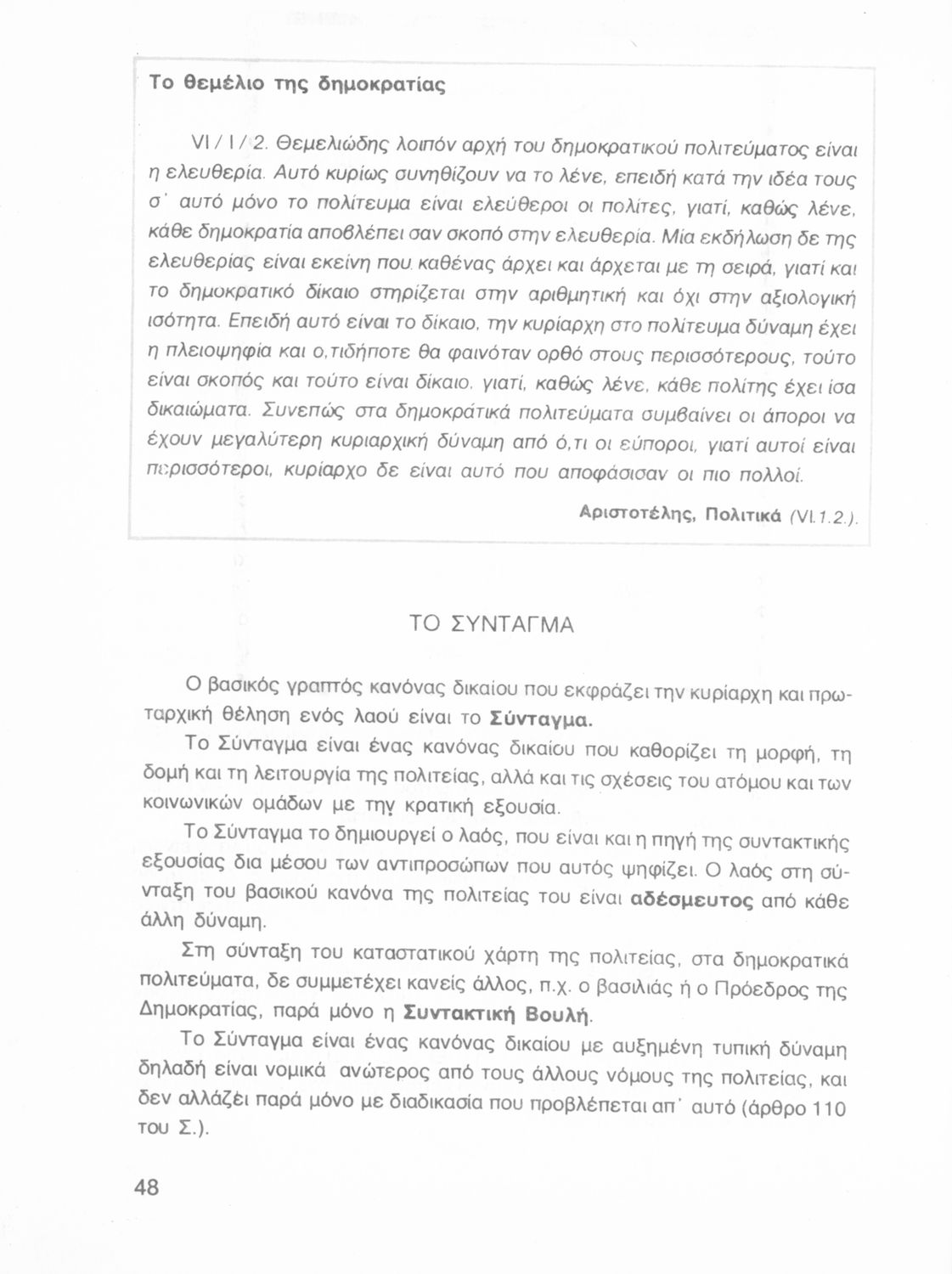 LDR 01503 2200205 4500 035 ## _a01-42215 040 ## _aΙνστιτούτο Εκπαιδευτικής Πολιτικής 041 ## _ael 100 ## _aΒ. Γ. Πετριτσόπουλος _aΠ. Ι. Γιαννακόπουλος _aΑ. Γ. Καράλης 110 ## _a42215 245 0# _aΣτοιχεία Δημοκρατικού Πολιτεύματος. Γ΄ Γυμνασίου 250 ## _a1η Έκδοση 260 ## _aΑθήνα _bΟργανισμός Εκδόσεως Διδακτικών Βιβλίων _c1982 300 ## _a213 _bΕικόνες (έγχρωμες) 520 ## _aΣχολικό εγχειρίδιο της Γ΄ Γυμνασίου για το μάθημα της Πολιτικής Αγωγής. Αρχικά αναφέρεται γενικά στις λειτουργίες της κοινωνίας, μετά στη διοίκηση, και τα διοικητικά συστήματα. Στη συνέχεια παρουσιάζει τα στοιχεία του δημοκρατικού πολιτεύματος. Αναλύει τους δημοκρατικούς θεσμούς και τέλος παρουσιάζει τους Διεθνείς Οργανισμούς. 521 ## _aΓ' Γυμνασίου 522 ## _aΕλλάδα 546 ## _aΔημοτική 583 ## _a3927/30-12-1982. _c1982 650 #4 _aΔημοκρατία _aΕξουσίες _aΚοινοβουλευτισμός _aΟΗΕ _aΠολίτευμα _aΣύνταγμα