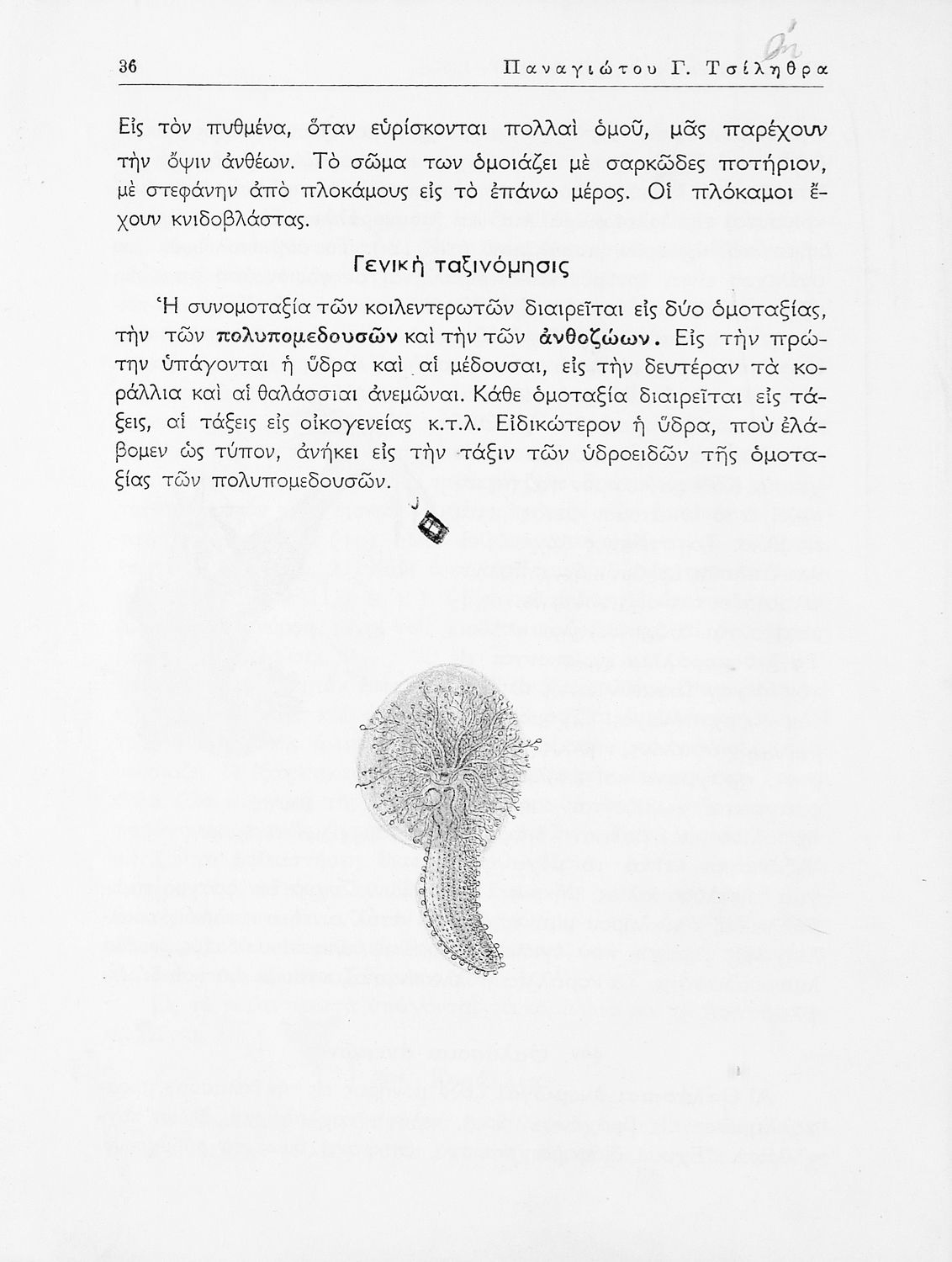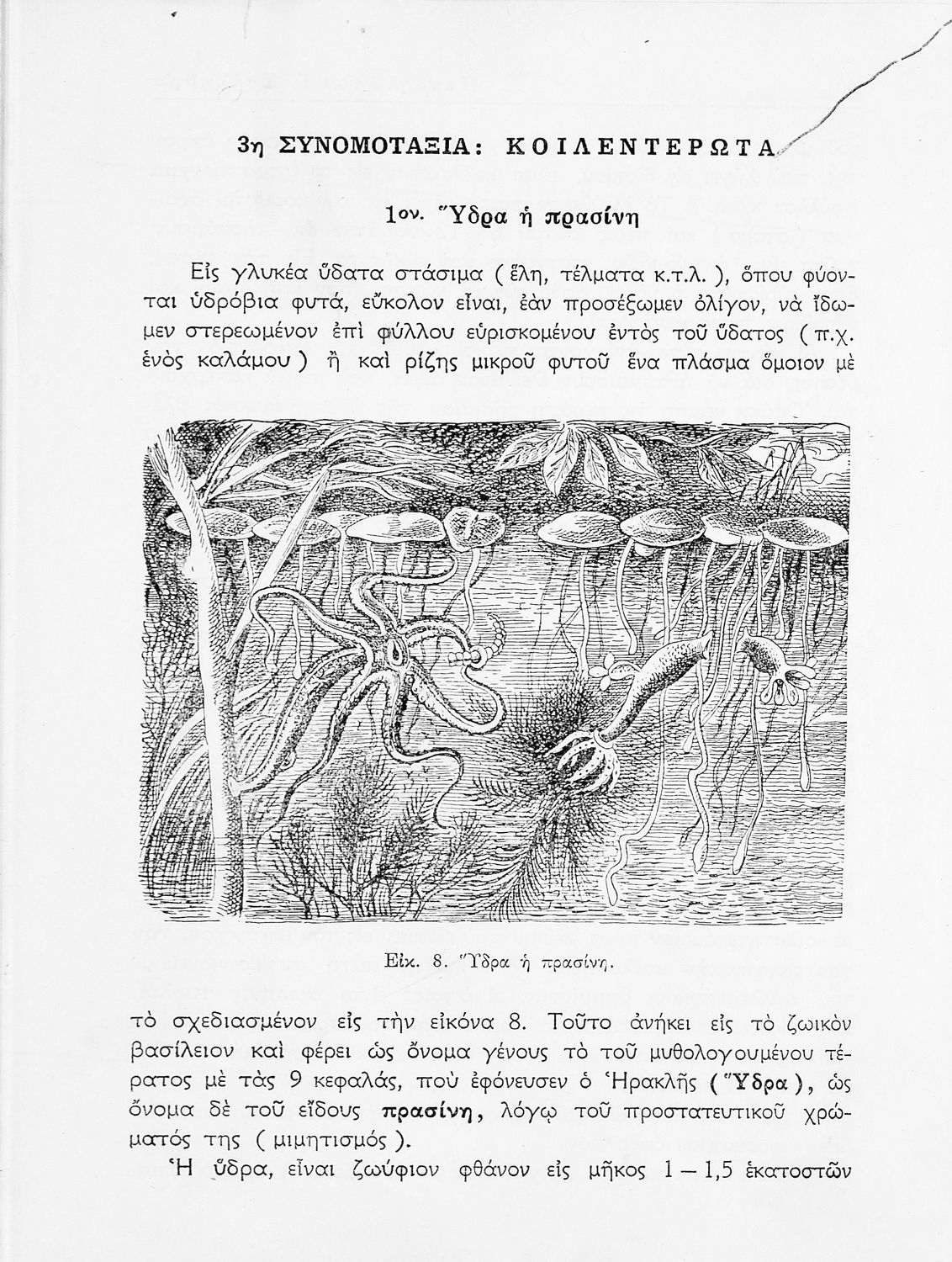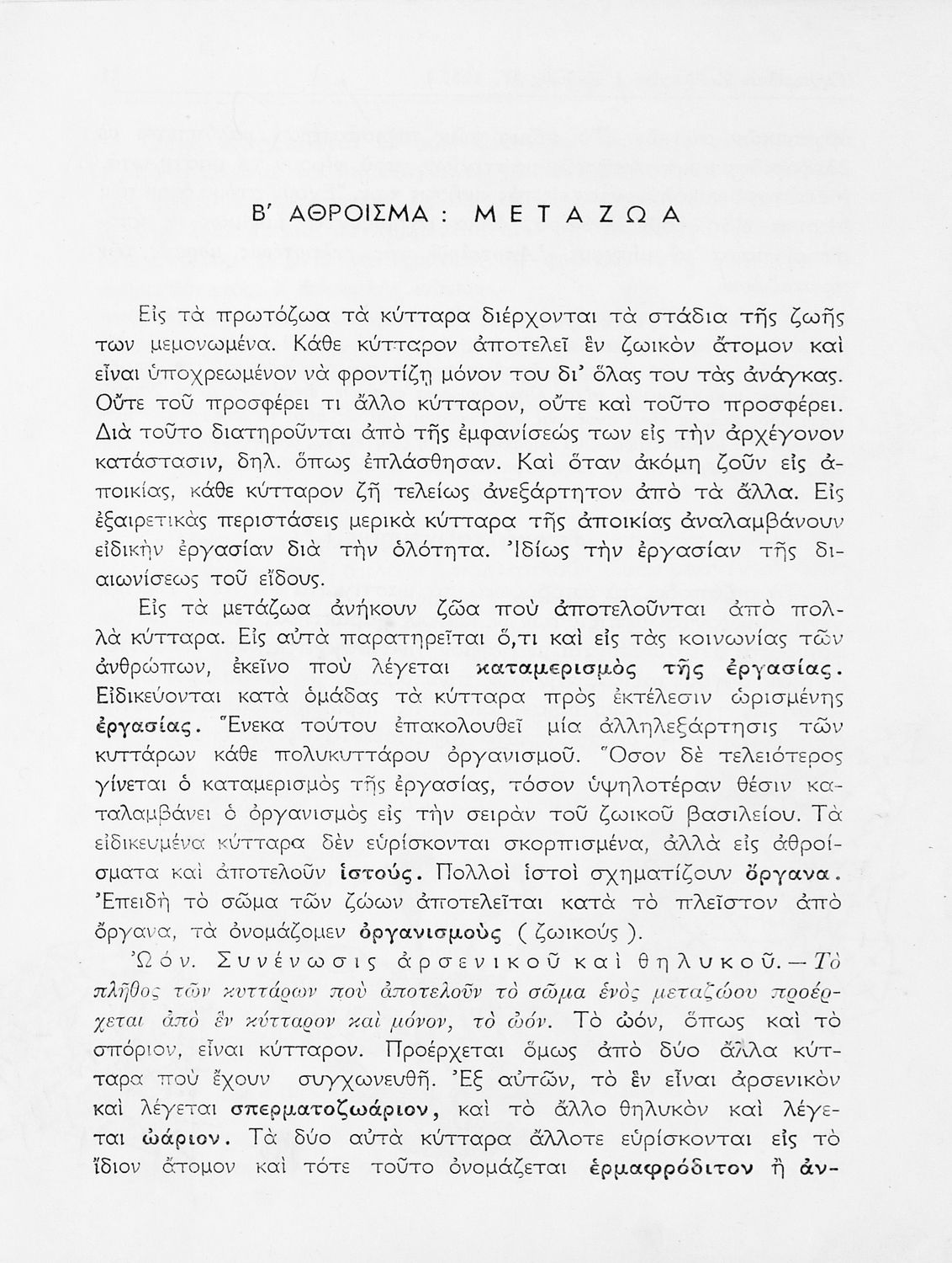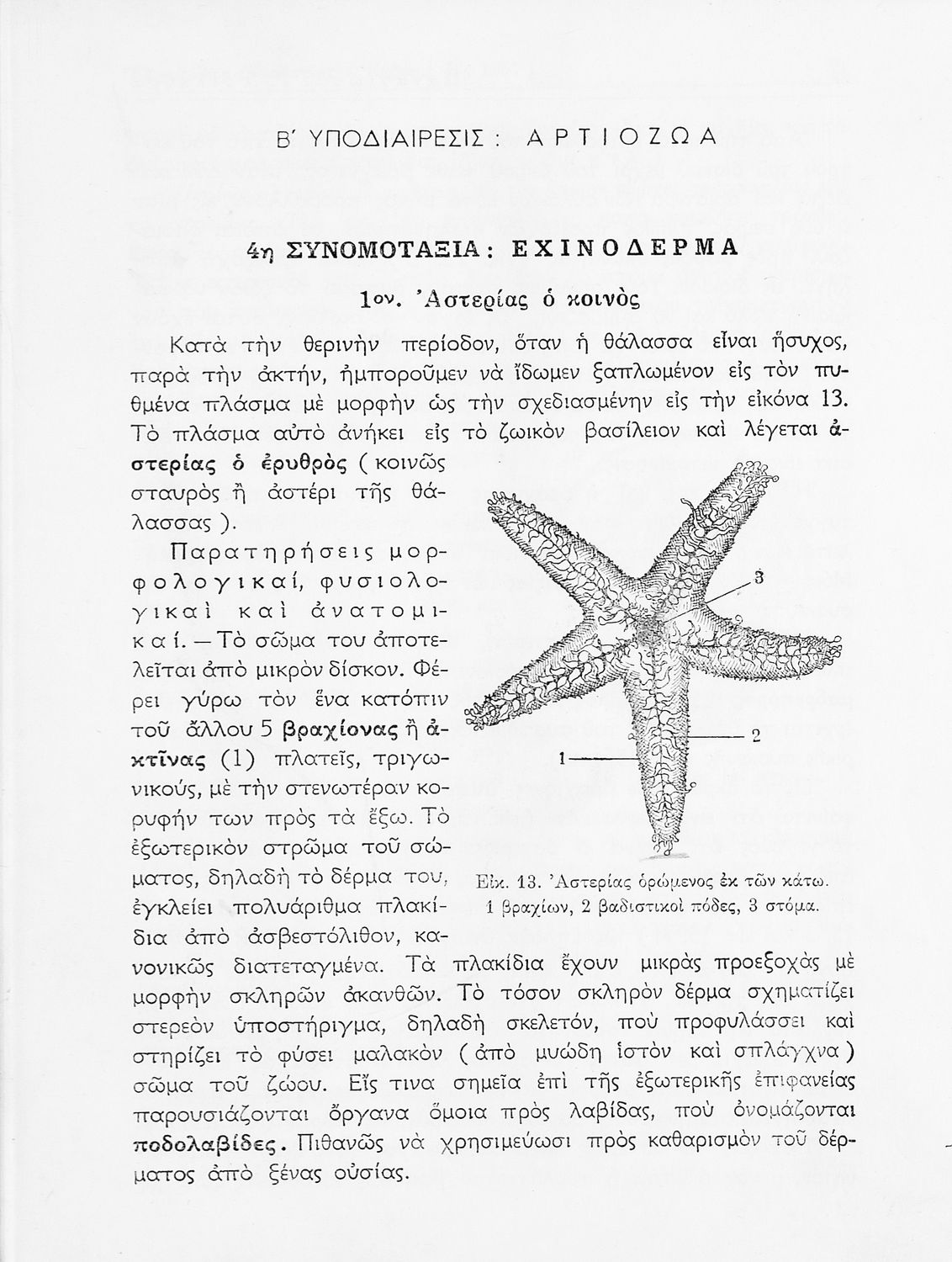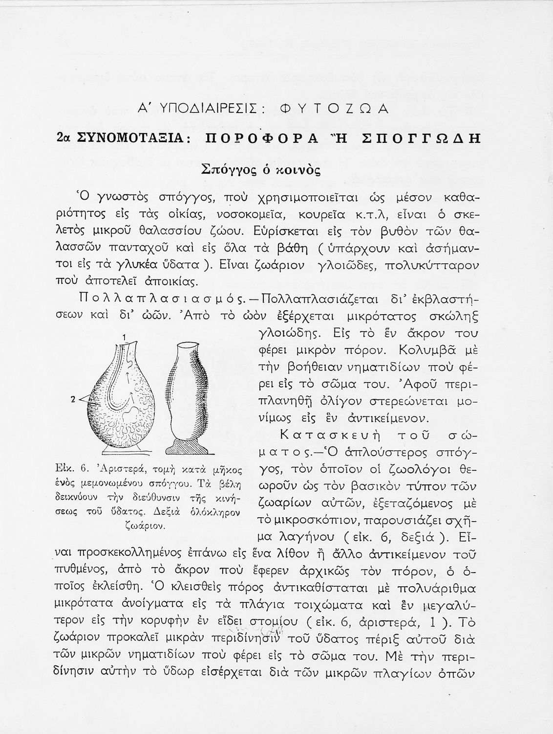 Σχολικό εγχειρίδιο Ζωολογίας για τα Γυμνάσια και τα Διδασκαλεία που εστιάζει στην ανθρώπινη φυσιολογία και παρουσιάζει τα διάφορα ζώα ανάλογα με την συνομοταξία στην οποία ανήκουν.