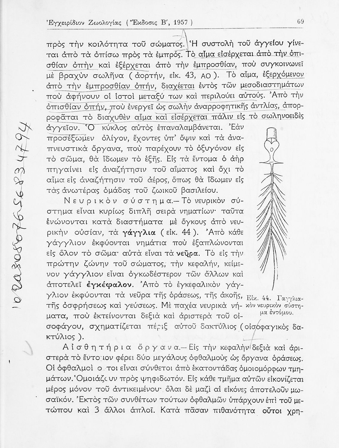 Σχολικό εγχειρίδιο Ζωολογίας Α΄ Γυμνασίου που εστιάζει στη φυσιολογία και ανατομία και παρουσιάζει τα διάφορα ζώα ανάλογα με την συνομοταξία στην οποία ανήκουν. Φέρει το σύμβολο της δικτατορίας.