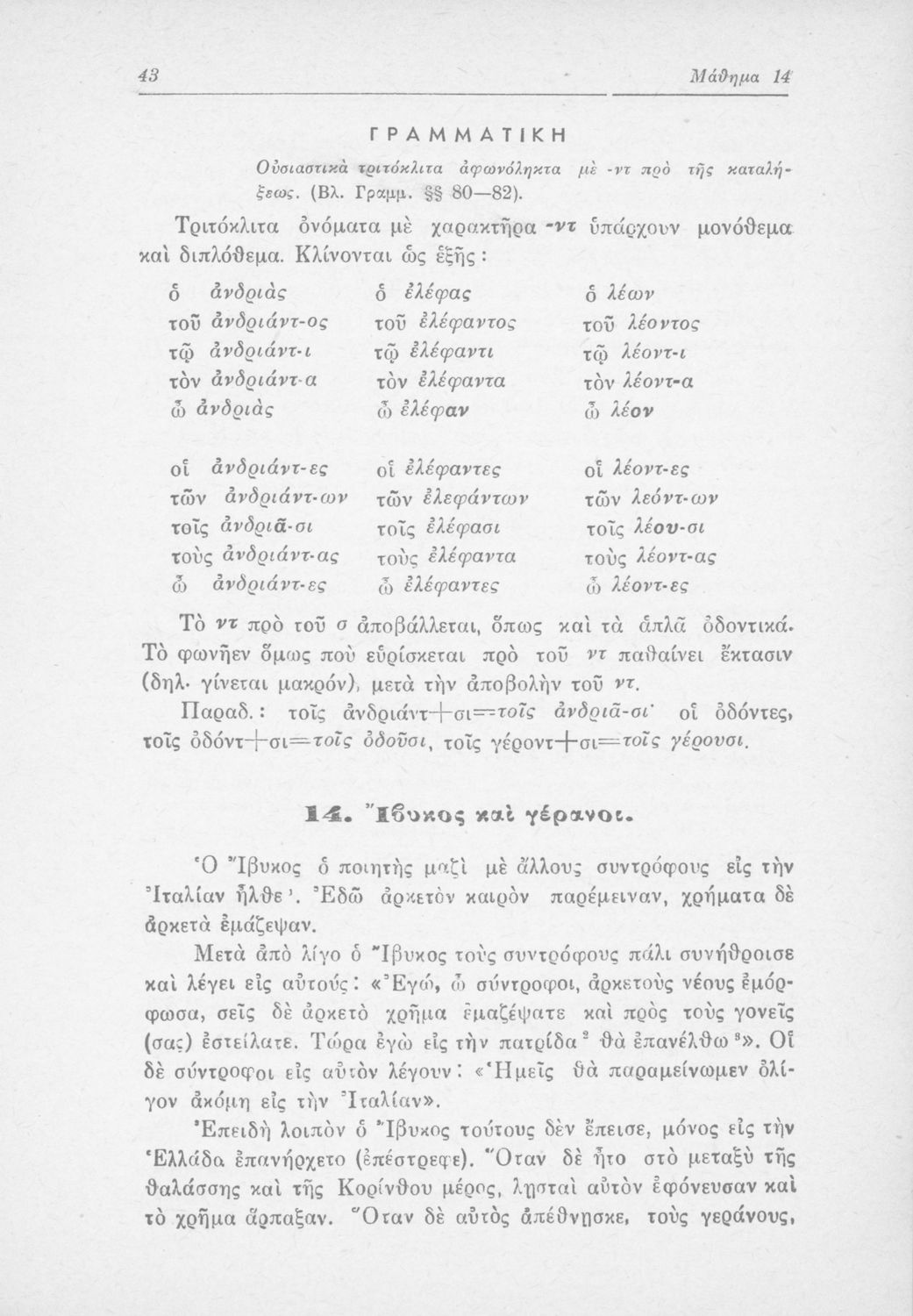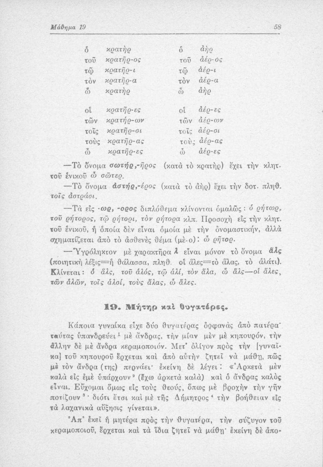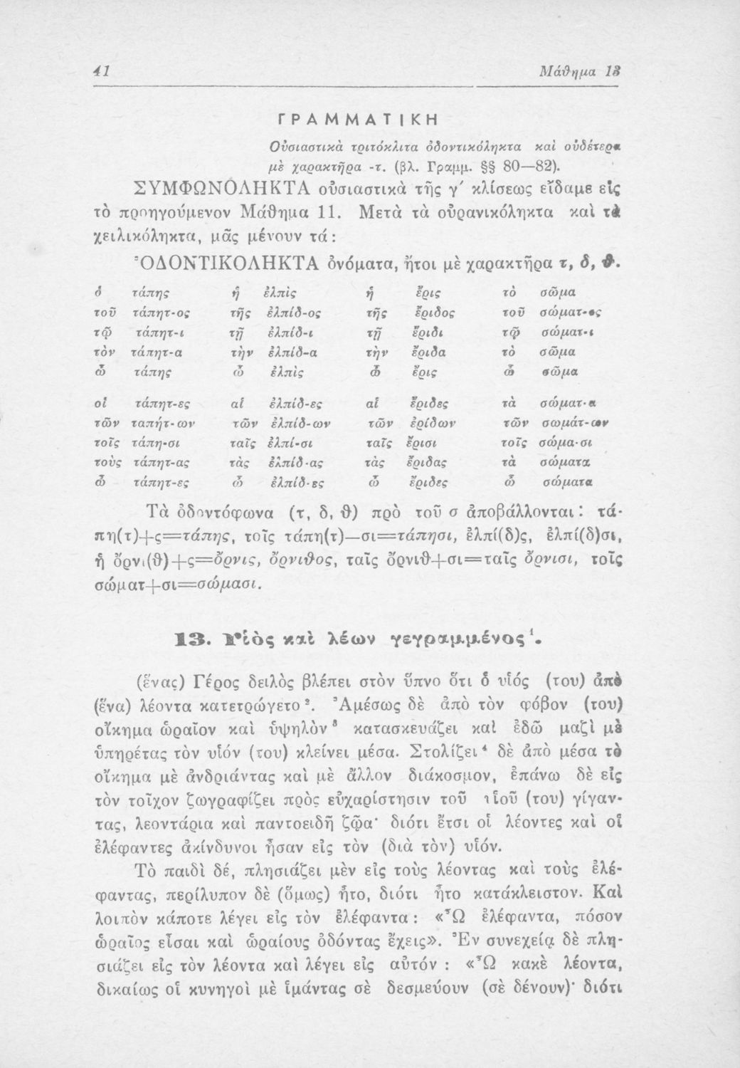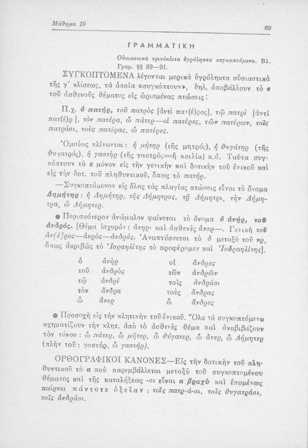 Σχολικό εγχειρίδιο Αρχαίων Ελληνικών Γυμνασίου που εξετάζει τα μέρη του λόγου και την σύνταξή τους.