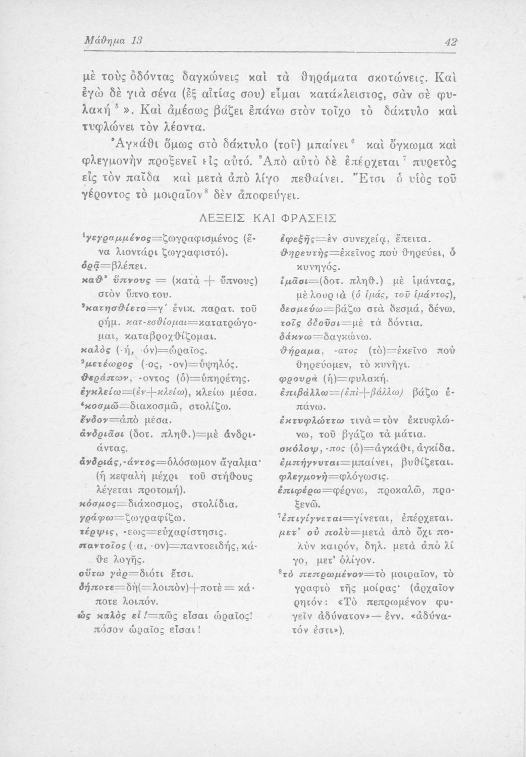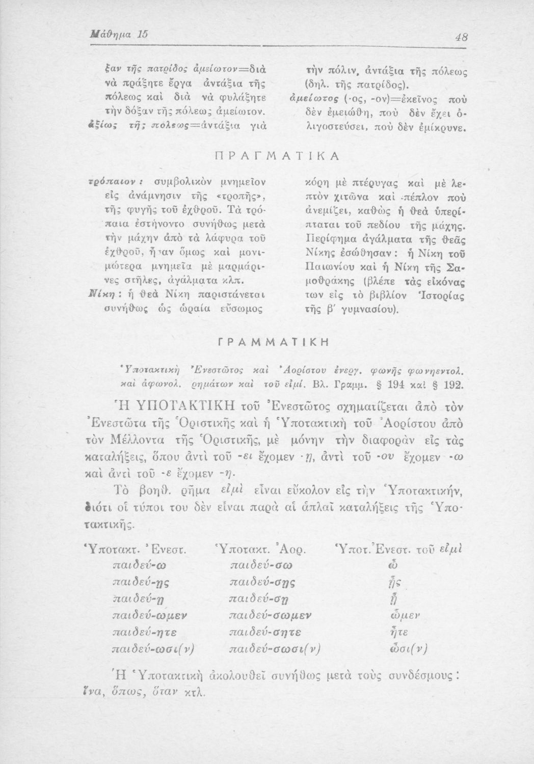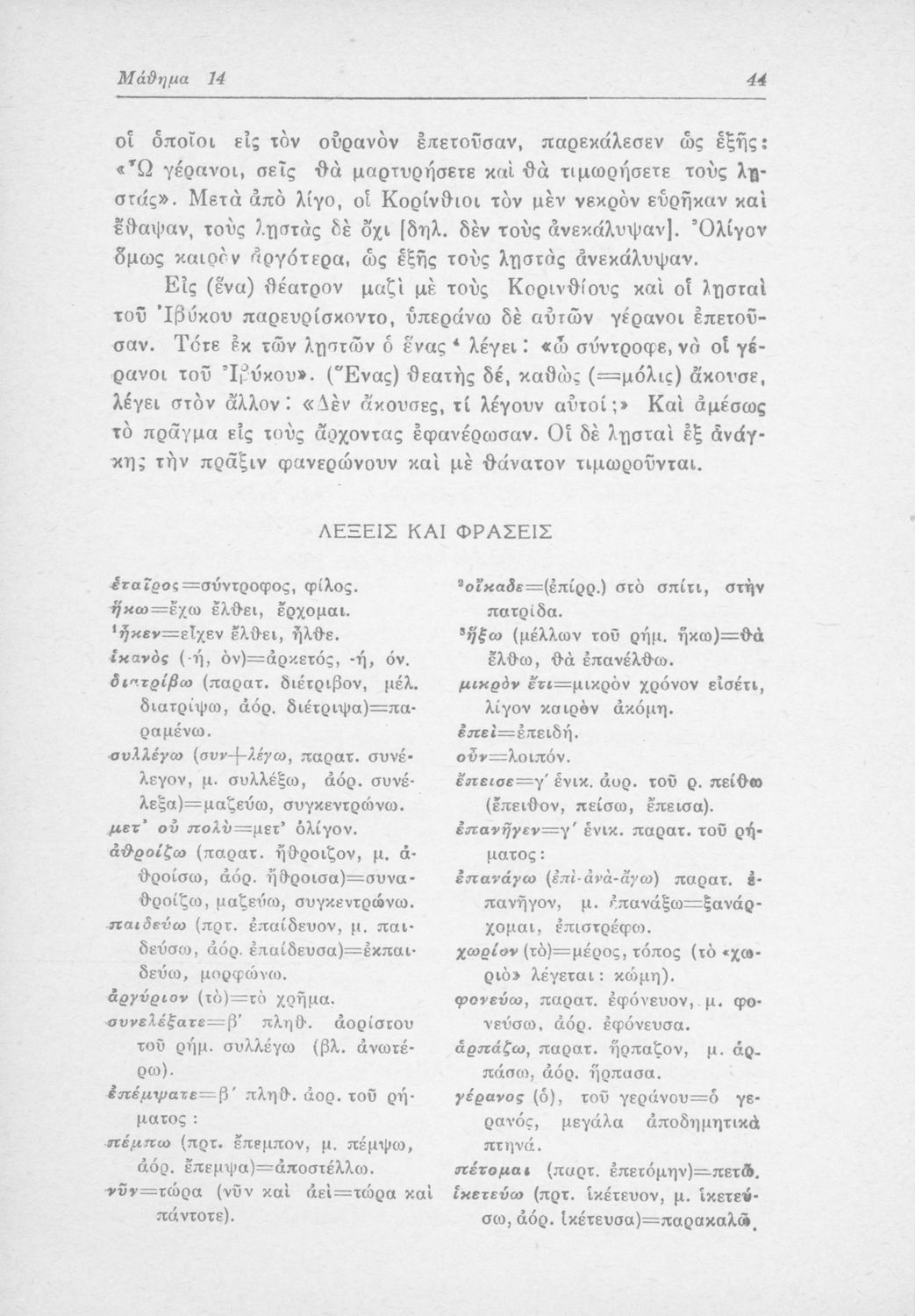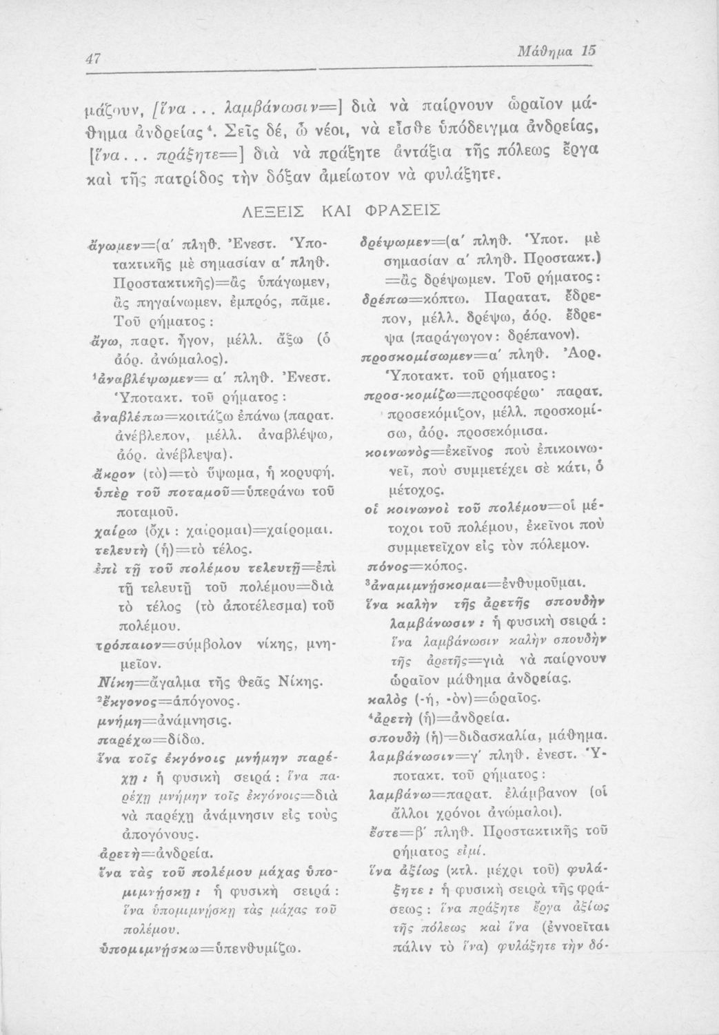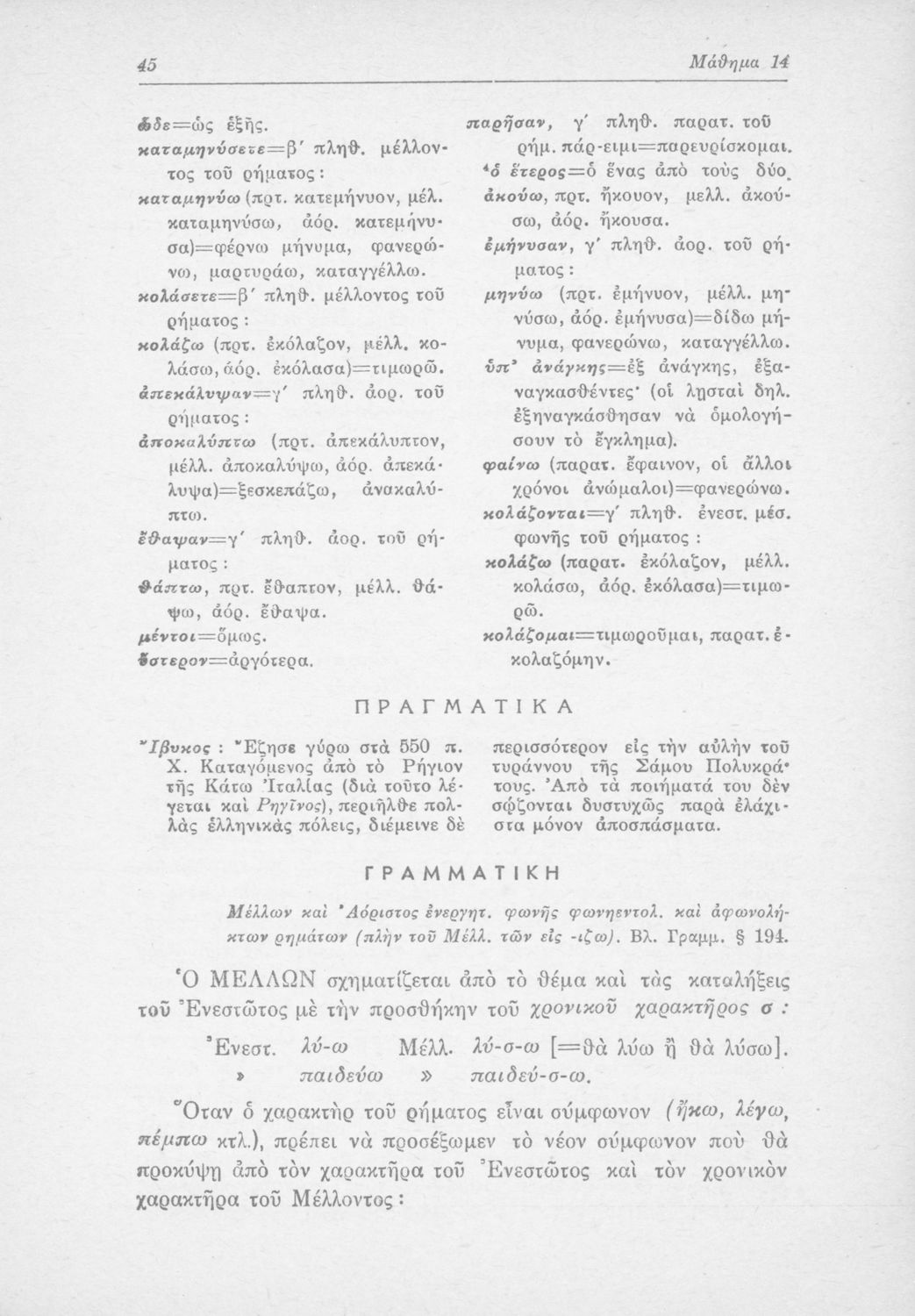 Μαθητικό βοήθημα για το μάθημα των Αρχαίων Ελληνικών στο Γυμνάσιο. Περιέχει ανάλυση των συντακτικών και γραμματικών φαινομένων της αρχαίας ελληνικής γλώσσας. Η δομή του βιβλίου διαρθρώνεται ανά διδακτική ενότητα.