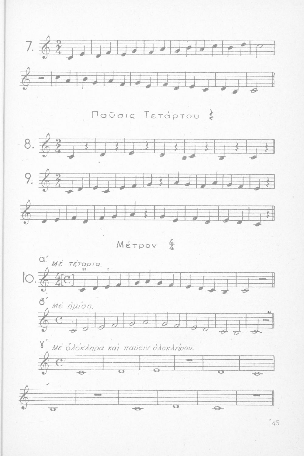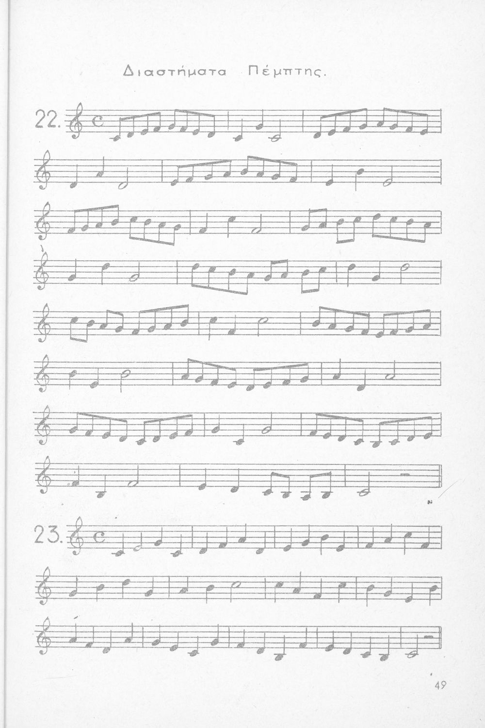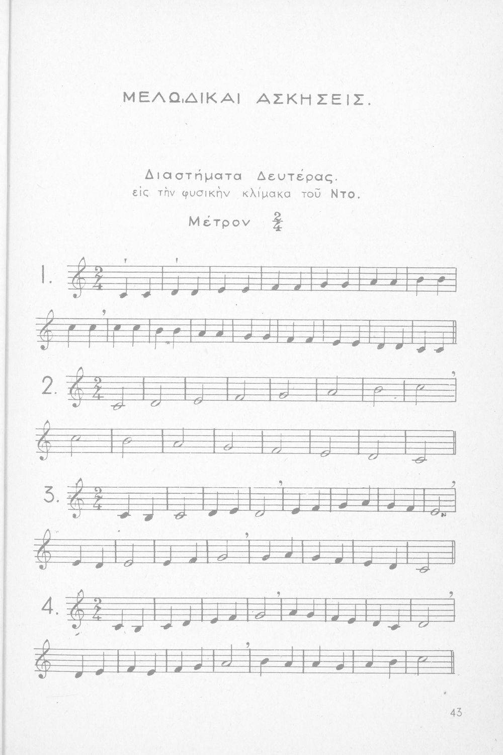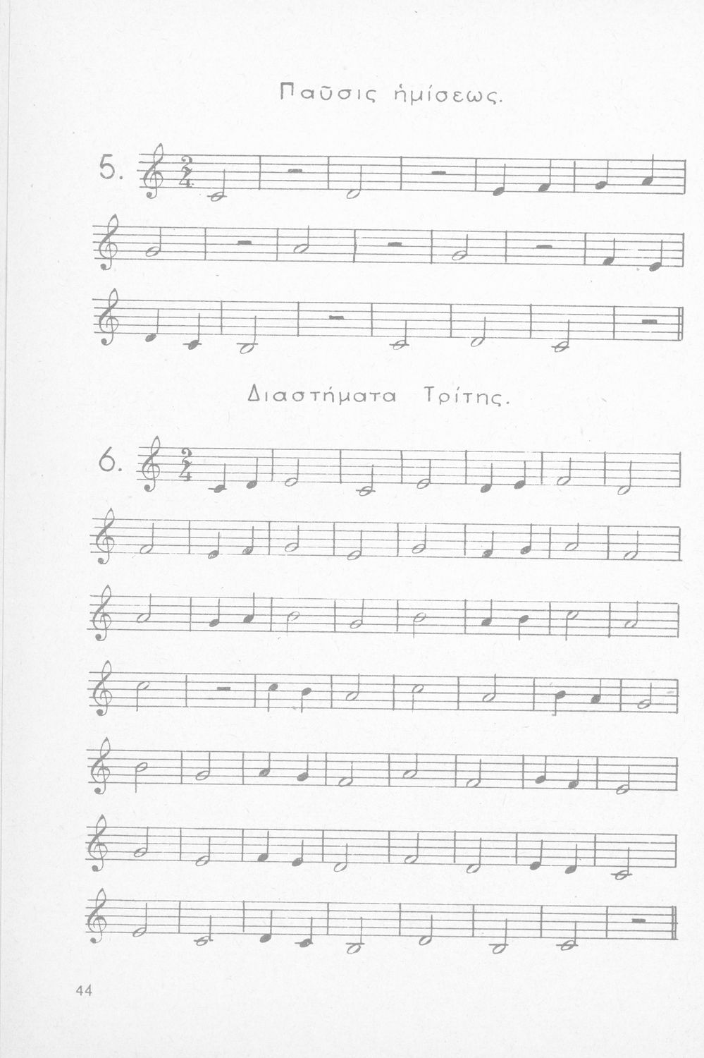 Σχολικό εγχειρίδιο Μουσικής για Γυμνάσια, Παρθεναγωγεία και Διδασκαλεία. Περιέχει ασκήσεις μελωδικές, χωρίς θεωρία.