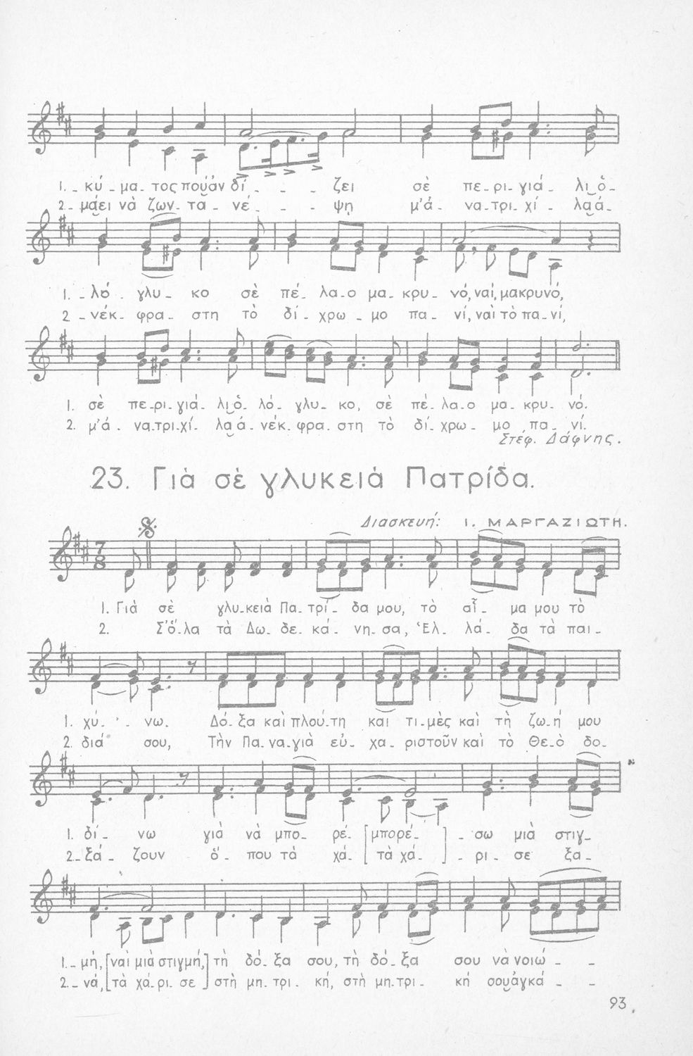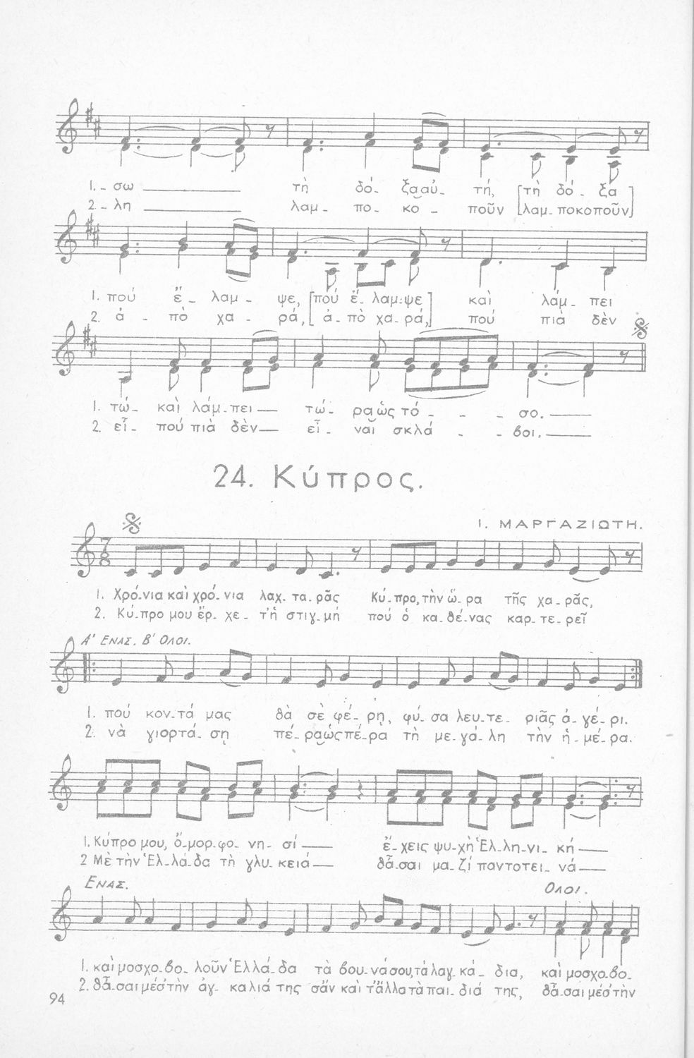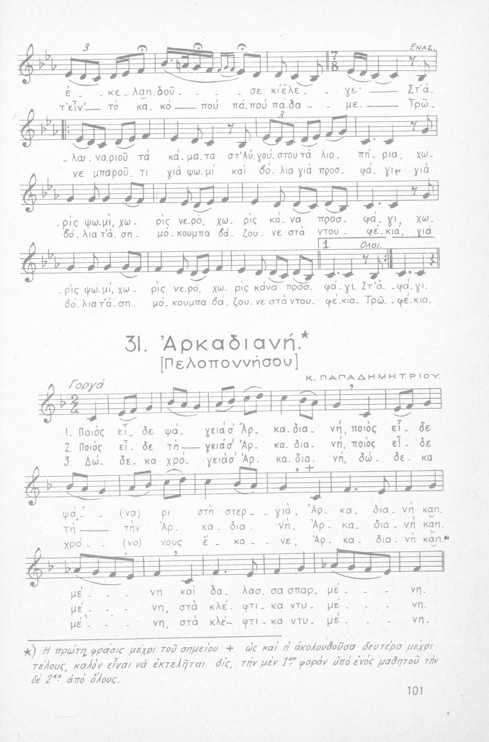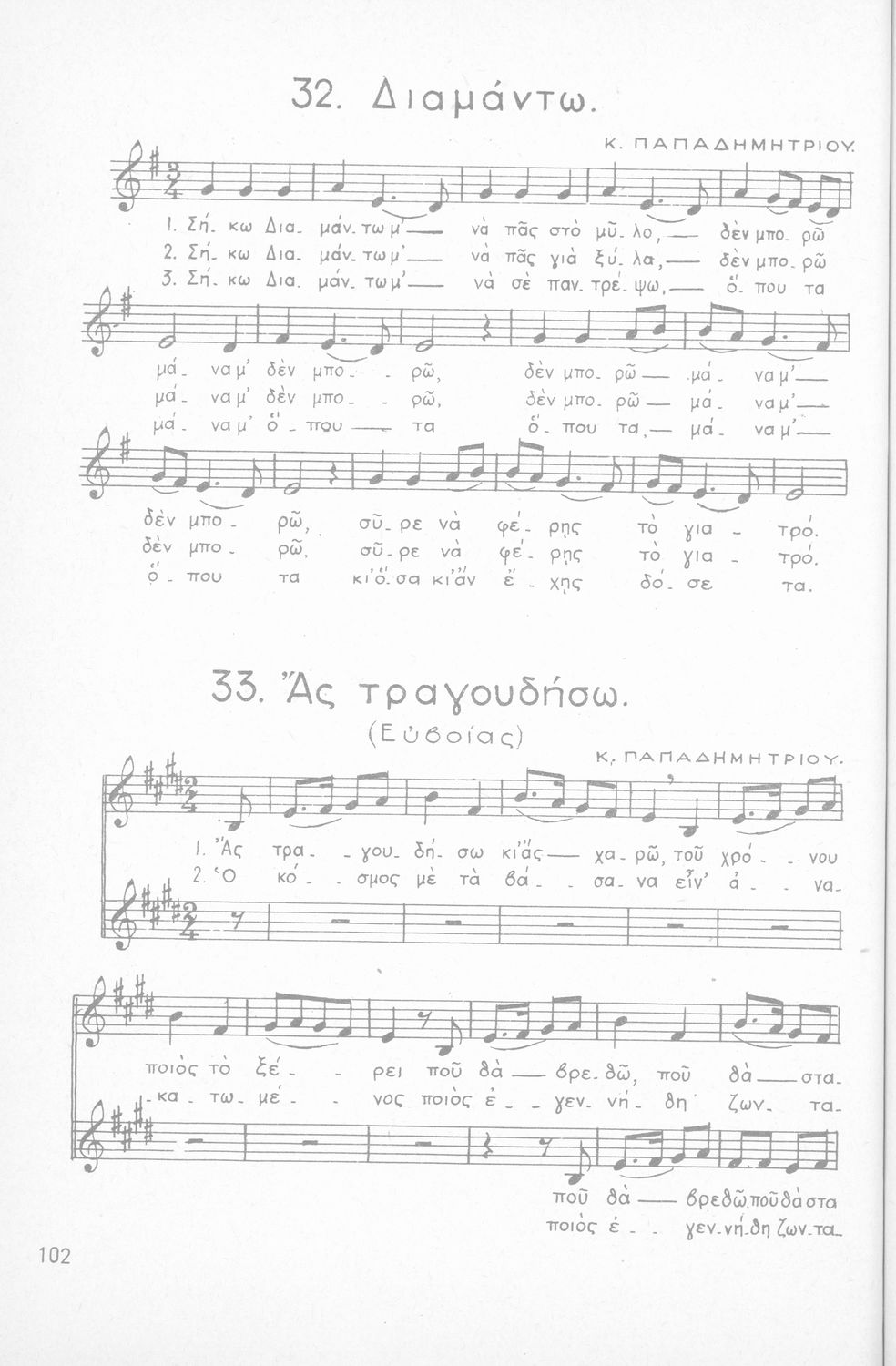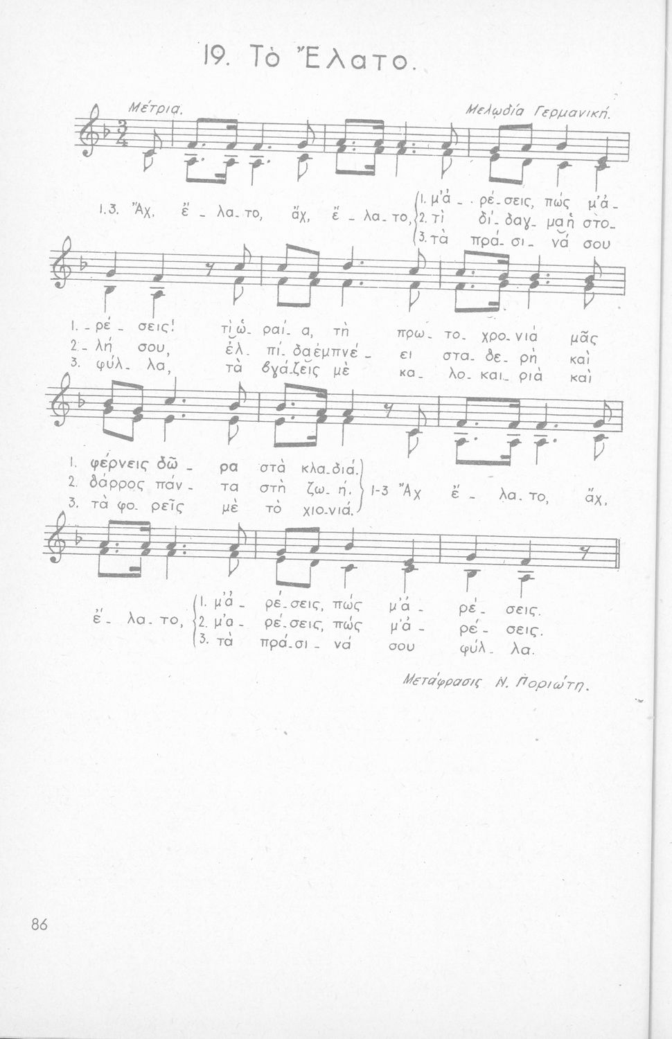 Σχολικό εγχειρίδιο Μουσικής για Γυμνάσια, Παρθεναγωγεία και Διδασκαλεία. Περιέχει ασκήσεις μελωδικές, χωρίς θεωρία.