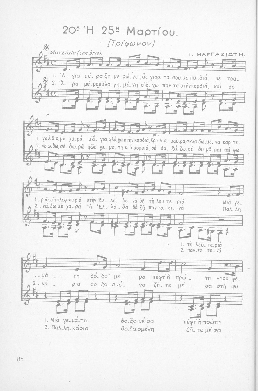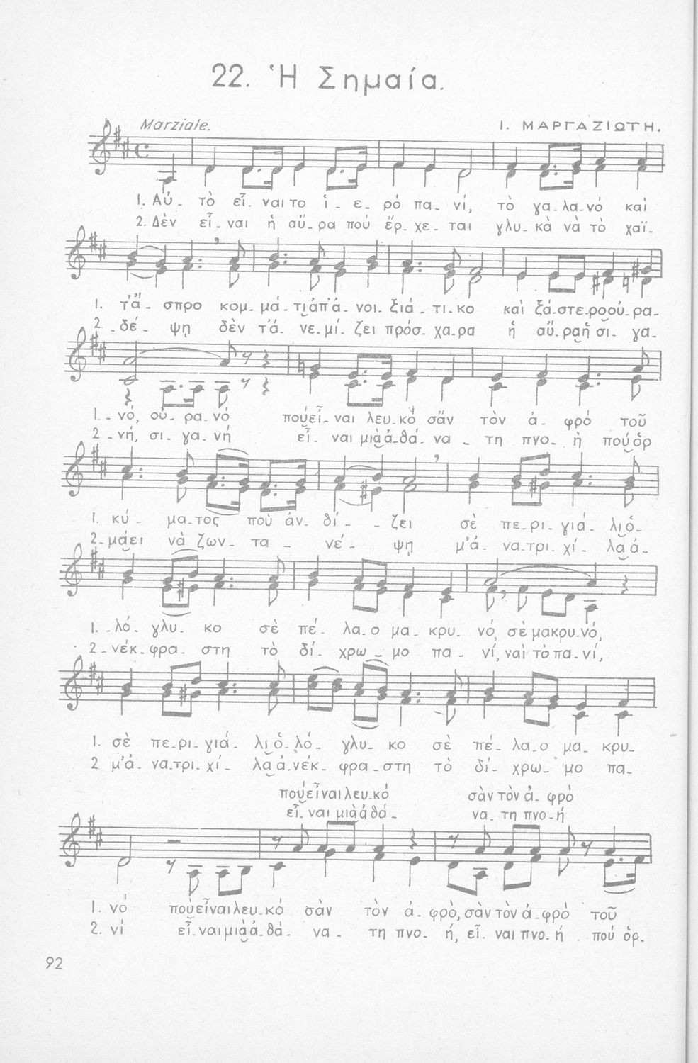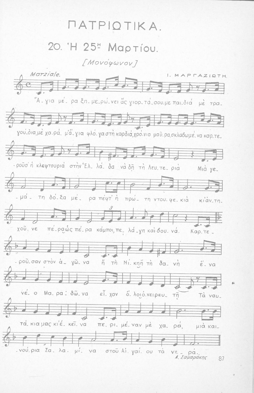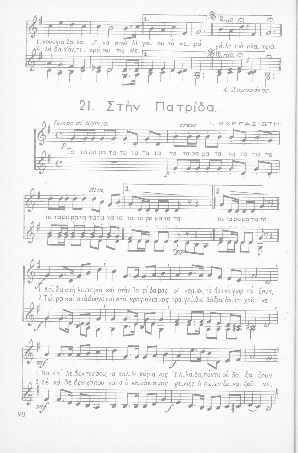 Παρουσίαση περιεχομένου: Σχολικό εγχειρίδιο Μουσικής για Γυμνάσια, Παρθεναγωγεία και Διδασκαλεία που περιέχει ασκήσεις μελωδίας χωρίς θεωρία. Ο Ι. Μαργαζιώτης υπήρξε καθηγητής της Βαρβακείου Προτύπου Σχολής Διδασκαλείου Μ. Ε., του Ωδείου Αθηνών και του Πανεπιστημίου Αθηνών στη μετεκπαίδευση των Δημοδιδασκάλων.