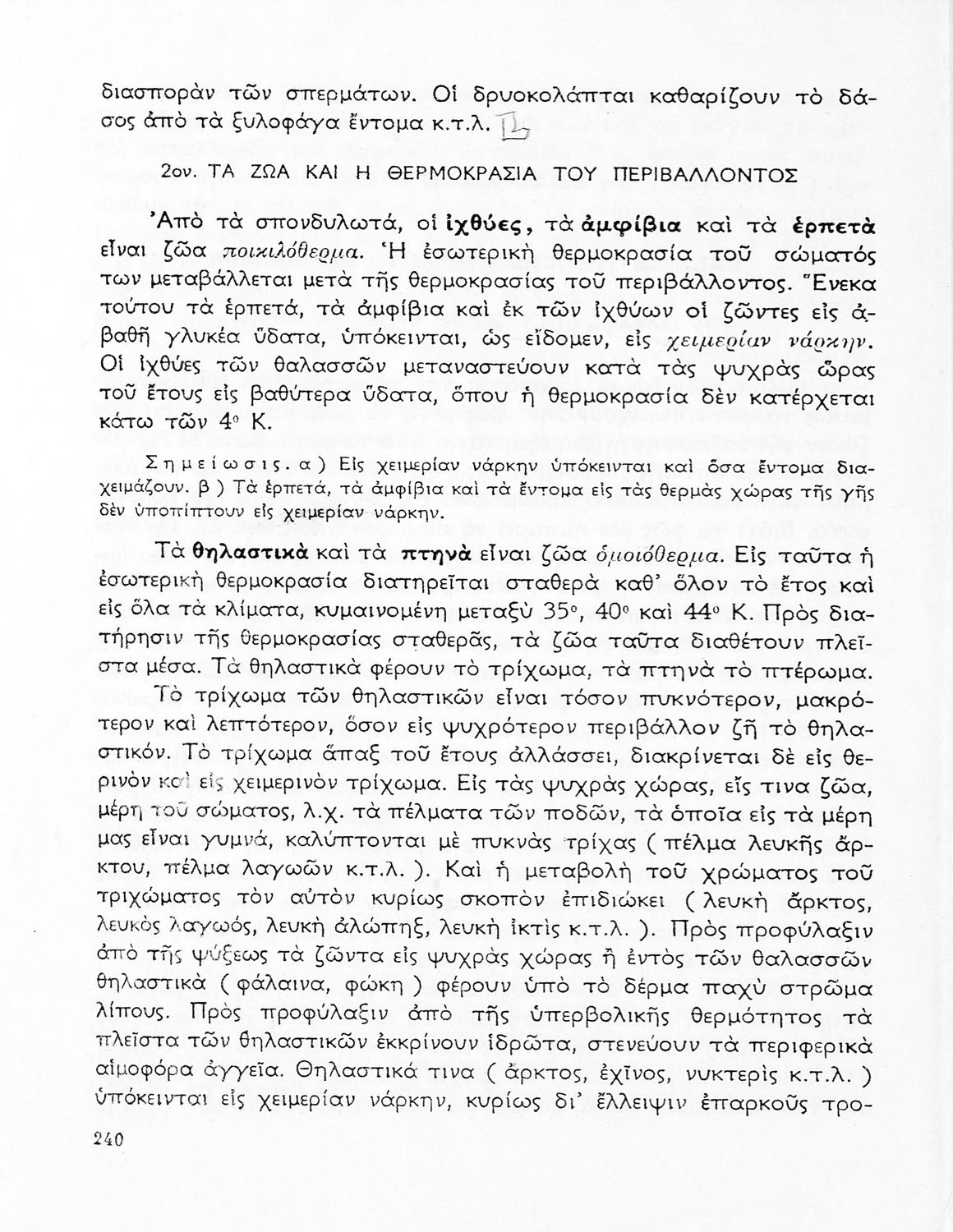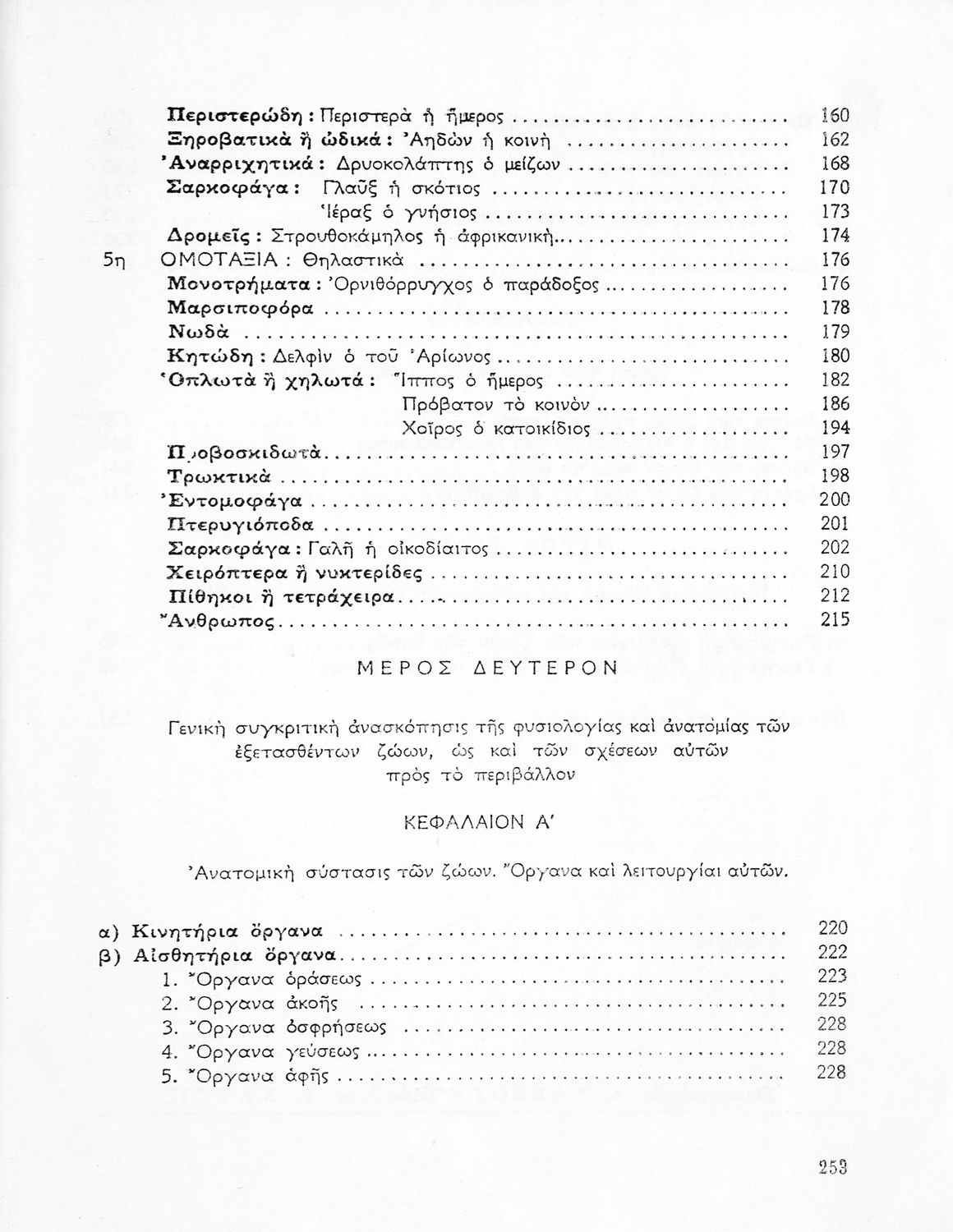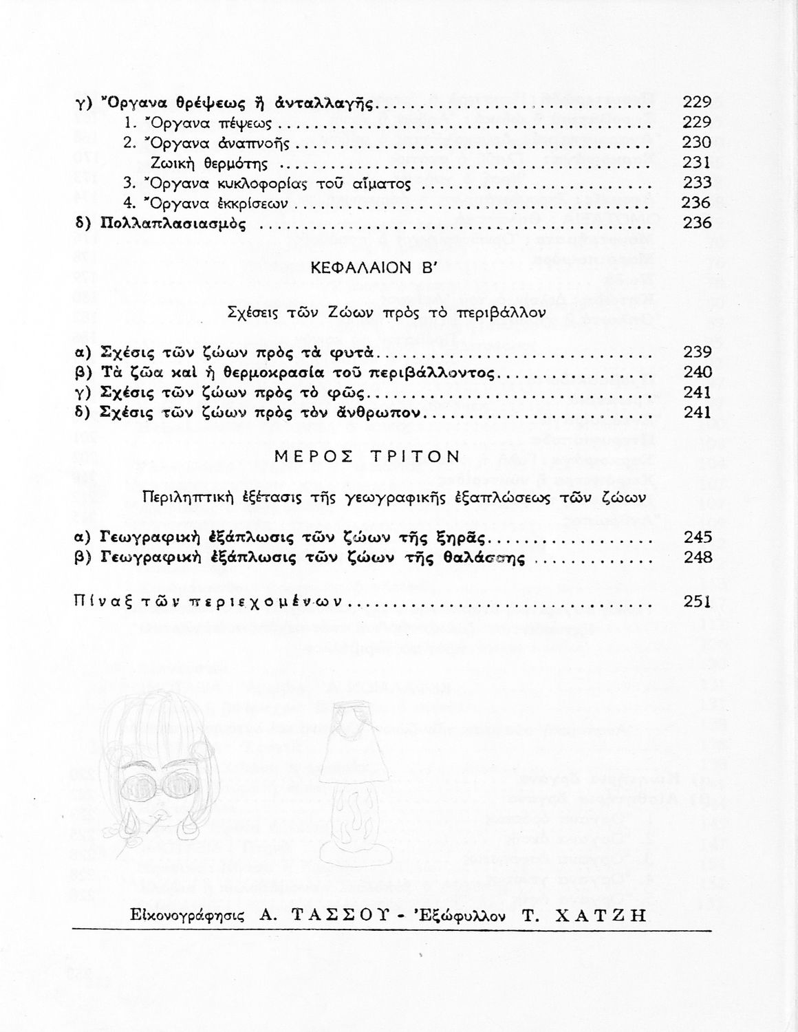 Σχολικό εγχειρίδιο Ζωολογίας Α΄ Γυμνασίου που εστιάζει στη φυσιολογία και ανατομία και παρουσιάζει τα διάφορα ζώα ανάλογα με την συνομοταξία στην οποία ανήκουν. Φέρει το σύμβολο της δικτατορίας.