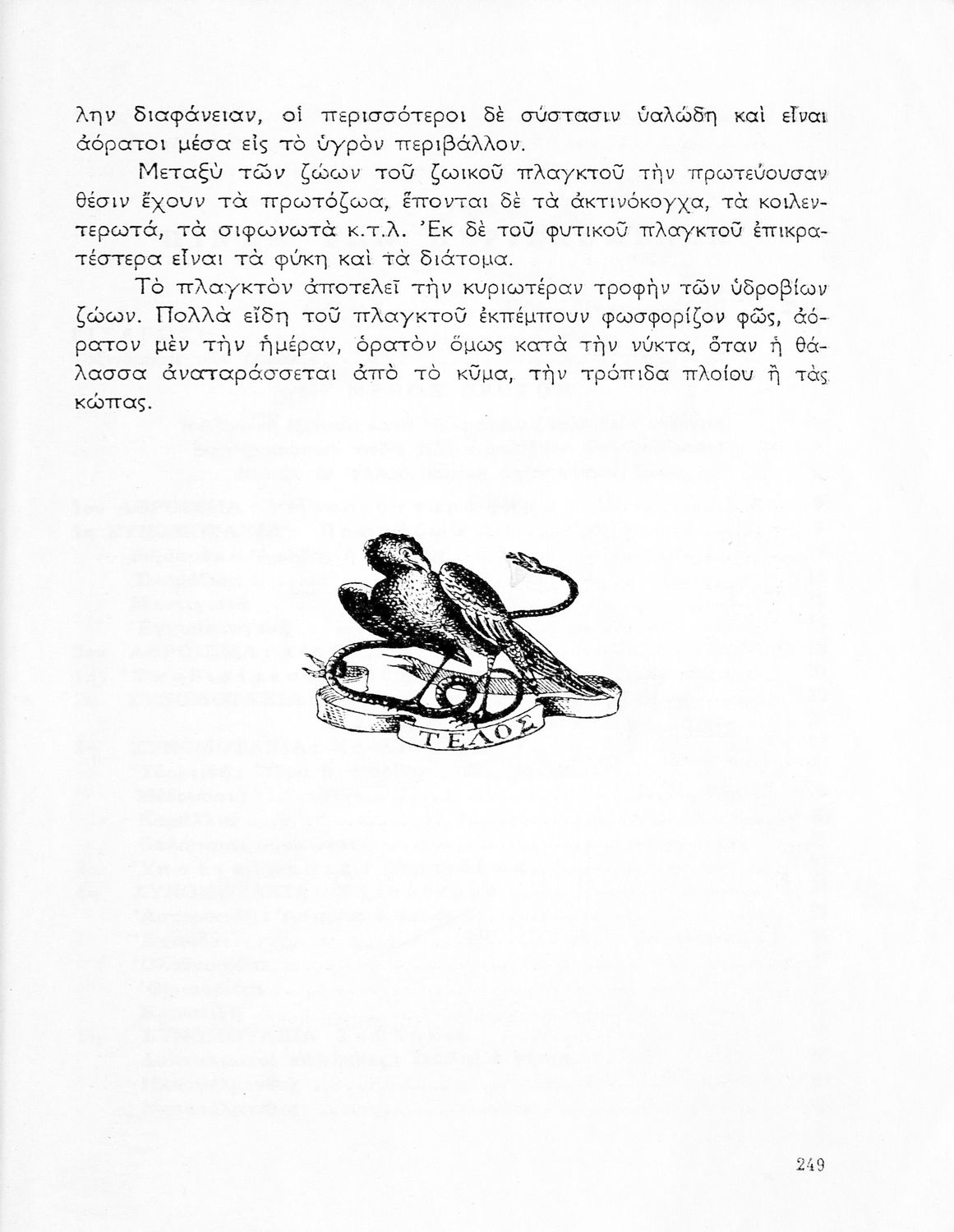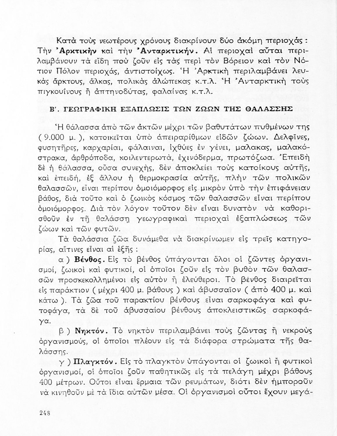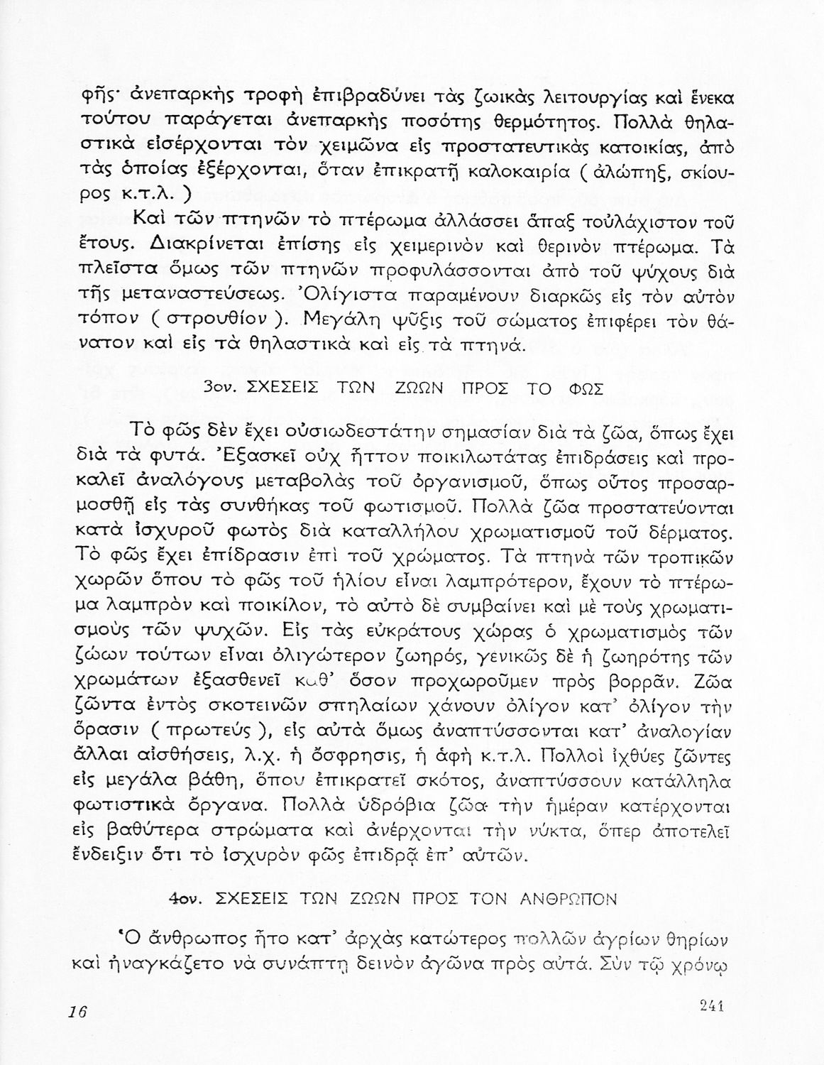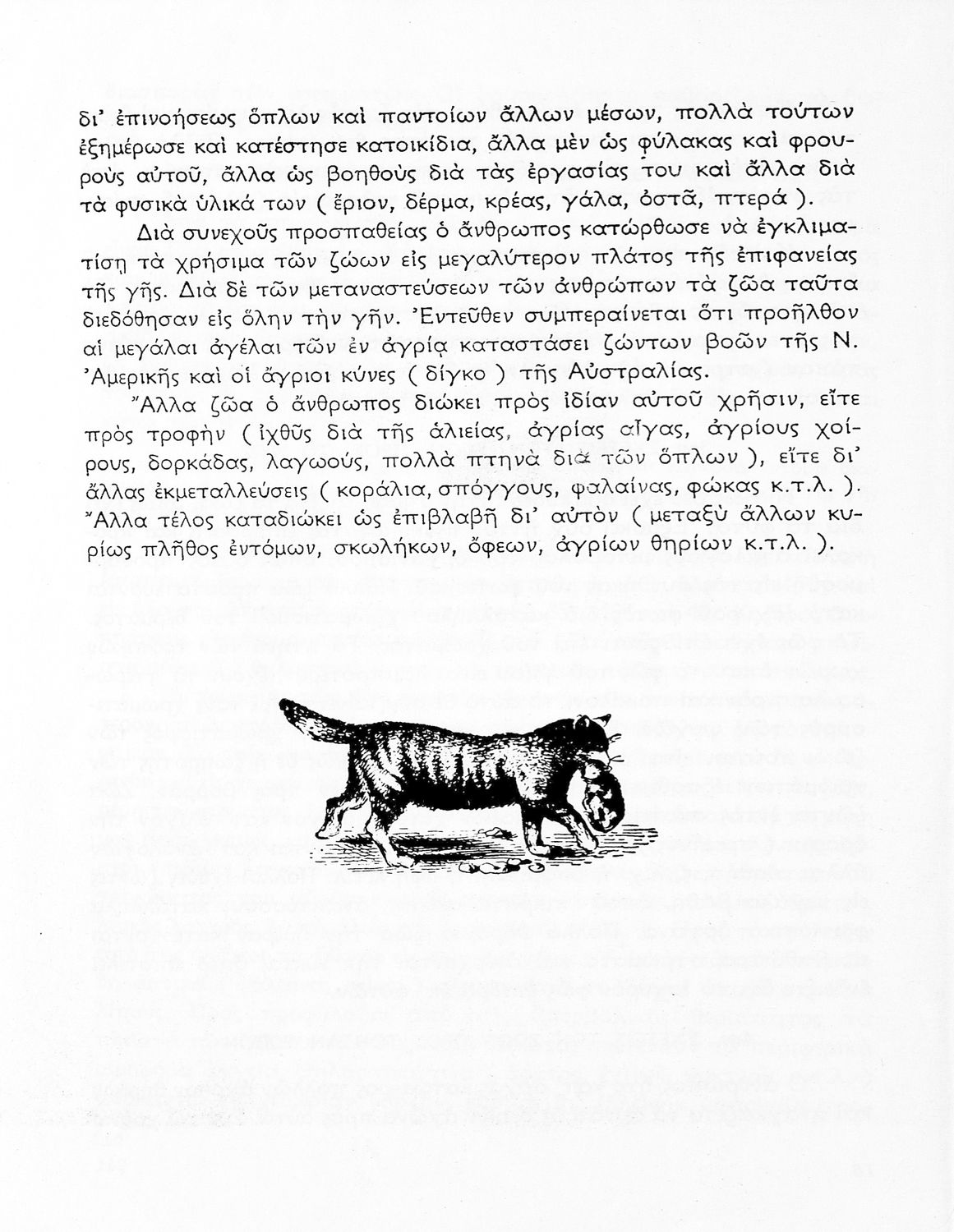 Σχολικό εγχειρίδιο Ζωολογίας Α΄ Γυμνασίου που εστιάζει στη φυσιολογία και ανατομία και παρουσιάζει τα διάφορα ζώα ανάλογα με την συνομοταξία στην οποία ανήκουν. Φέρει το σύμβολο της δικτατορίας.