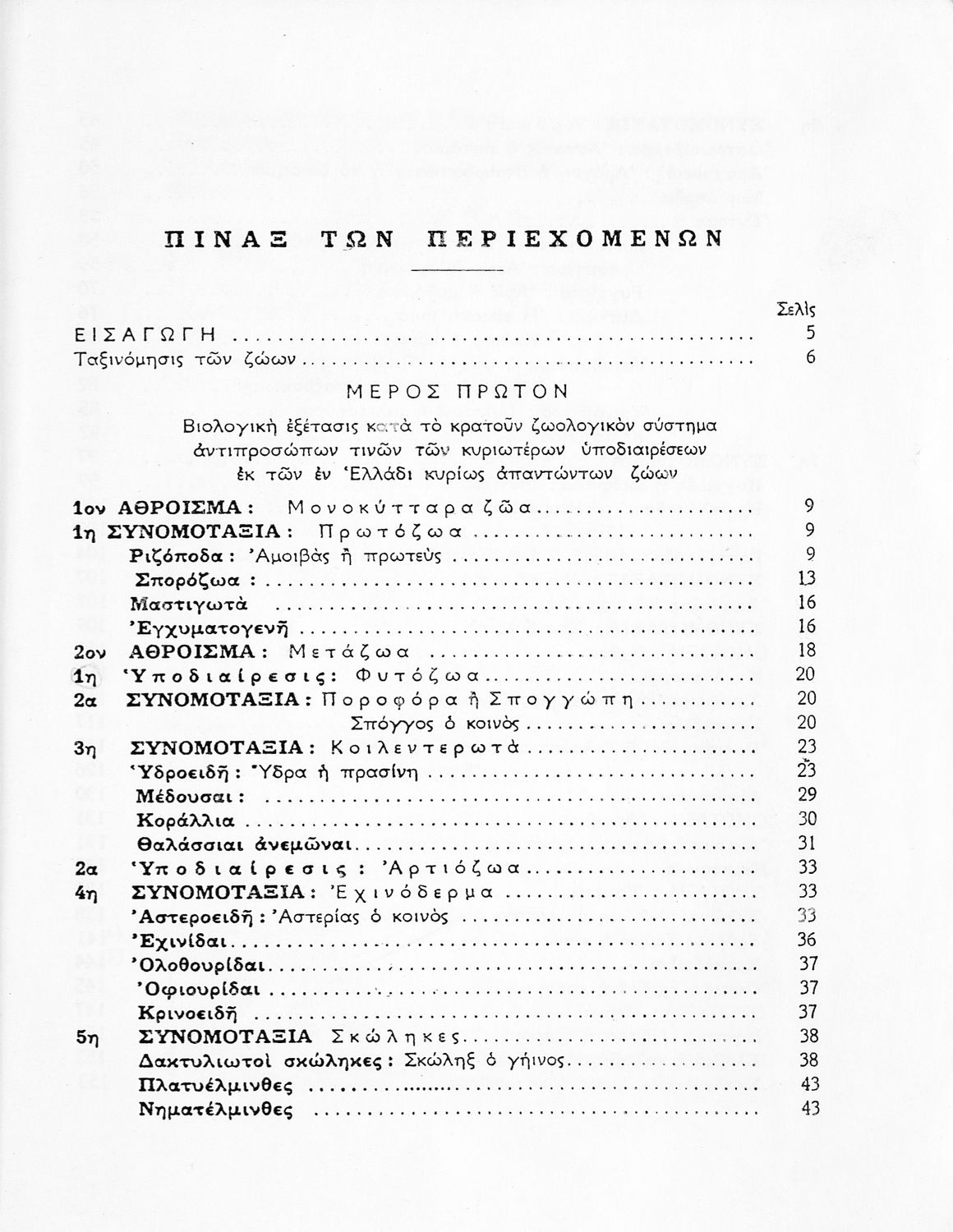 Σχολικό εγχειρίδιο Ζωολογίας για την Γ΄ τάξη των Εξαταξίων Γυμνασίων που παρουσιάζει τα διάφορα ζώα ανάλογα με την συνομοταξία στην οποία ανήκουν.