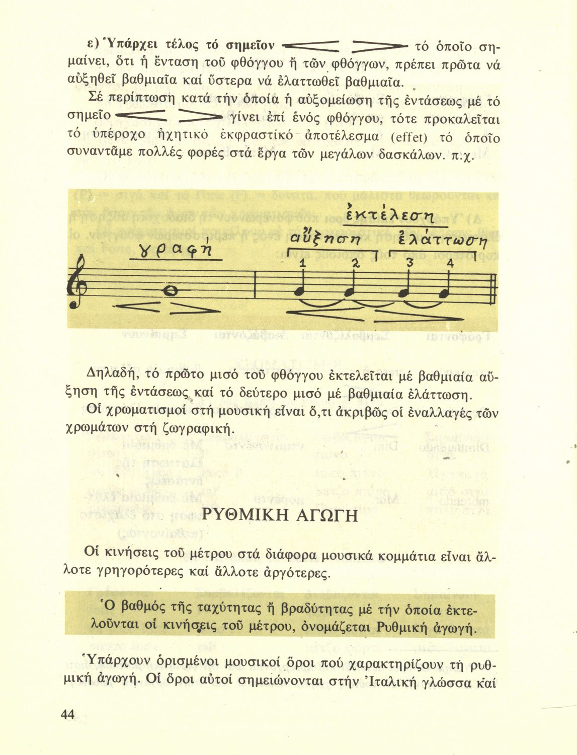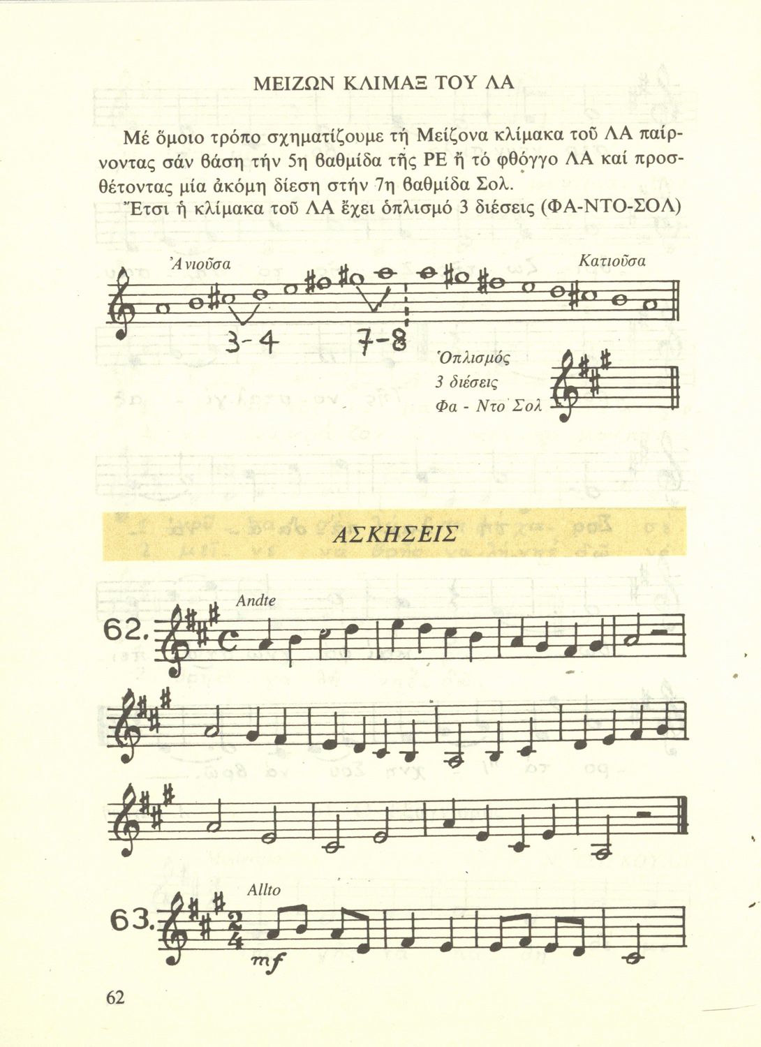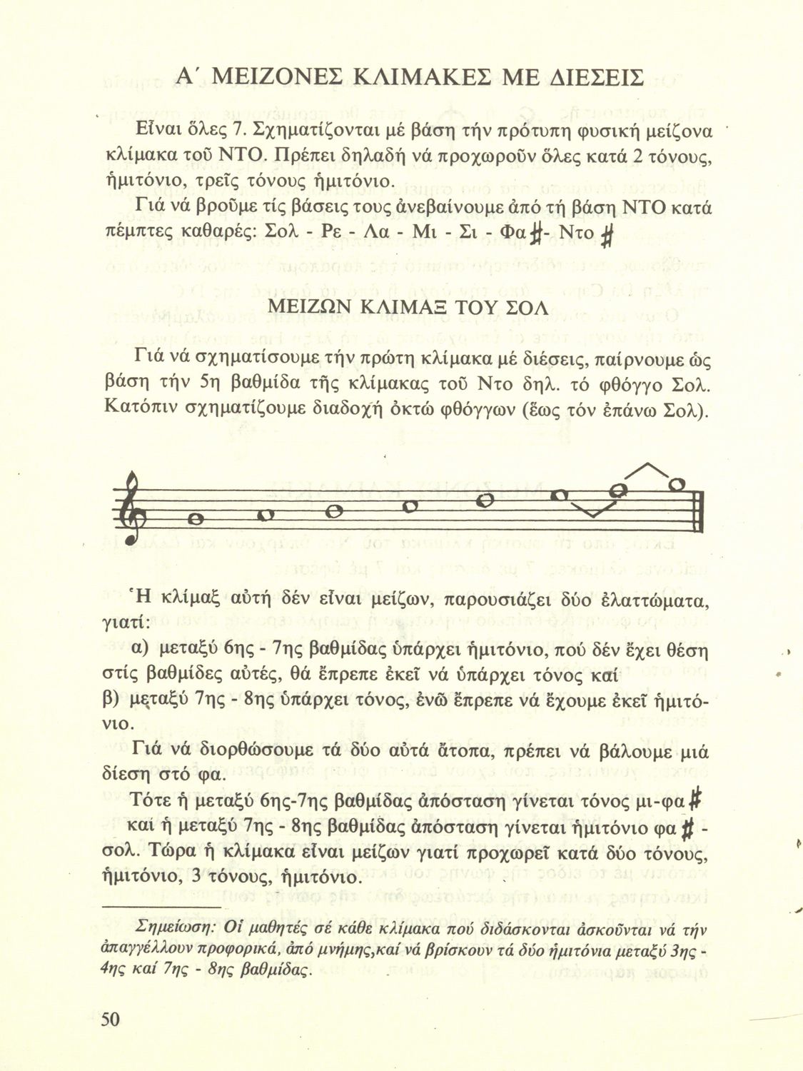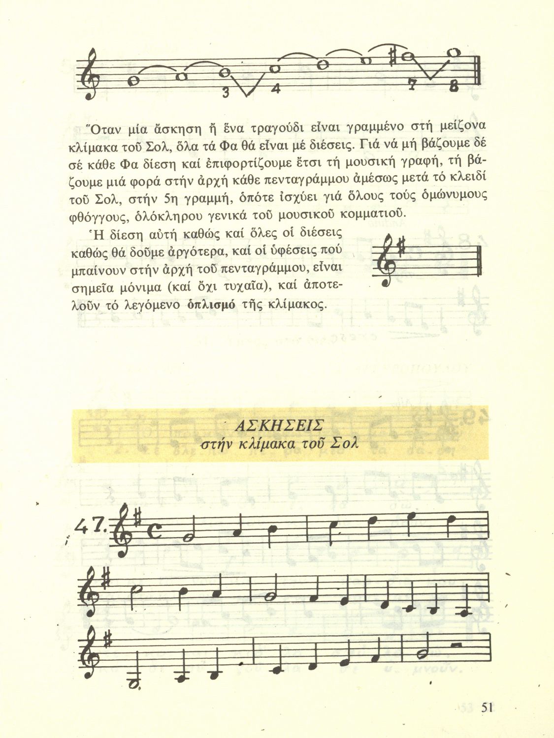 Σχολικό εγχειρίδιο Μουσικής για την Β' τάξη Εξαταξίων και Γ', Δ' τάξη Οκταταξίων σχολείων Μέσης Εκπαιδεύσεως. Περιέχει μείζονες κλίμακες και αλλοιωμένους φθόγγους, μελωδικές ασκήσεις και δίφωνες μελωδικές ...