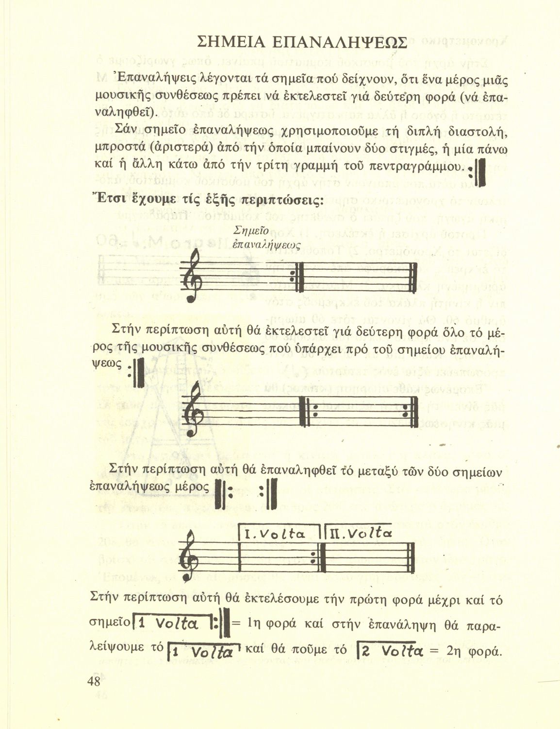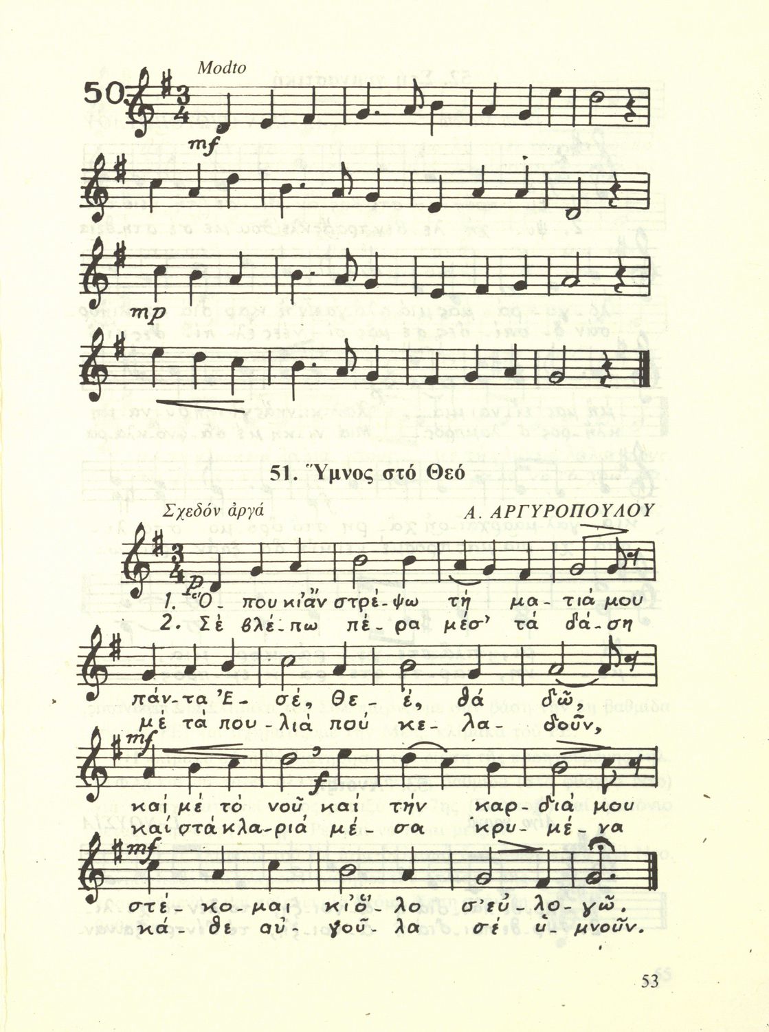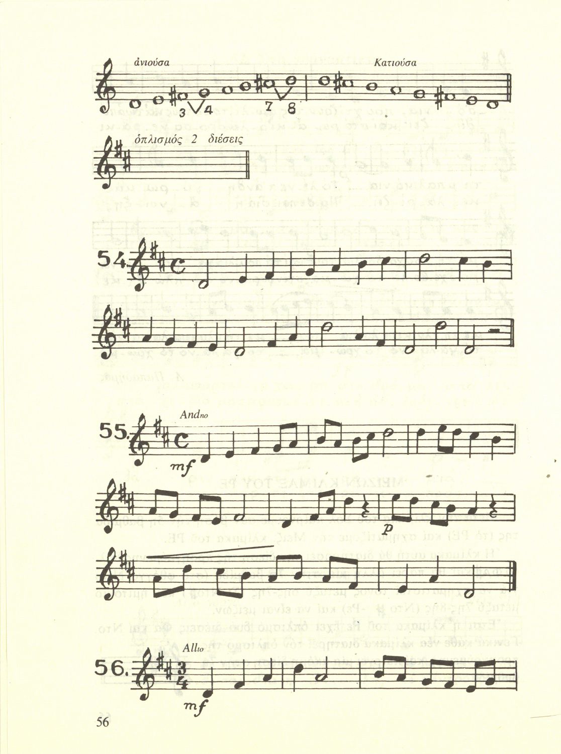 Σχολικό εγχειρίδιο Μουσικής για την Β' τάξη Εξαταξίων και Γ', Δ' τάξη Οκταταξίων σχολείων Μέσης Εκπαιδεύσεως. Περιέχει μείζονες κλίμακες και αλλοιωμένους φθόγγους, μελωδικές ασκήσεις και δίφωνες μελωδικές ...