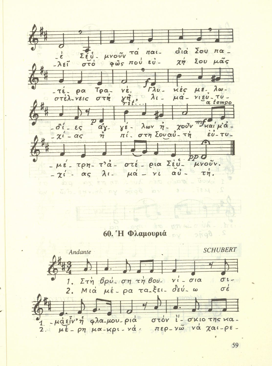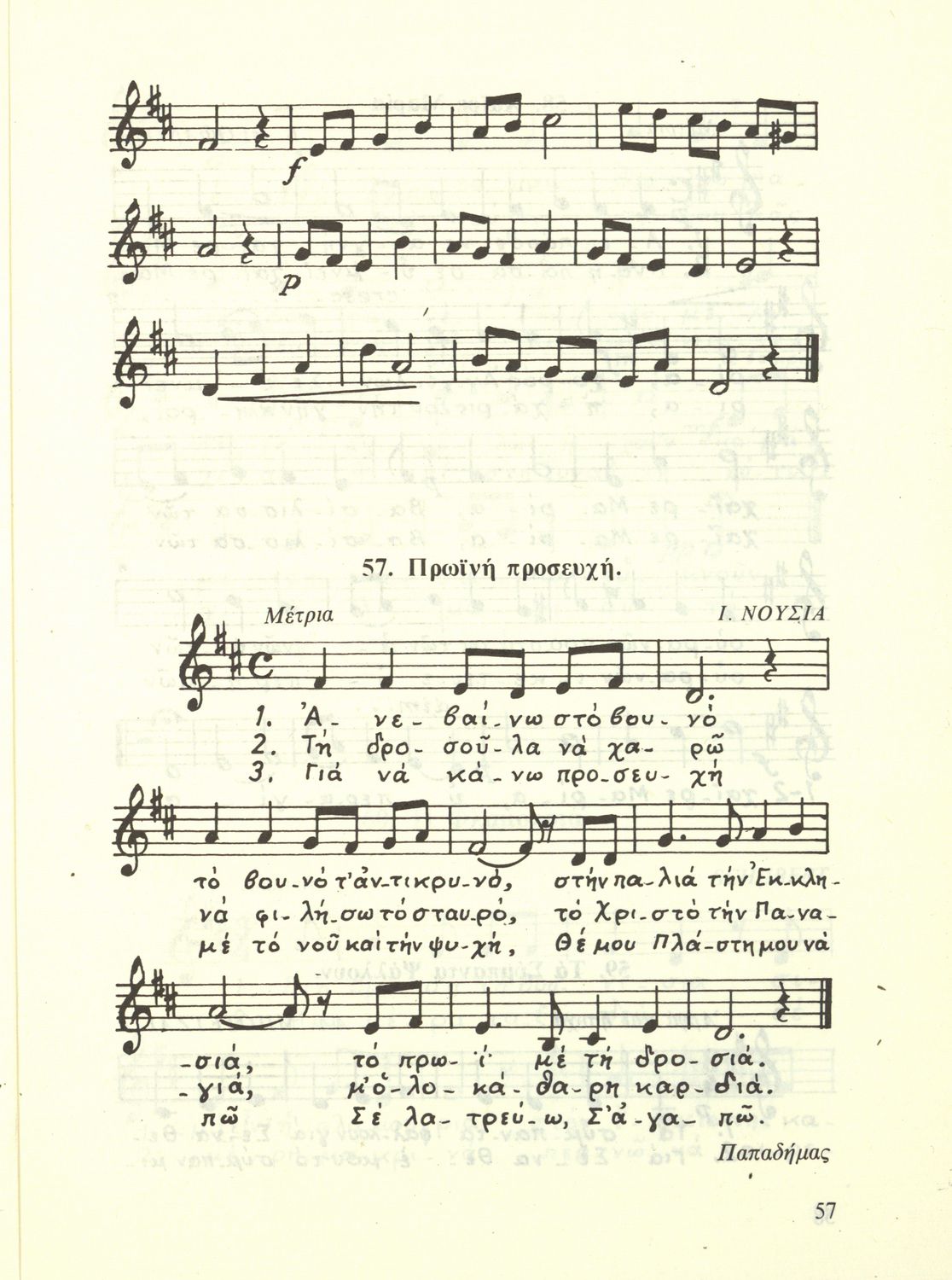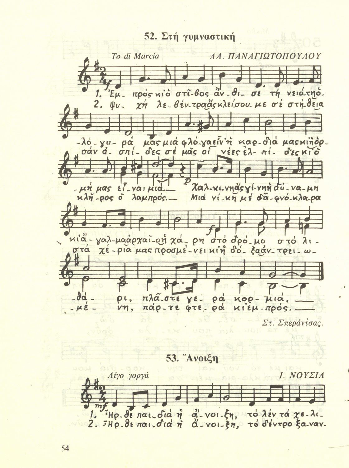 Σχολικό εγχειρίδιο Μουσικής για την Α', Β', Γ΄, Δ' τάξη Γυμνασίου, Πρακτικών Λυκείων και Διδασκαλείων. Περιέχει ασκήσεις μελωδικές, χωρίς θεωρία.