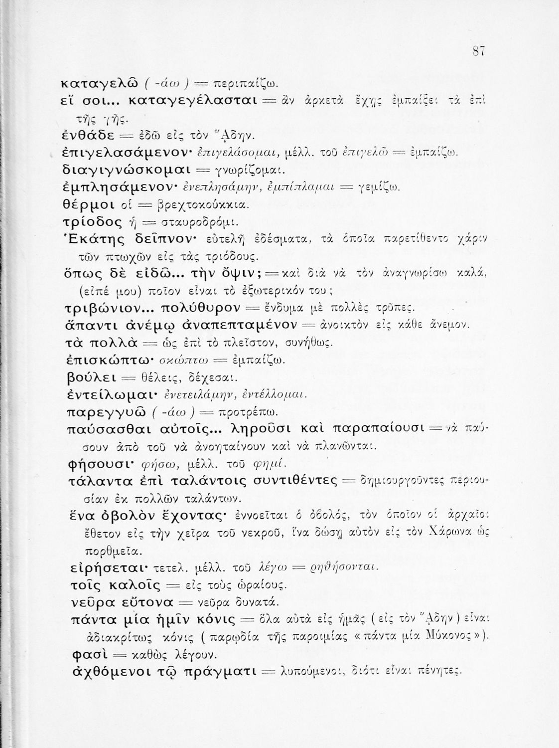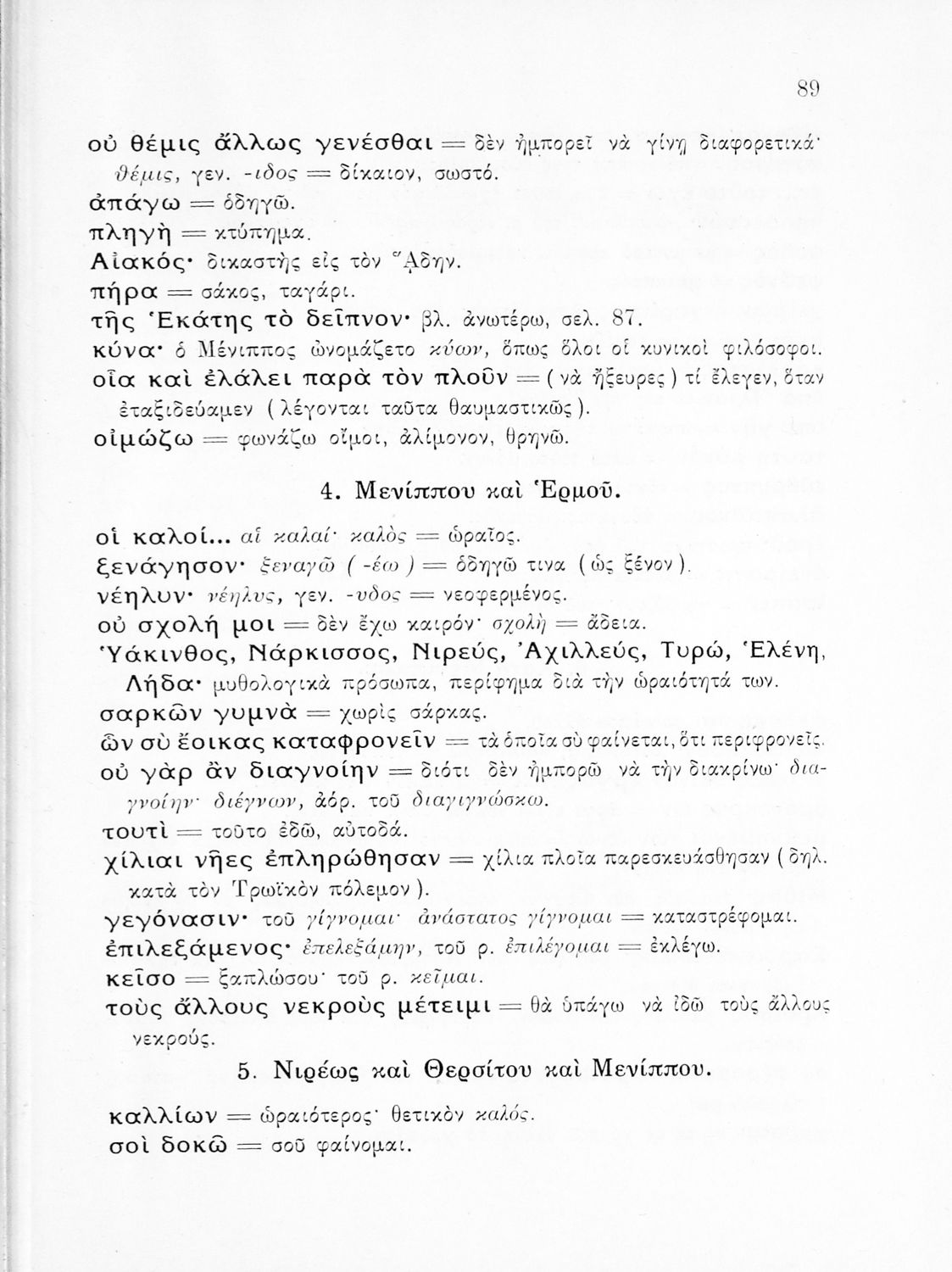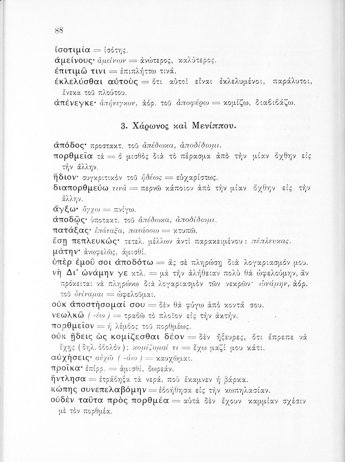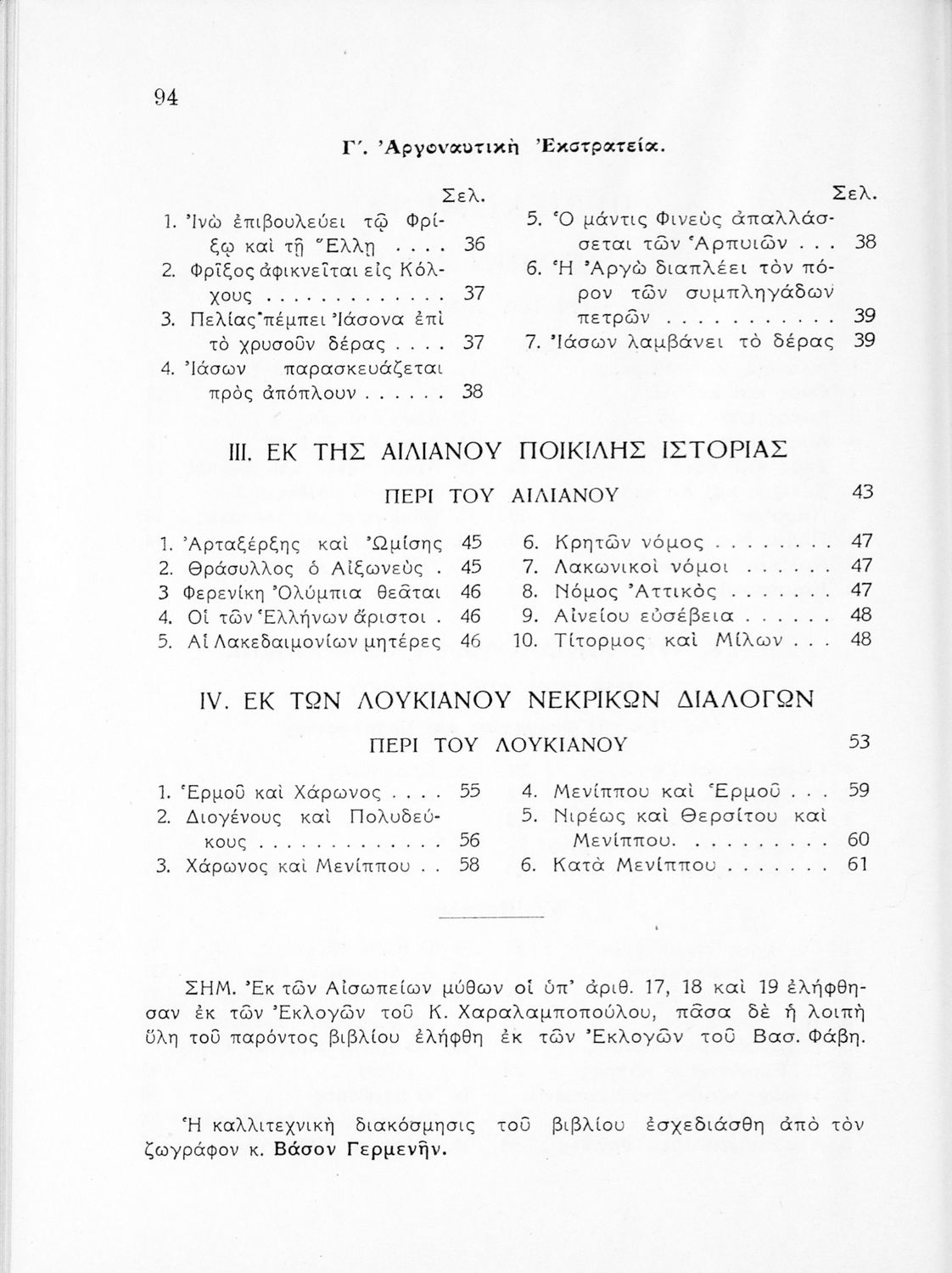 Σχολικό εγχειρίδιο Αρχαίων Ελληνικών Β΄ και Γ΄ Γυμνασίου και Αστικού Σχολείου που περιέχει αποσπάσματα από έργα αρχαίων Ελλήνων συγγραφέων, ερμηνευτικά και πραγματολογικά σχόλια και γραμματικές παρατηρήσεις.