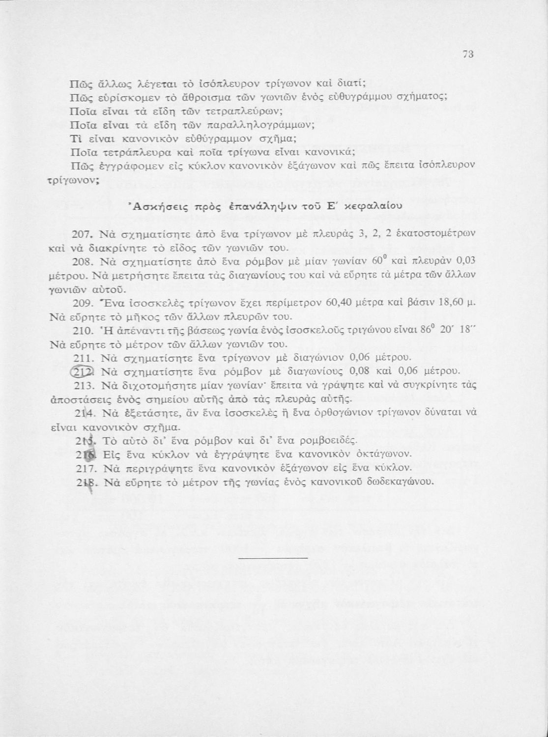 Σχολικό εγχειρίδιο Γεωμετρίας για τα Γυμνάσια και Αστικά Σχολεία που περιλαμβάνει θεωρία και ασκήσεις και είναι χωρισμένο σε Επιπεδομετρία και Στερεομετρία.