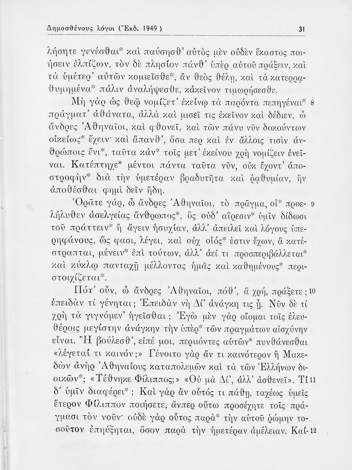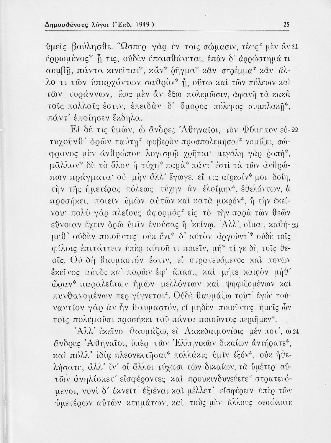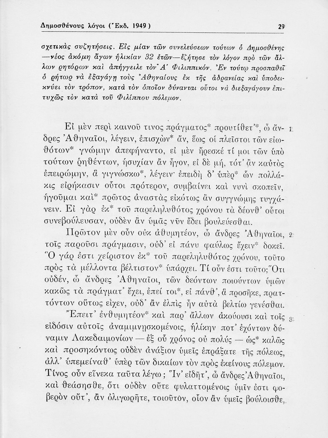 Σχολικό εγχειρίδιο Αρχαίων Ελληνικών Δ΄ Γυμνασίου που περιέχει τους Ολυνθιακούς Α΄ και Β΄ και τους Φιλιππικούς Α΄ και Β' του Δημοσθένη, ερμηνευτικά και πραγματολογικά σχόλια και γραμματικές παρατηρήσεις.