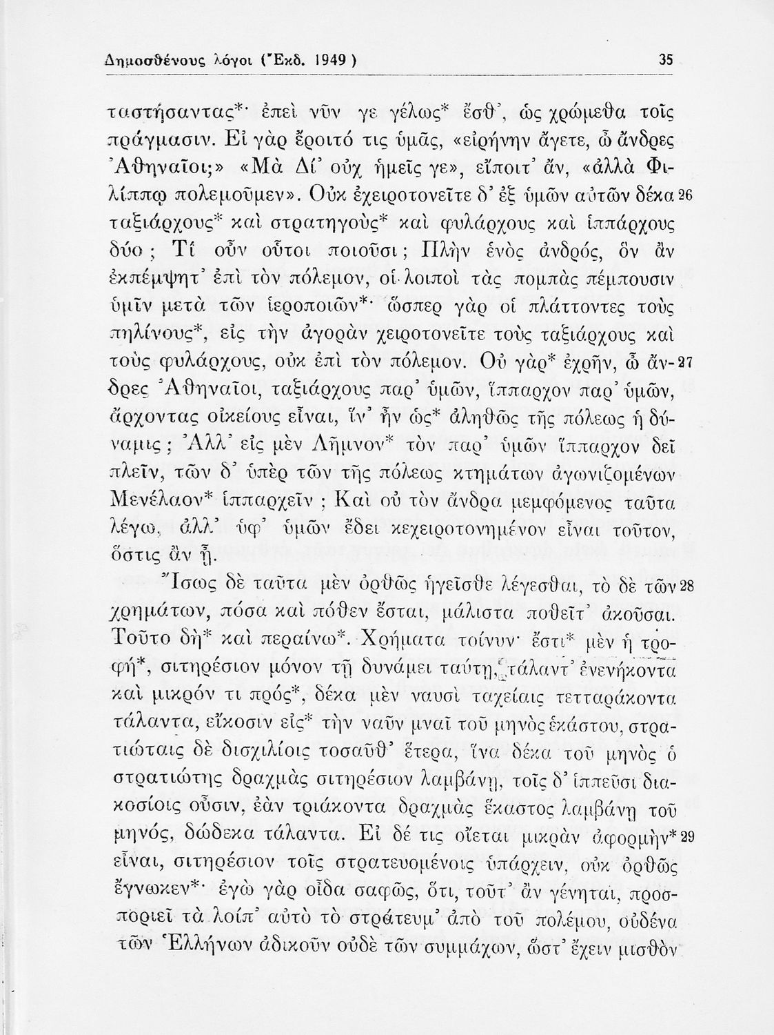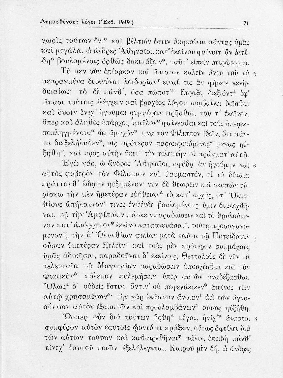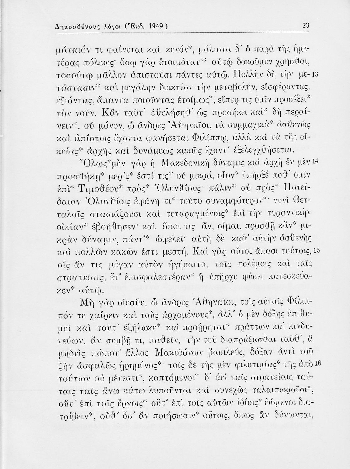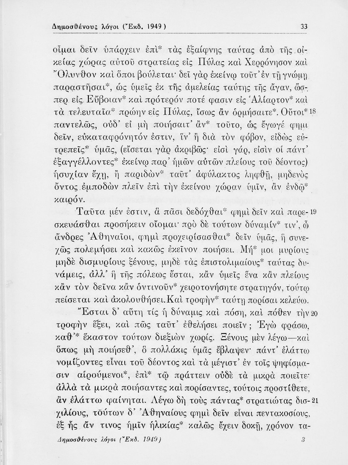 Σχολικό εγχειρίδιο Αρχαίων Ελληνικών Δ΄ Γυμνασίου που περιέχει τους Ολυνθιακούς Α΄ και Β΄ και τους Φιλιππικούς Α΄ και Β' του Δημοσθένη, ερμηνευτικά και πραγματολογικά σχόλια και γραμματικές παρατηρήσεις.