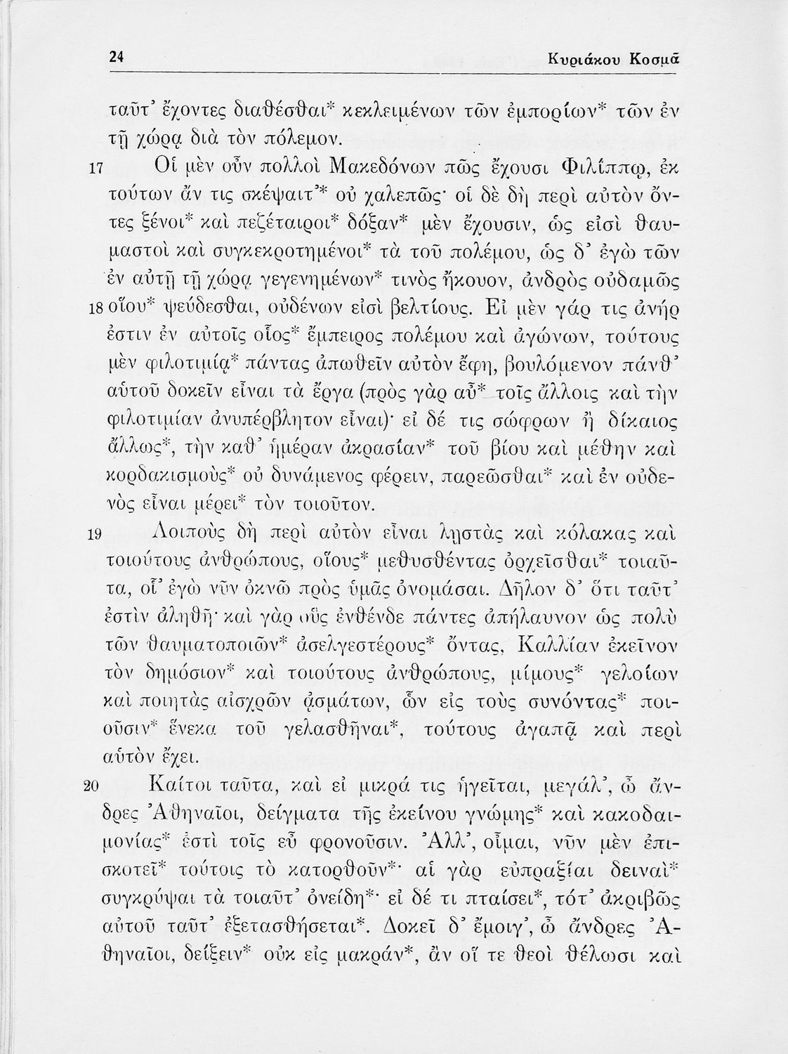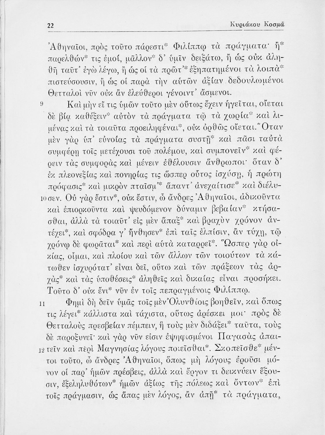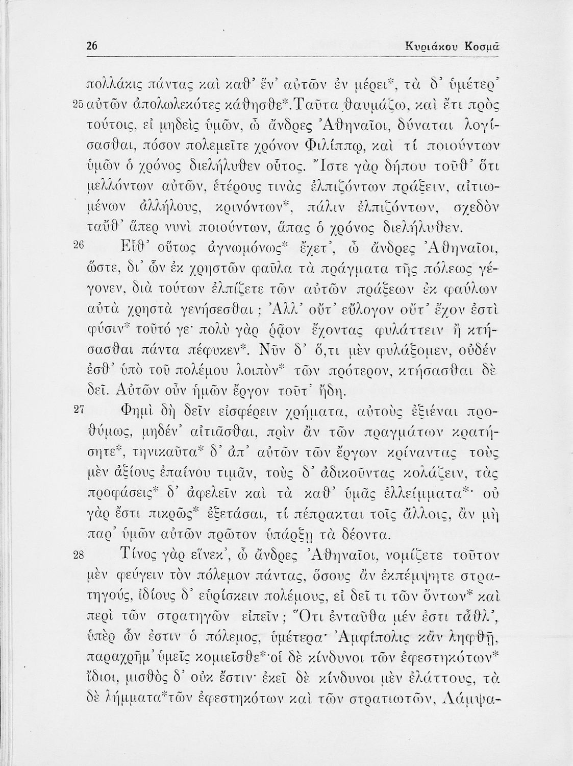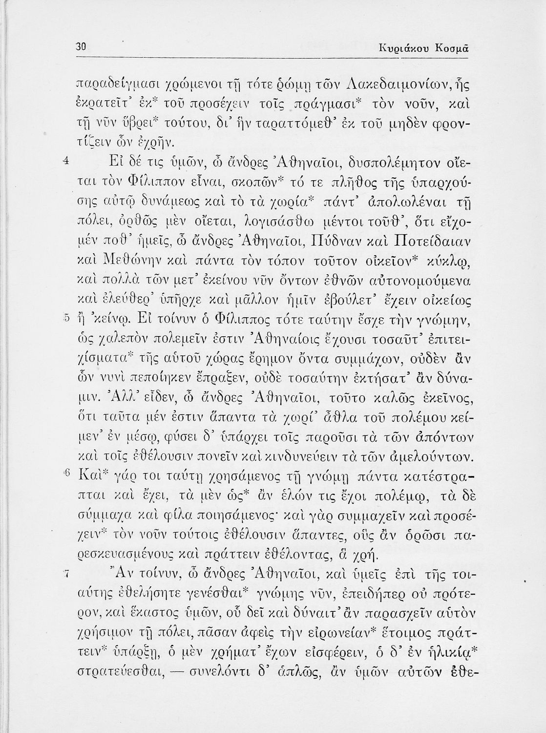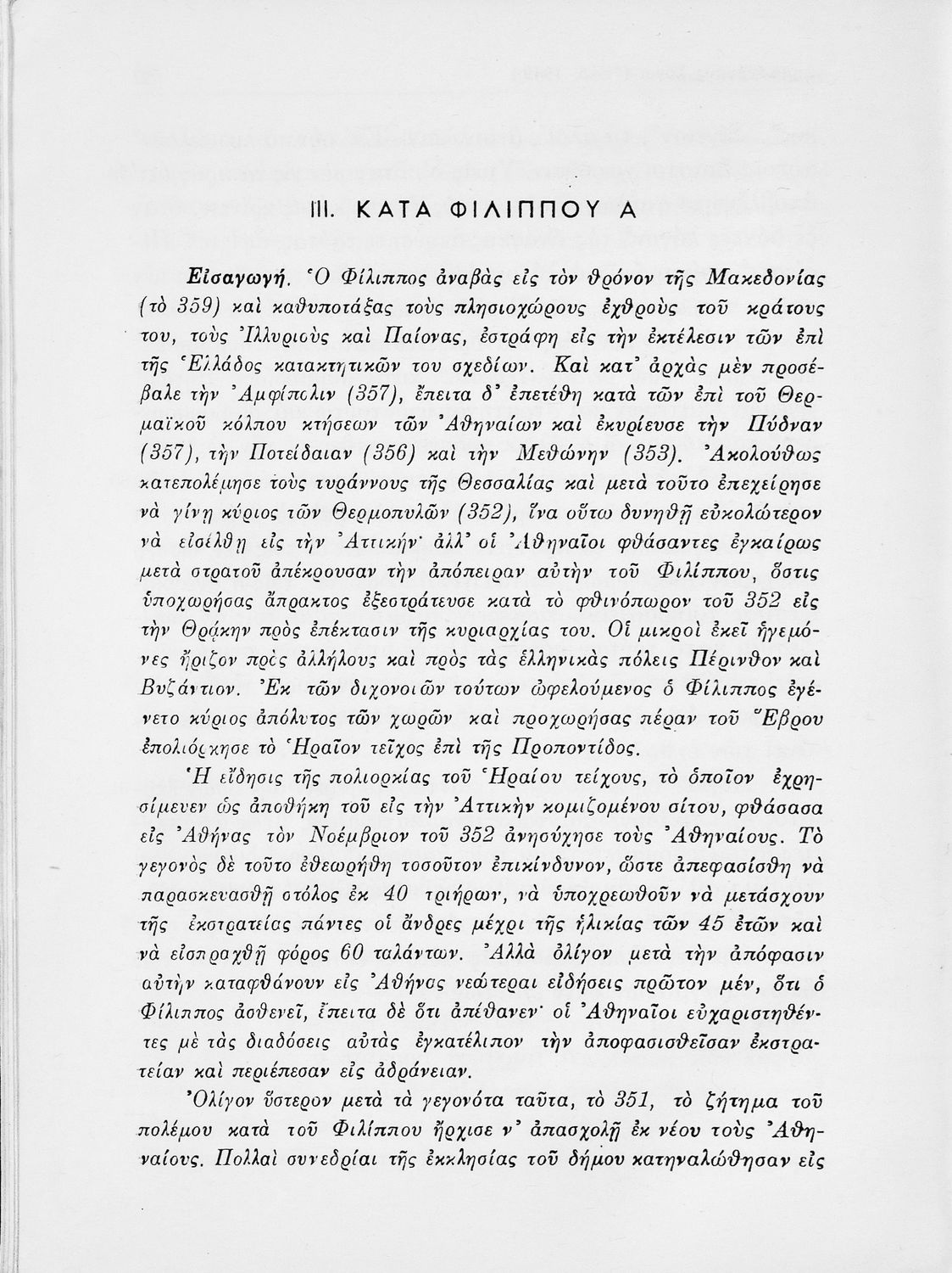 Βαθμίδα εκπαίδευσης: Δευτεροβάθμια Τάξη: Δ' Γυμνασίου Μάθημα: Αρχαία Ελληνικά Γλώσσα: Απλή καθαρεύουσα Παρουσίαση περιεχομένου: Σχολικό εγχειρίδιο Αρχαίων Ελληνικών Δ΄ Γυμνασίου που περιέχει τους Ολυνθιακούς Α΄ και Β΄ και τους Φιλιππικούς Α΄ και Β' του Δημοσθένη, ερμηνευτικά και πραγματολογικά σχόλια και γραμματικές παρατηρήσεις. |