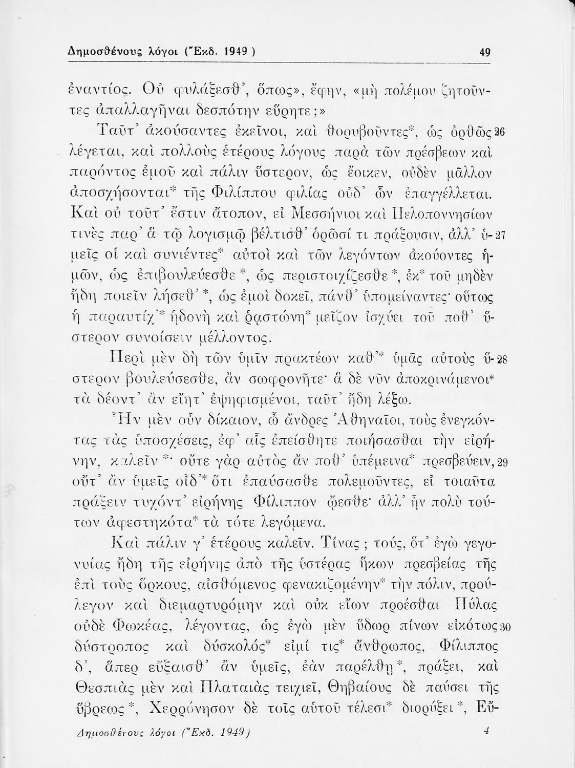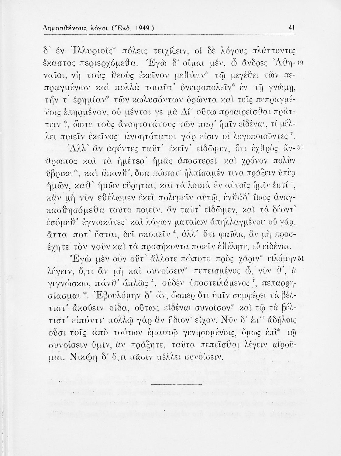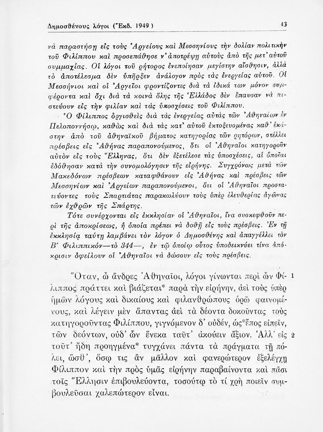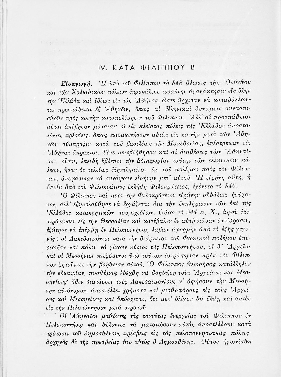 Σχολικό εγχειρίδιο Αρχαίων Ελληνικών Δ΄ Γυμνασίου που περιέχει τους Ολυνθιακούς Α΄ και Β΄ και τους Φιλιππικούς Α΄ και Β' του Δημοσθένη, ερμηνευτικά και πραγματολογικά σχόλια και γραμματικές παρατηρήσεις.