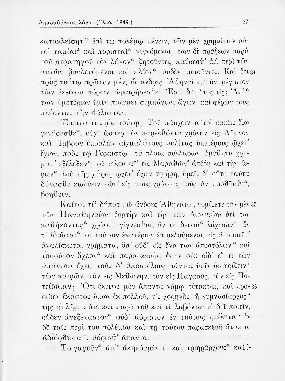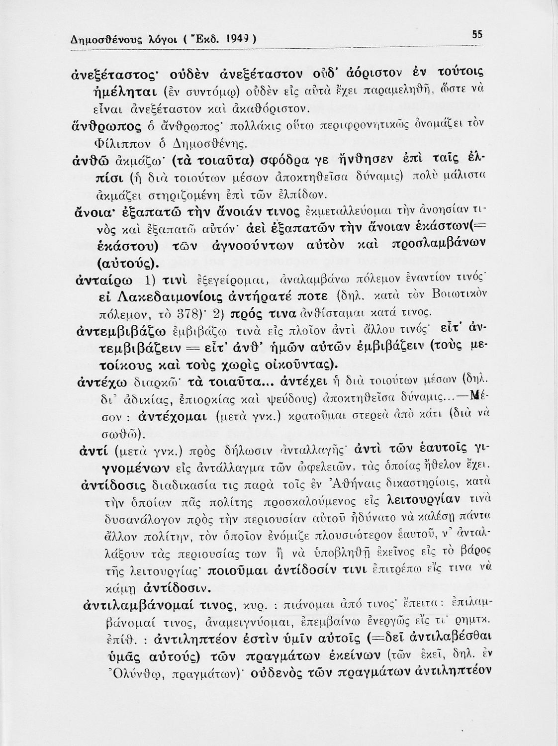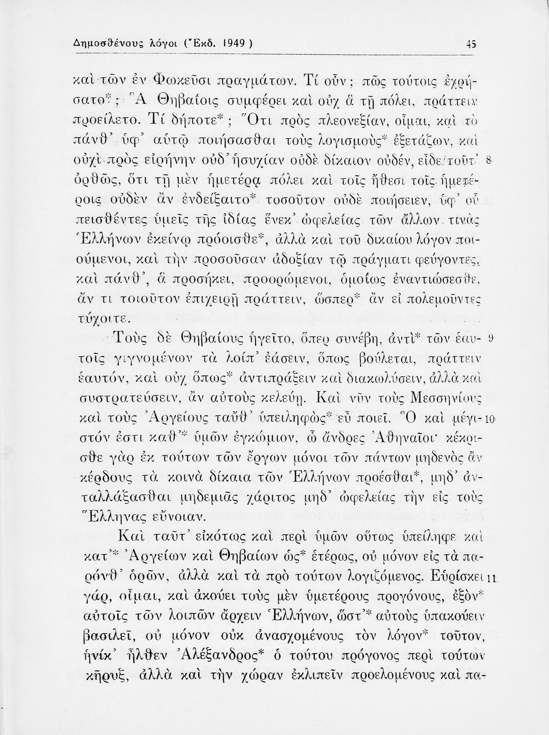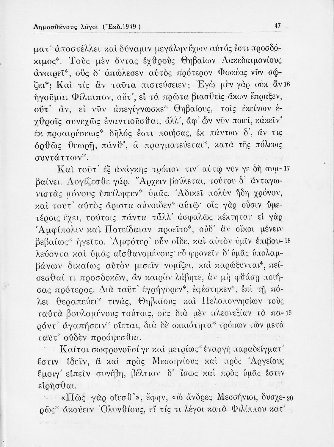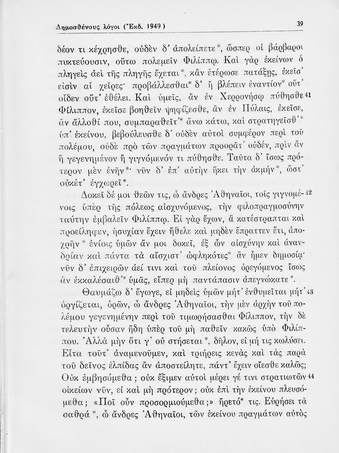 Σχολικό εγχειρίδιο Αρχαίων Ελληνικών Δ΄ Γυμνασίου που περιέχει τους Ολυνθιακούς Α΄ και Β΄ και τους Φιλιππικούς Α΄ και Β' του Δημοσθένη, ερμηνευτικά και πραγματολογικά σχόλια και γραμματικές παρατηρήσεις.