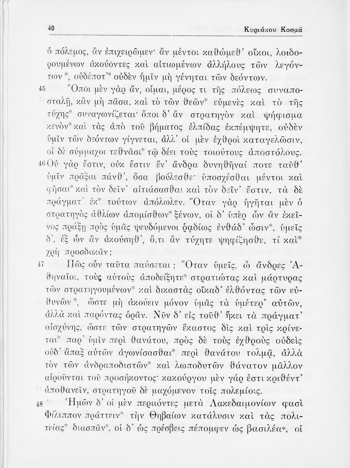 Βαθμίδα εκπαίδευσης: Δευτεροβάθμια Τάξη: Δ' Γυμνασίου Μάθημα: Αρχαία Ελληνικά Γλώσσα: Απλή καθαρεύουσα Παρουσίαση περιεχομένου: Σχολικό εγχειρίδιο Αρχαίων Ελληνικών Δ΄ Γυμνασίου που περιέχει τους Ολυνθιακούς Α΄ και Β΄ και τους Φιλιππικούς Α΄ και Β' του Δημοσθένη, ερμηνευτικά και πραγματολογικά σχόλια και γραμματικές παρατηρήσεις. |