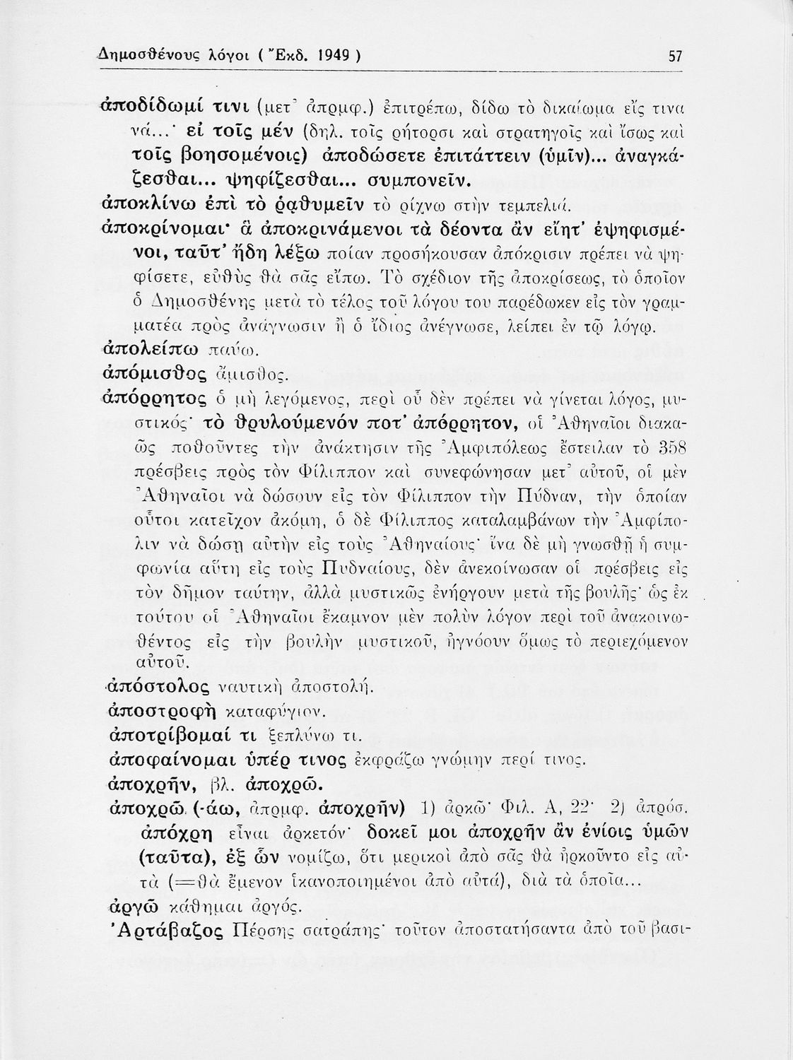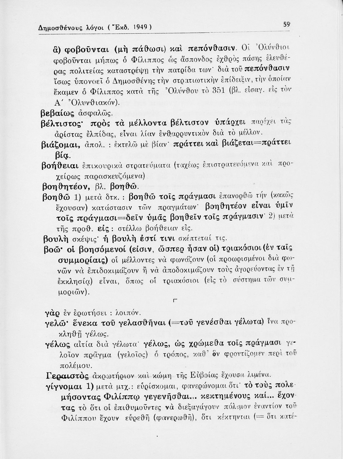 Σχολικό εγχειρίδιο Αρχαίων Ελληνικών Δ΄ Γυμνασίου που περιλαμβάνει εισαγωγή στη ζωή και στο έργο του Δημοσθένη, τον Α΄ κατά Φιλίππου, και τους Α΄ και Β΄ Ολυνθιακούς και ερμηνευτικά και ετυμολογικά σχόλια.
