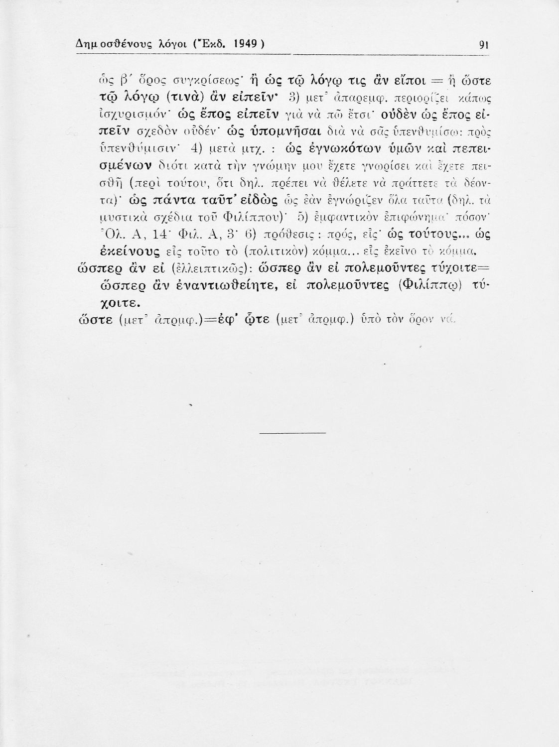 Σχολικό εγχειρίδιο Αρχαίων Ελληνικών Δ΄ Γυμνασίου που περιέχει τους Ολυνθιακούς Α΄ και Β΄ και τους Φιλιππικούς Α΄ και Β' του Δημοσθένη, ερμηνευτικά και πραγματολογικά σχόλια και γραμματικές παρατηρήσεις.