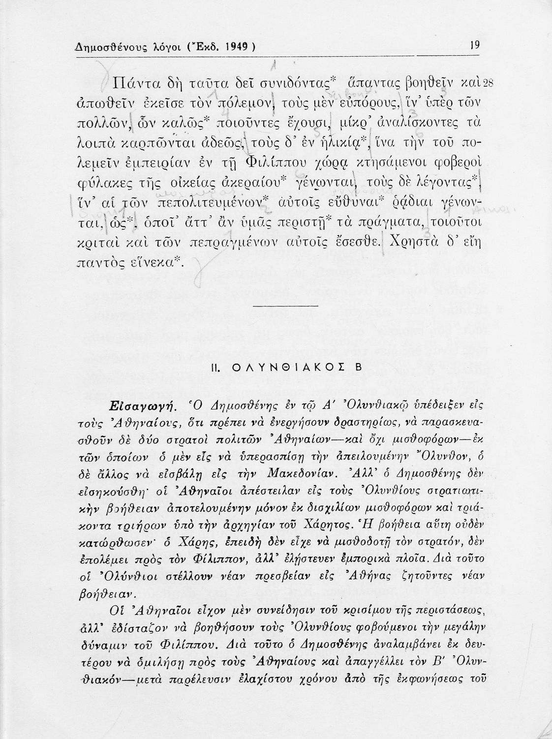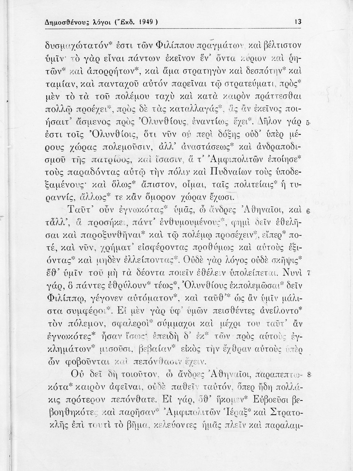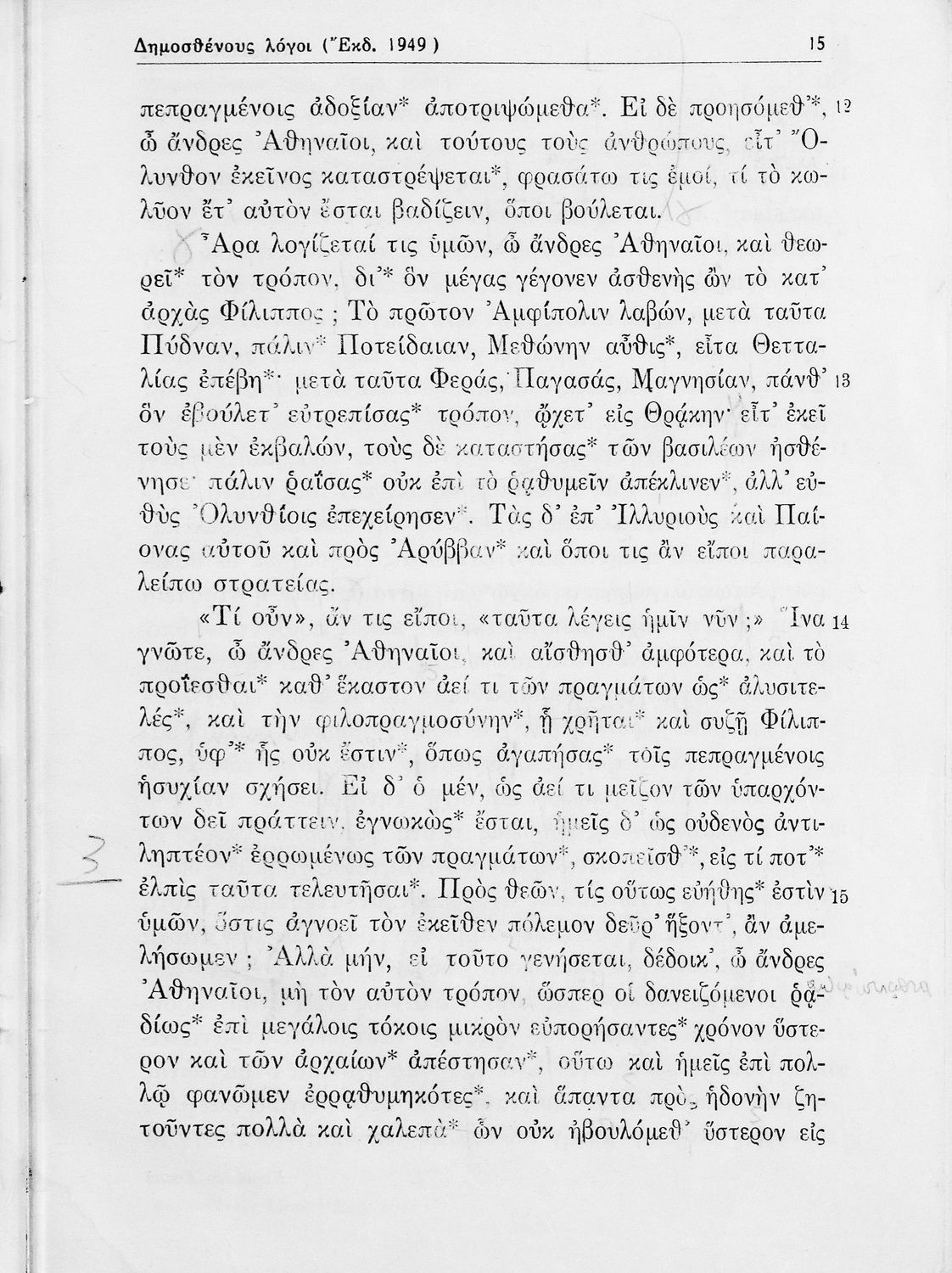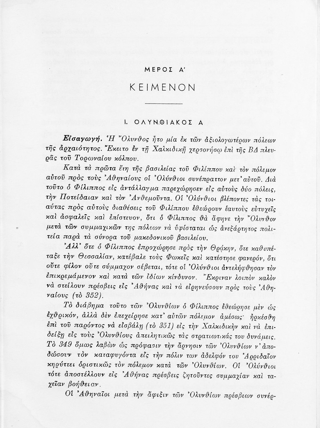 Σχολικό εγχειρίδιο Αρχαίων Ελληνικών Δ΄ Γυμνασίου που περιλαμβάνει εισαγωγή στη ζωή και στο έργο του Δημοσθένη, τον Α΄ κατά Φιλίππου, και τους Α΄ και Β΄ Ολυνθιακούς και ερμηνευτικά και ετυμολογικά σχόλια.