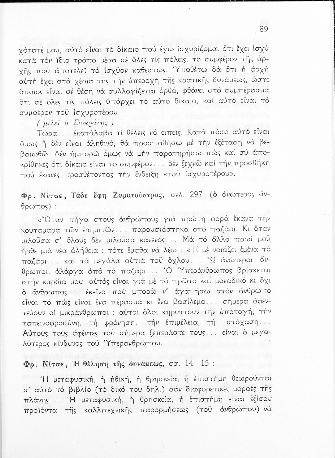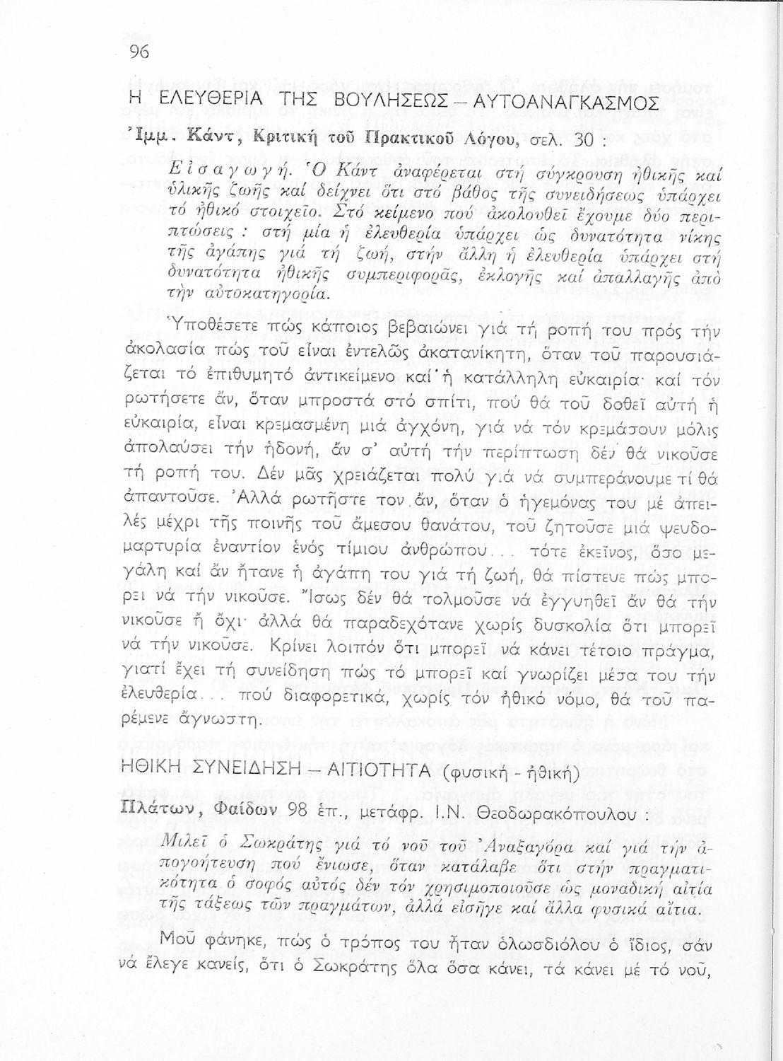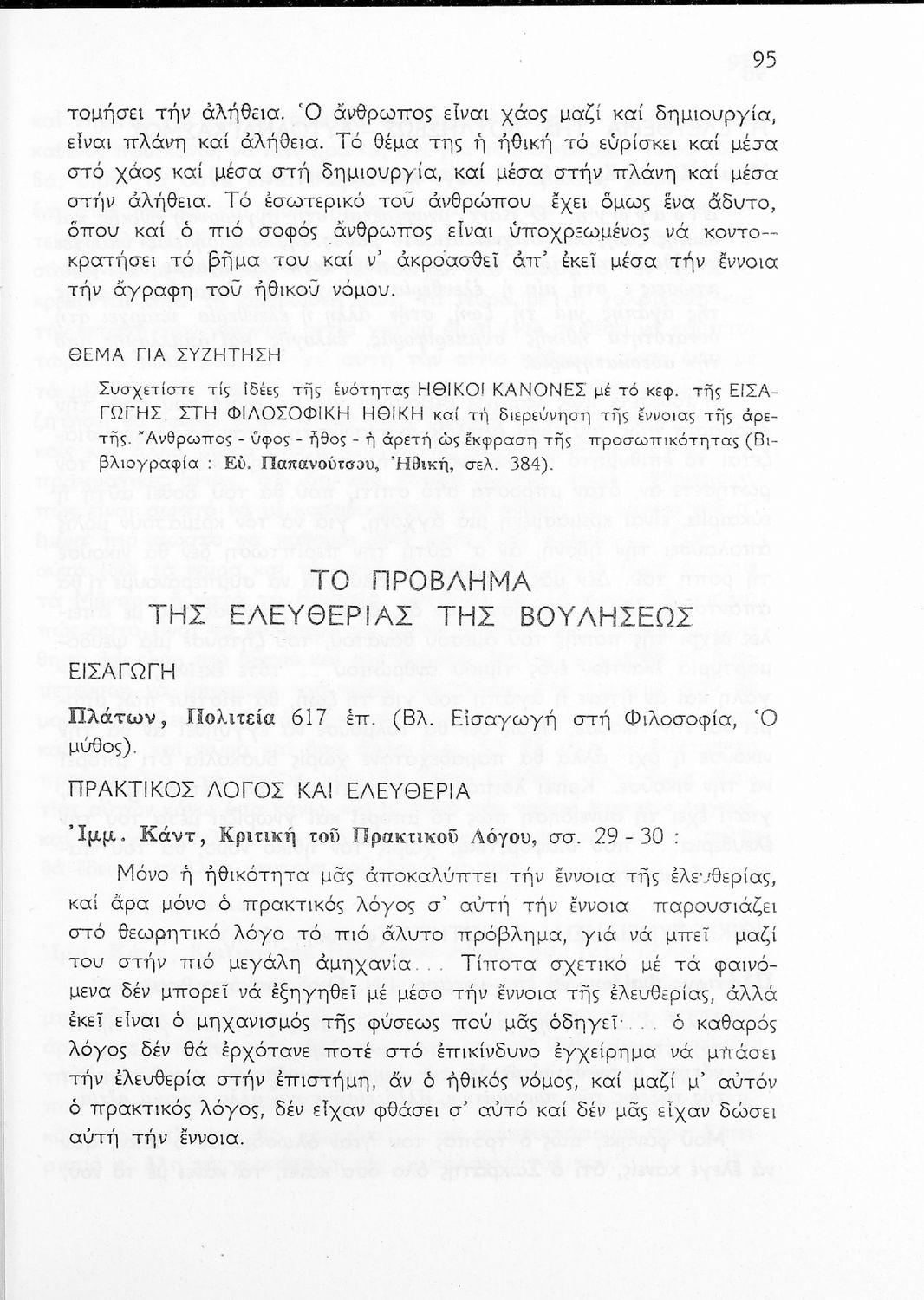 Σχολικό εγχειρίδιο Φιλοσοφίας για την ΣΤ΄ Γυμνασίου που περιέχει αποσπάσματα από διάσημα φιλοσοφικά κείμενα τόσο της ελληνικής αρχαιότητας όσο και της σύγχρονης ευρωπαϊκής σκέψης και θέματα προς συζήτηση. Περιλαμβάνει και λεξιλόγιο φιλοσοφικών όρων και ειδικό κεφάλαιο για τους προσωκρατικούς.