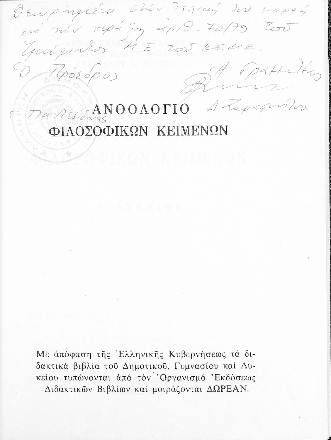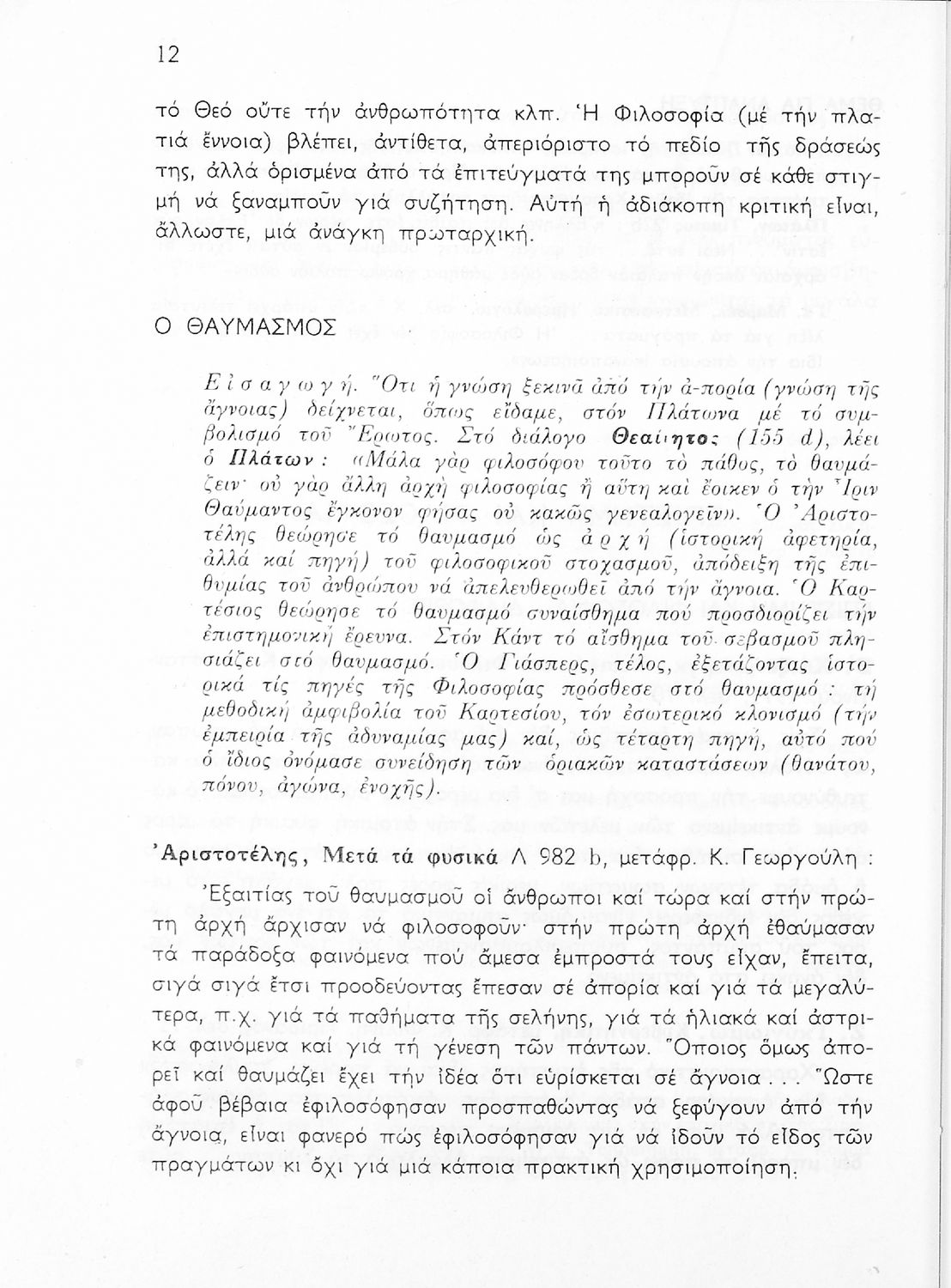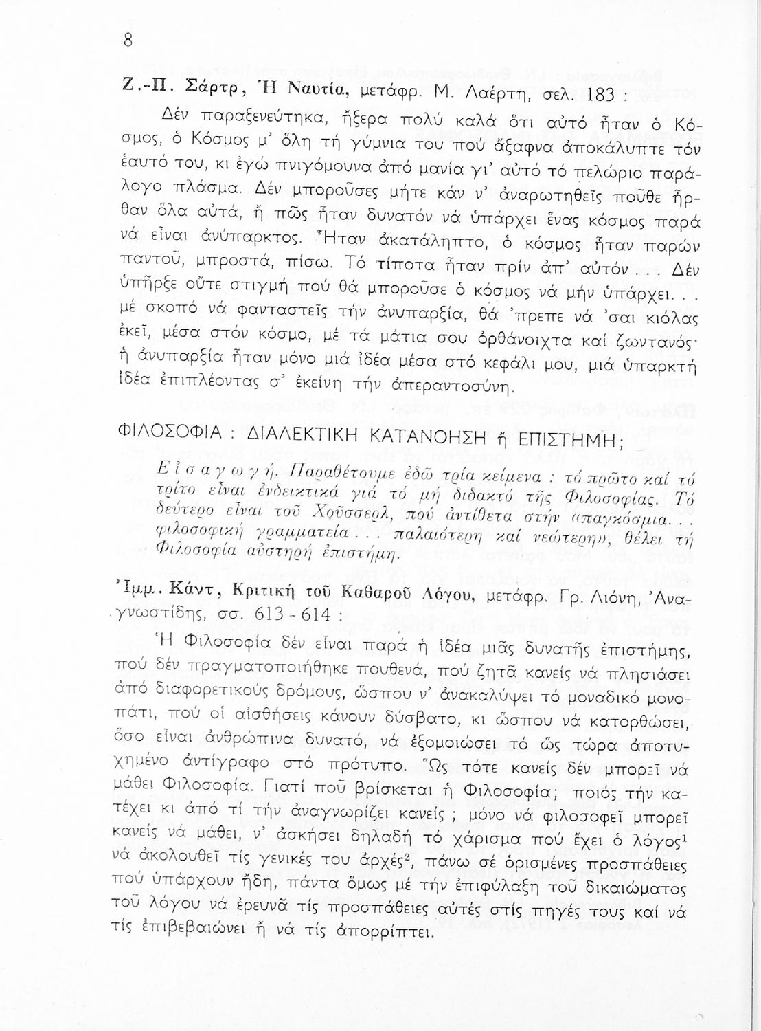 Σχολικό εγχειρίδιο Φιλοσοφίας για την ΣΤ΄ Γυμνασίου που περιέχει αποσπάσματα από διάσημα φιλοσοφικά κείμενα τόσο της ελληνικής αρχαιότητας όσο και της σύγχρονης ευρωπαϊκής σκέψης και θέματα προς συζήτηση. Περιλαμβάνει και λεξιλόγιο φιλοσοφικών όρων και ειδικό κεφάλαιο για τους προσωκρατικούς.