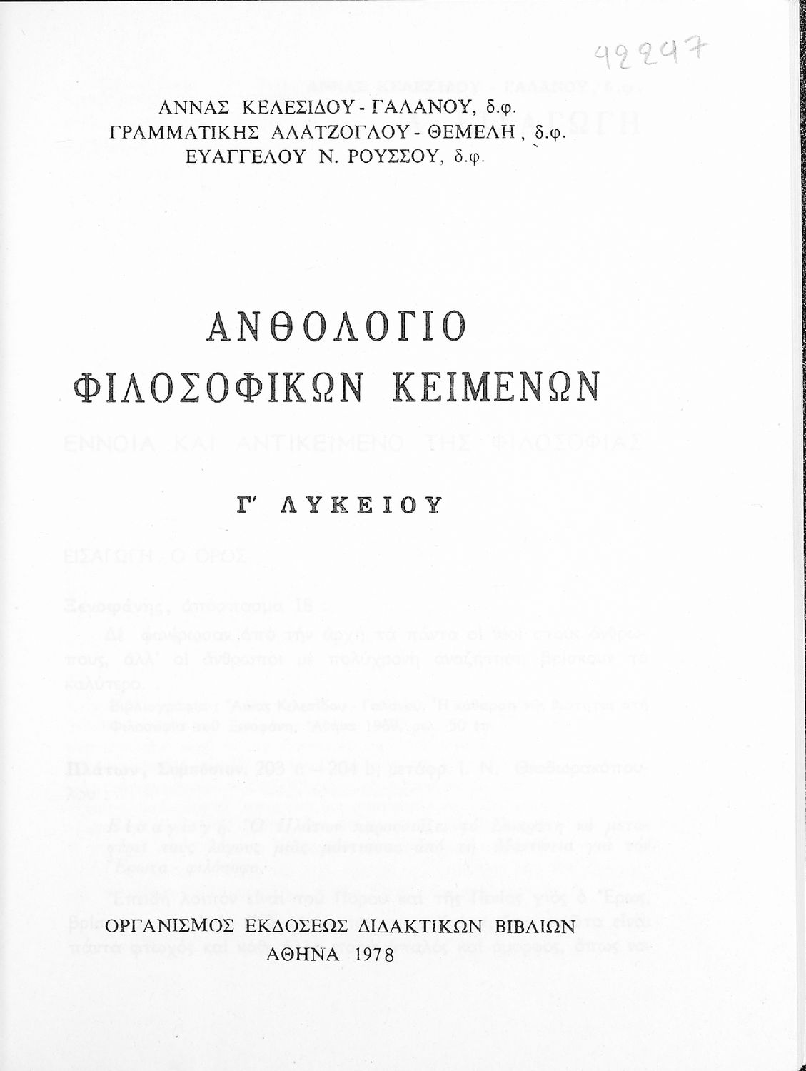 Κωδικός αναγνώρισης: 01-42247 Τίτλος: Ανθολόγιο φιλοσοφικών κειμένων Γ΄ Λυκείου Συγγραφέας: Άννα Κελεσίδου-Γαλανού, Γραμματική Αλατζόγλου-Θέμελη, Ευάγγελος Ν. Ρούσσος Μέγεθος και υπόστρωμα: Σχολικό εγχειρίδιο, 20εκ., μαλακό εξώφυλλο, 165 σελίδες. Εξώφυλλο (έγχρωμο). |