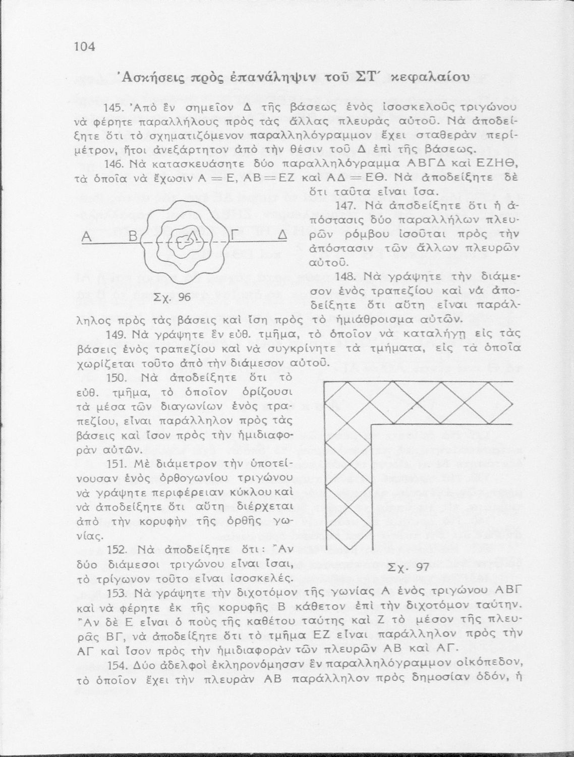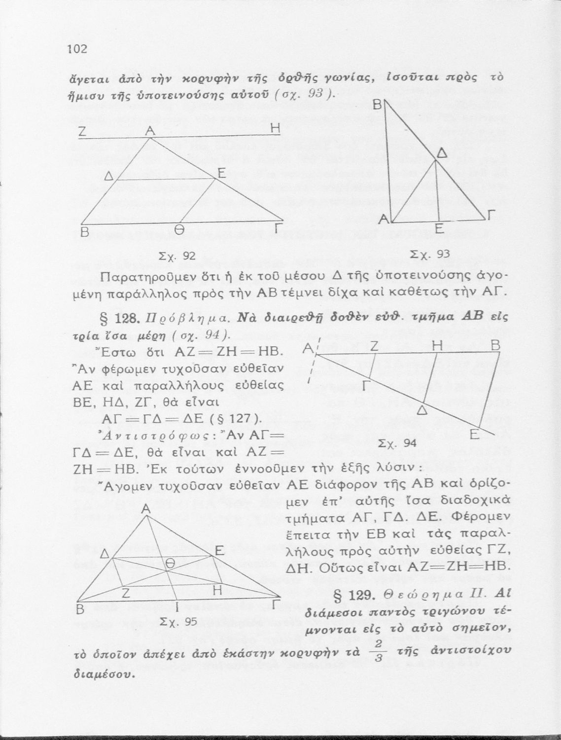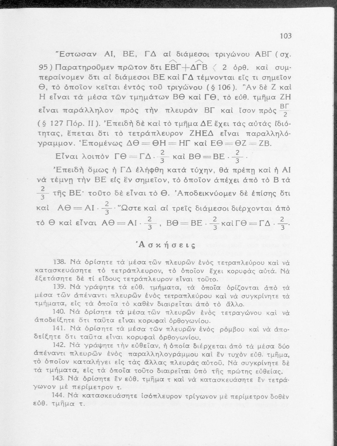 Σχολικό εγχειρίδιο Γεωμετρίας Γυμνασίου που είναι χωρισμένο σε θεωρήματα και ασκήσεις και εστιάζει στα βασικά θεωρήματα και ιδιότητες των γεωμετρικών σχημάτων. .