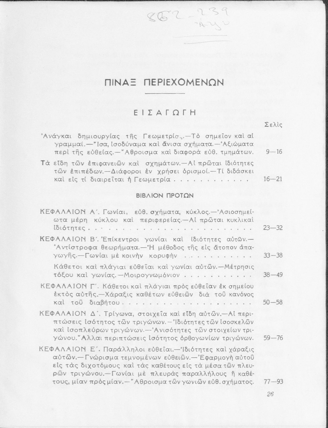 Βαθμίδα εκπαίδευσης: Δευτεροβάθμια Τάξη: Γυμνάσιο Μάθημα: Μαθηματικά Γλώσσα: Απλή καθαρεύουσα Παρουσίαση περιεχομένου: Σχολικό εγχειρίδιο Γεωμετρίας Γυμνασίου που περιλαμβάνει θεωρία και ασκήσεις και είναι χωρισμένο σε Επιπεδομετρία και Στερεομετρία. |