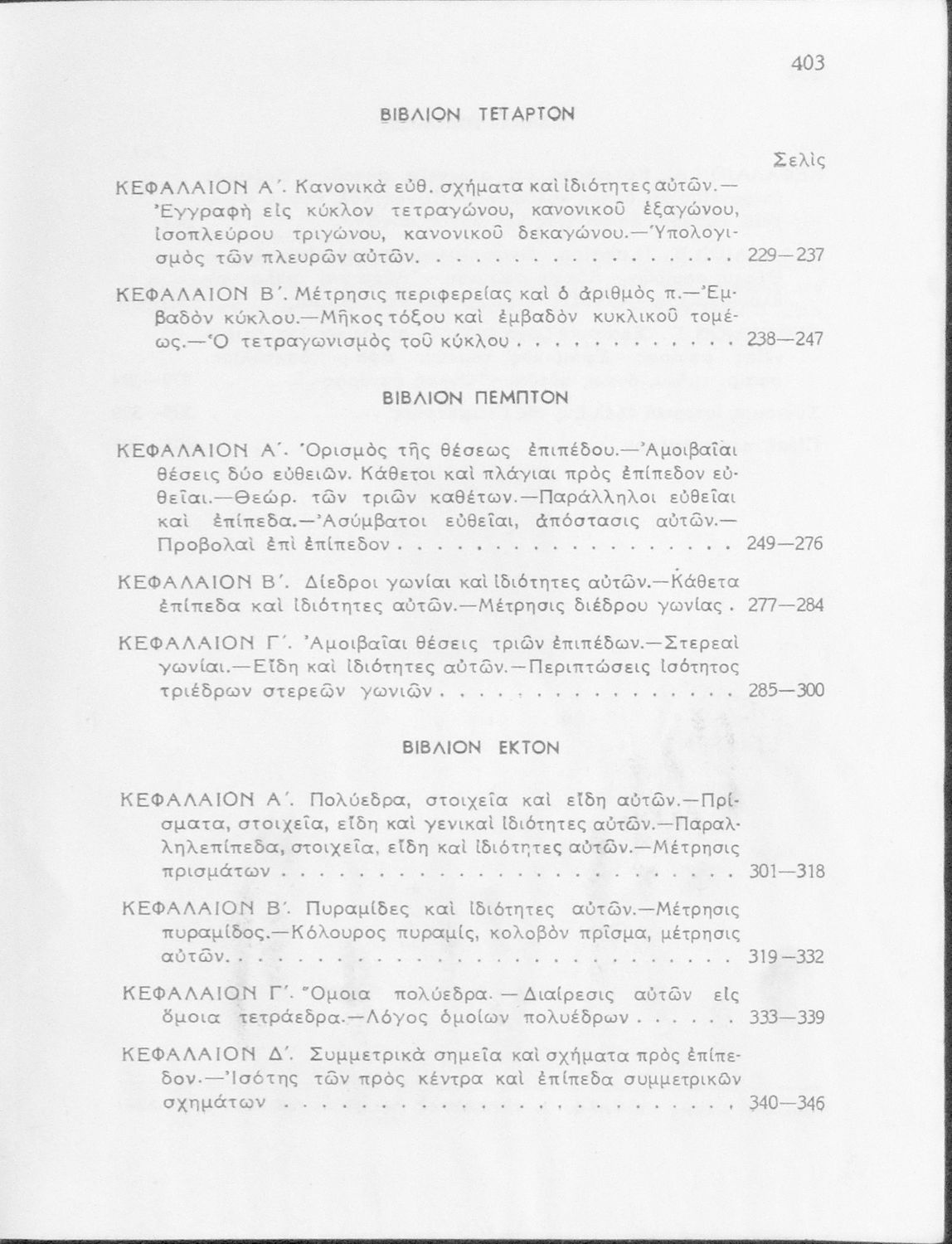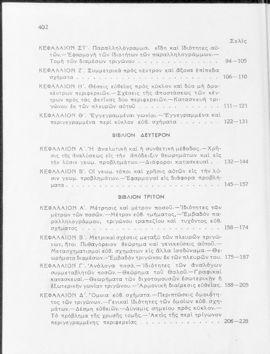 Κωδικός αναγνώρισης: 01-42249 Τίτλος: Θεωρητική γεωμετρία δια τας ανωτέρας τάξεις των Γυμνασίων Συγγραφέας: Νικόλαος Δ. Νικολάου, Δ. Κάρτσωνας (επιμέλεια) Μέγεθος και υπόστρωμα: Σχολικό εγχειρίδιο, 20εκ., σκληρό εξώφυλλο, 404 σελίδες. Σκίτσα (ασπρόμαυρα). |
