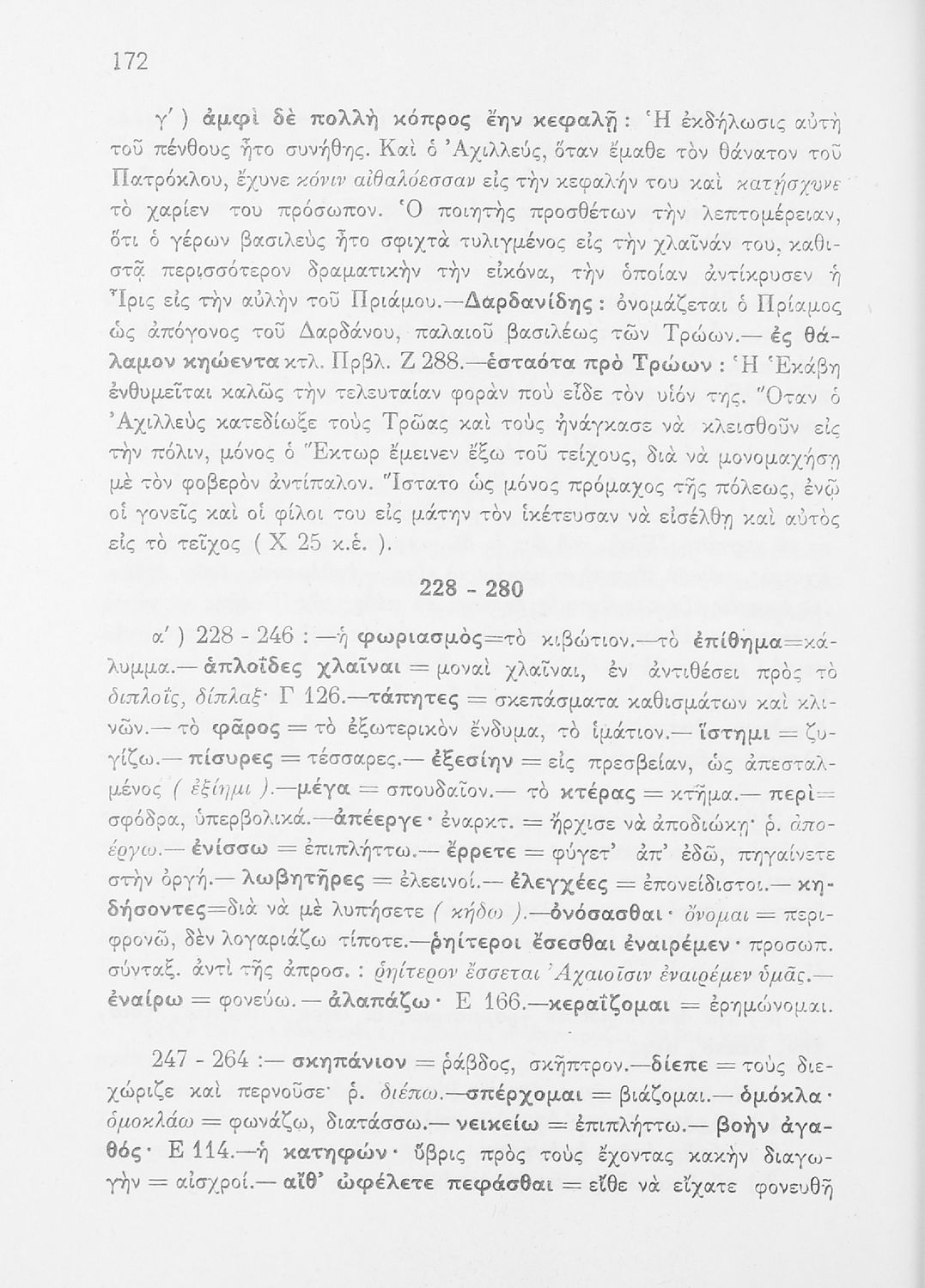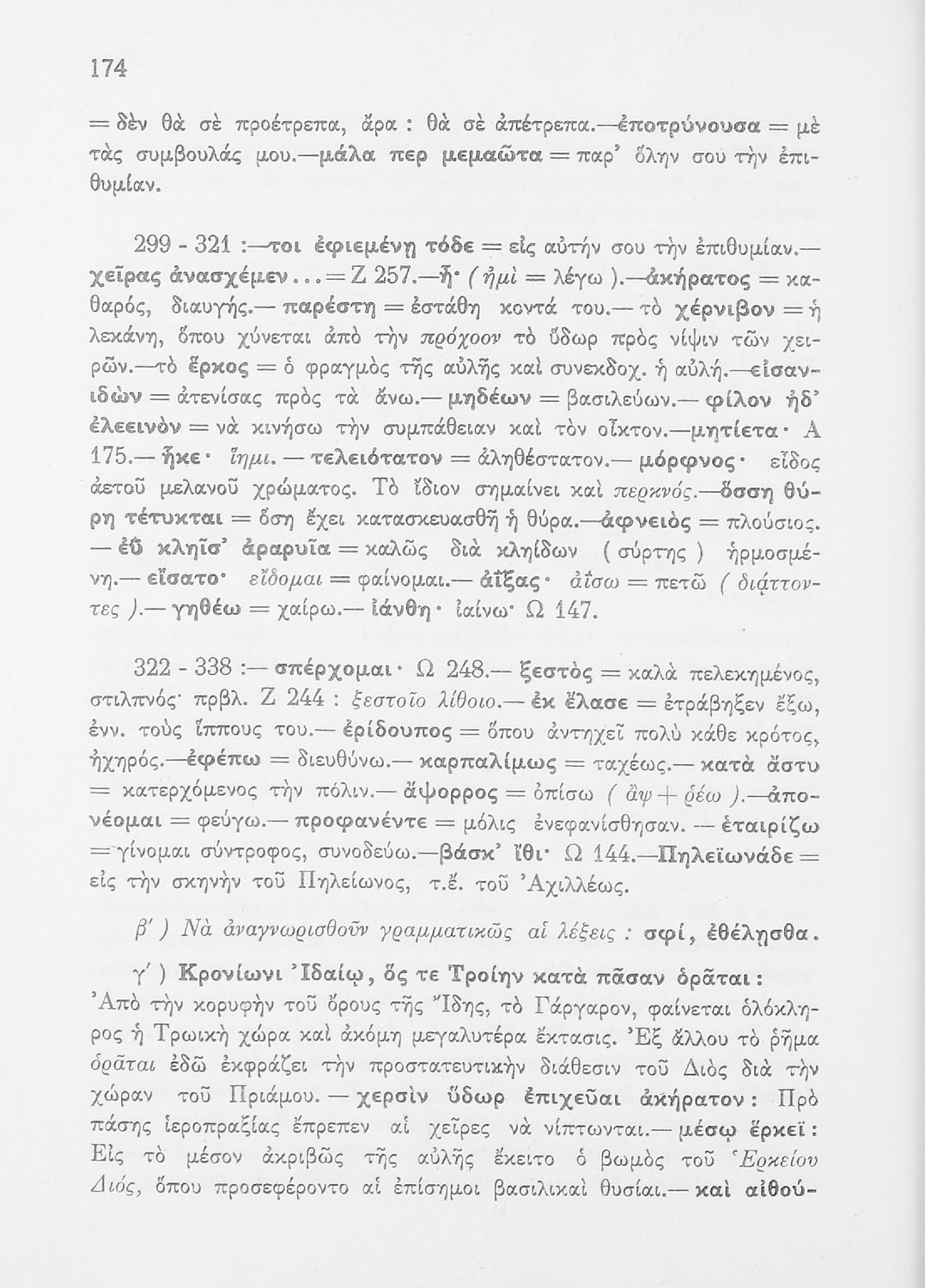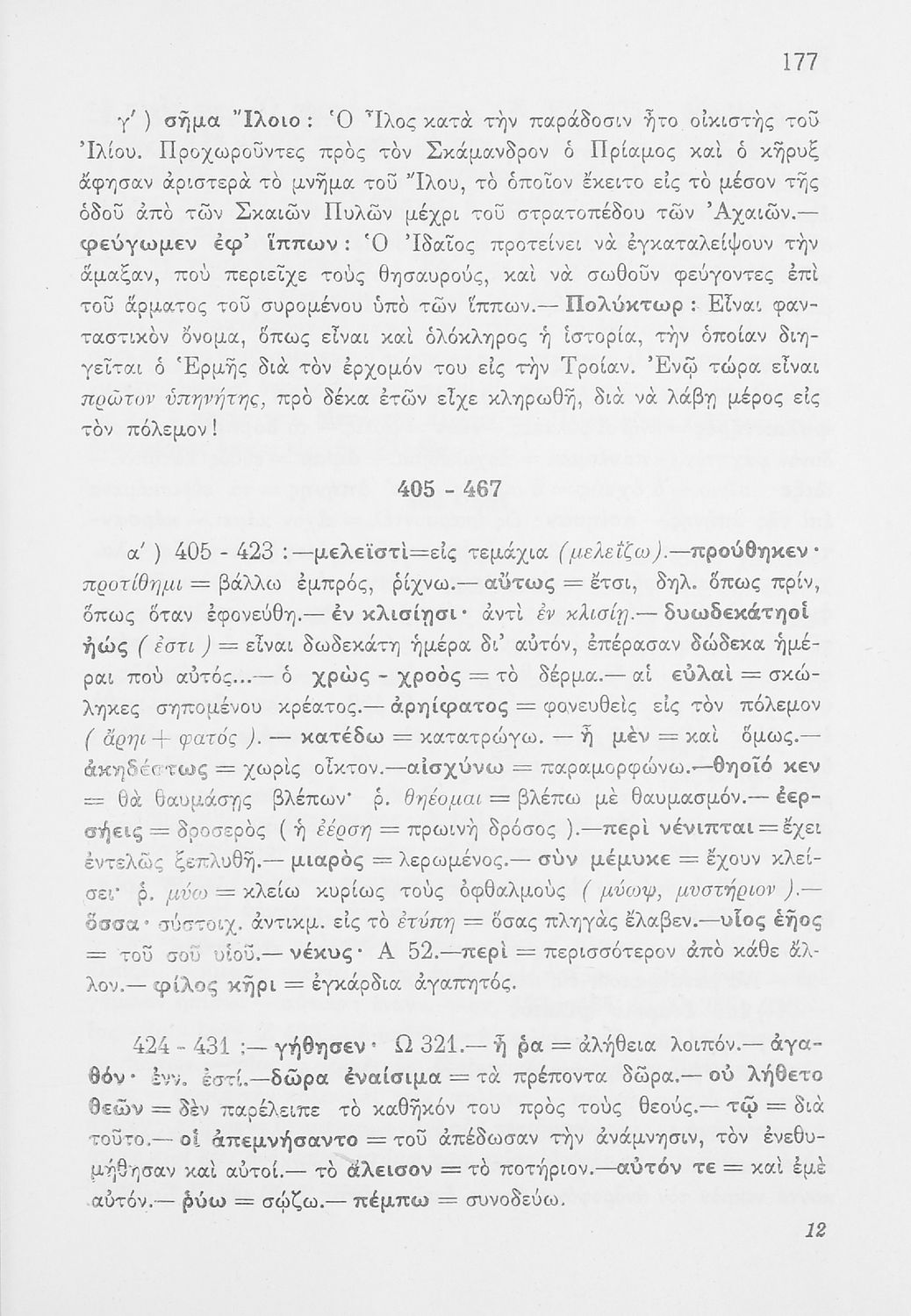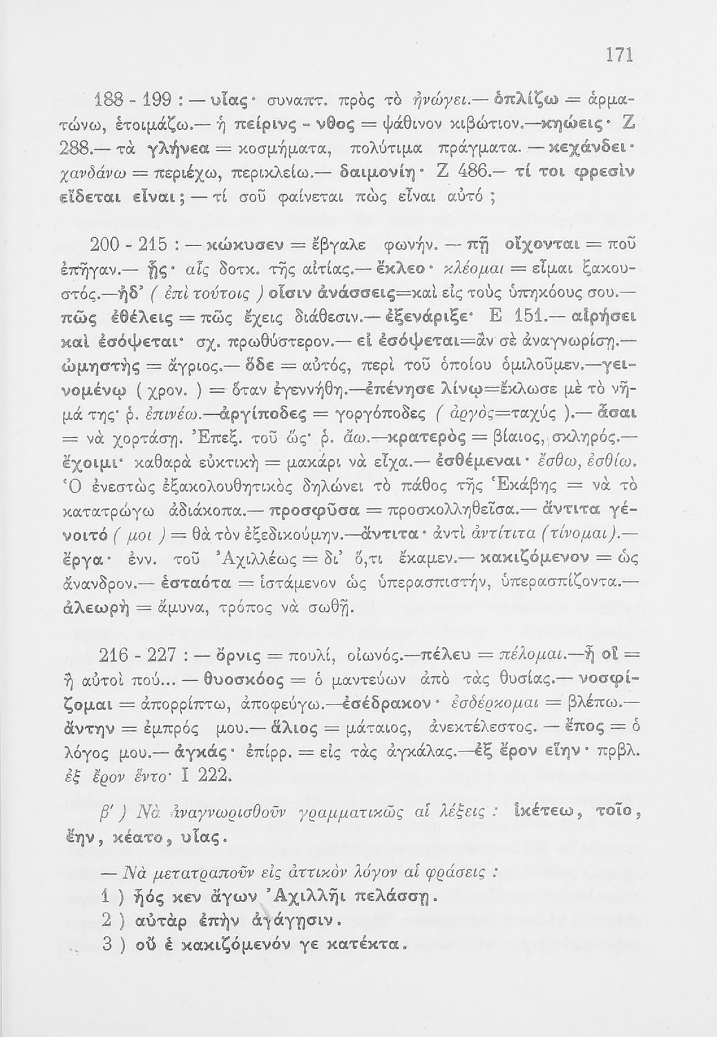 Σχολικό εγχειρίδιο Αρχαίων Ελληνικών Ε΄ και ΣΤ΄ Γυμνασίου που περιλαμβάνει εισαγωγικό σημείωμα σχετικά με το περιεχόμενο της Ιλιάδας του Ομήρου και την εποχή στην οποία αναφέρεται, αποσπάσματα από τις Ραψωδίες της Ιλιάδας Α, Γ, Ε, Ζ, Ι, Π., ερμηνευτικές σημειώσεις (σημασιολογικές, γραμματικές, πραγματολογικές) και παράρτημα εικόνων και χαρτών.