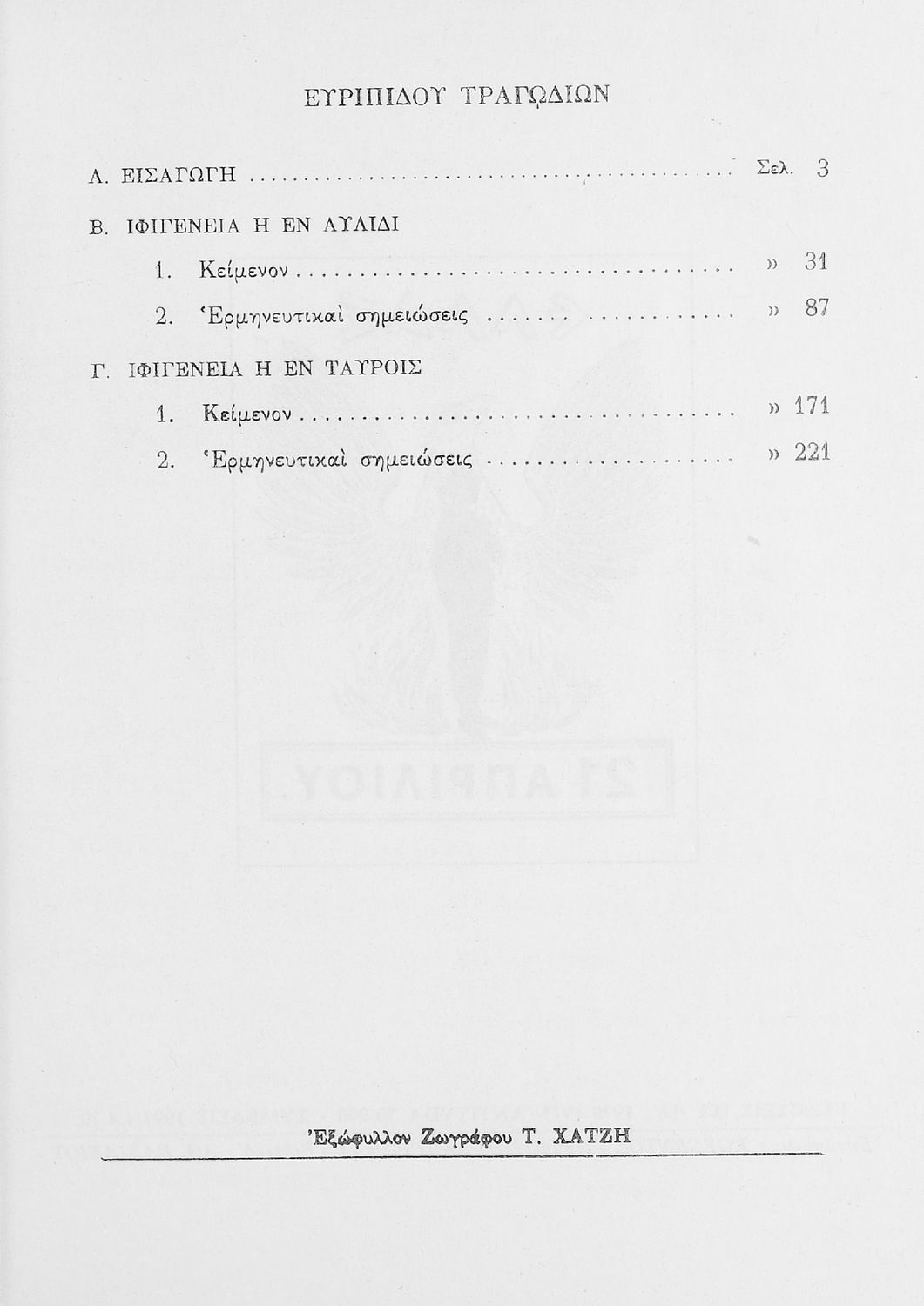 Σχολικό εγχειρίδιο Αρχαίων Ελληνικών Ε΄ Γυμνασίου που περιέχει τις τραγωδίες του Ευριπίδη Ιφιγένεια η εν Αυλίδι και Ιφιγένεια η εν Ταύροις, εισαγωγή στα έργα και ερμηνευτικά και ετυμολογικά σχόλια. Περιέχει και παράρτημα με εικόνες. Φέρει το σύμβολο της δικτατορίας.