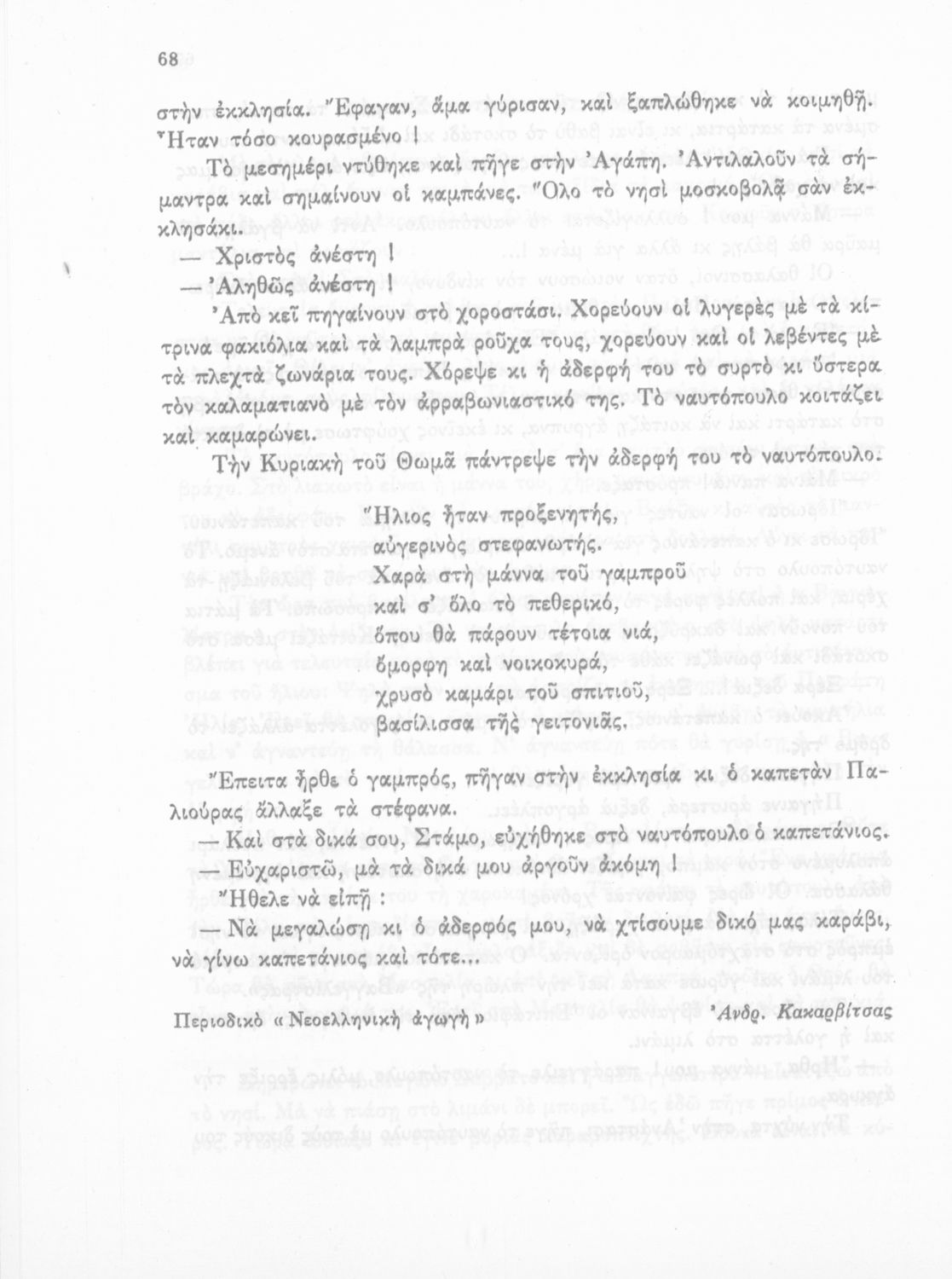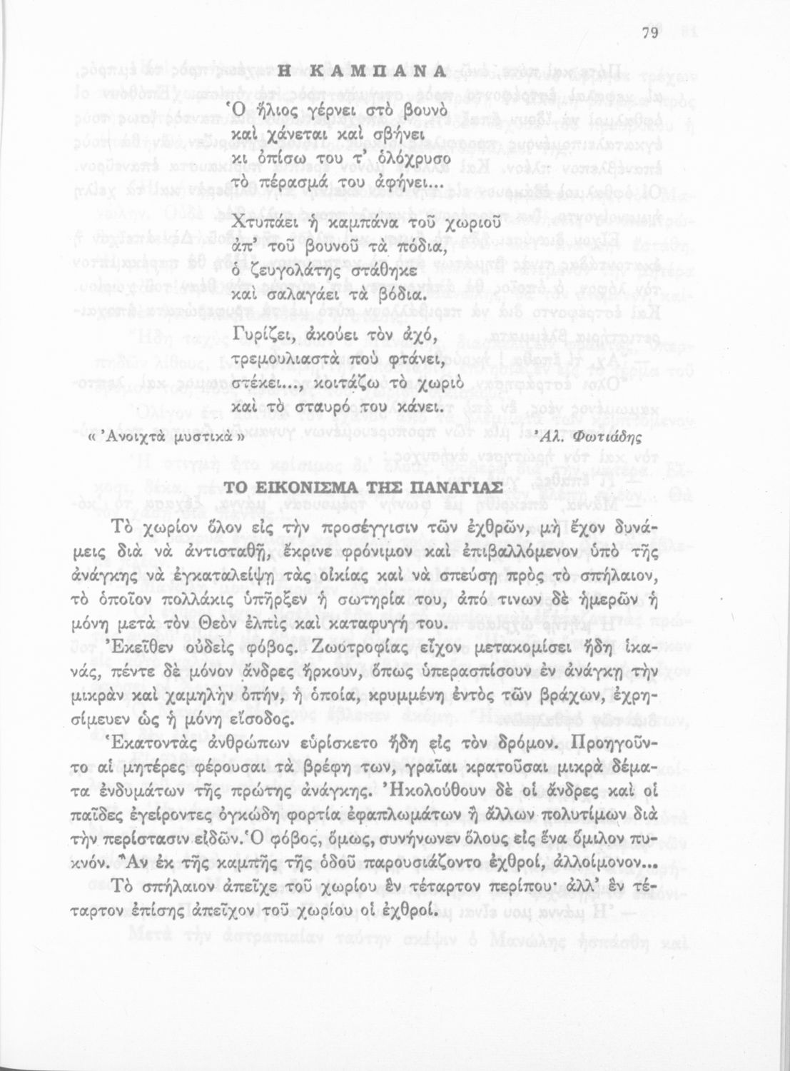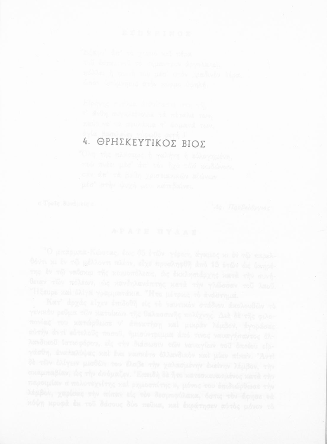 Σχολικό εγχειρίδιο Νέων Ελληνικών Γ΄ Γυμνασίου και Α' Αστικού Σχολείου που περιέχει πεζά και ποιήματα Ελλήνων συγγραφέων εμπνευσμένα από τη θρησκευτική και κοινωνική ζωή, την ελληνική μυθολογία, την αρχαία και