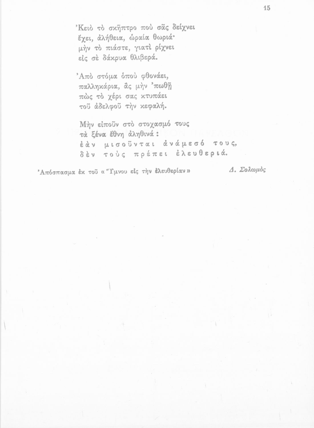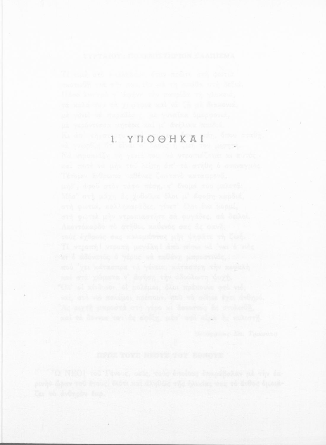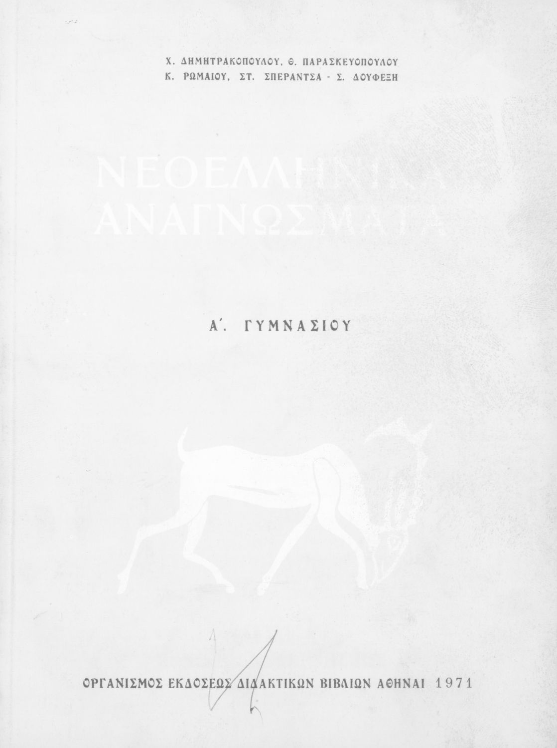 Σχολικό εγχειρίδιο Νέων Ελληνικών Γ΄ Γυμνασίου και Α' Αστικού Σχολείου που περιέχει πεζά και ποιήματα Ελλήνων συγγραφέων εμπνευσμένα από τη θρησκευτική και κοινωνική ζωή, την ελληνική μυθολογία, την αρχαία και