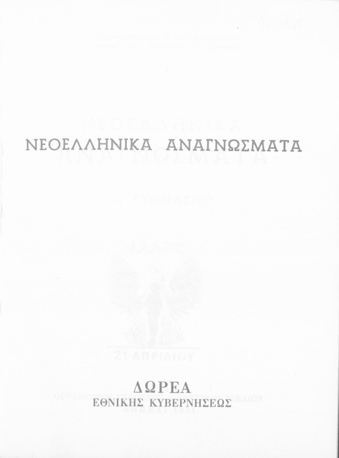 Παρουσίαση περιεχομένου: Σχολικό εγχειρίδιο Νέων Ελληνικών Α' Γυμνασίου που περιέχει ποιήματα και πεζά Ελλήνων συγγραφέων εμπνευσμένα από την αρχαία ελληνική ιστορία και μυθολογία, τη βυζαντινή και σύγχρονη ελληνική ιστορία και την καθημερινή ζωή. Περιέχει παράρτημα με βιογραφίες των συγγραφέων και λεξιλόγιο. Φέρει το σύμβολο της δικτατορίας.