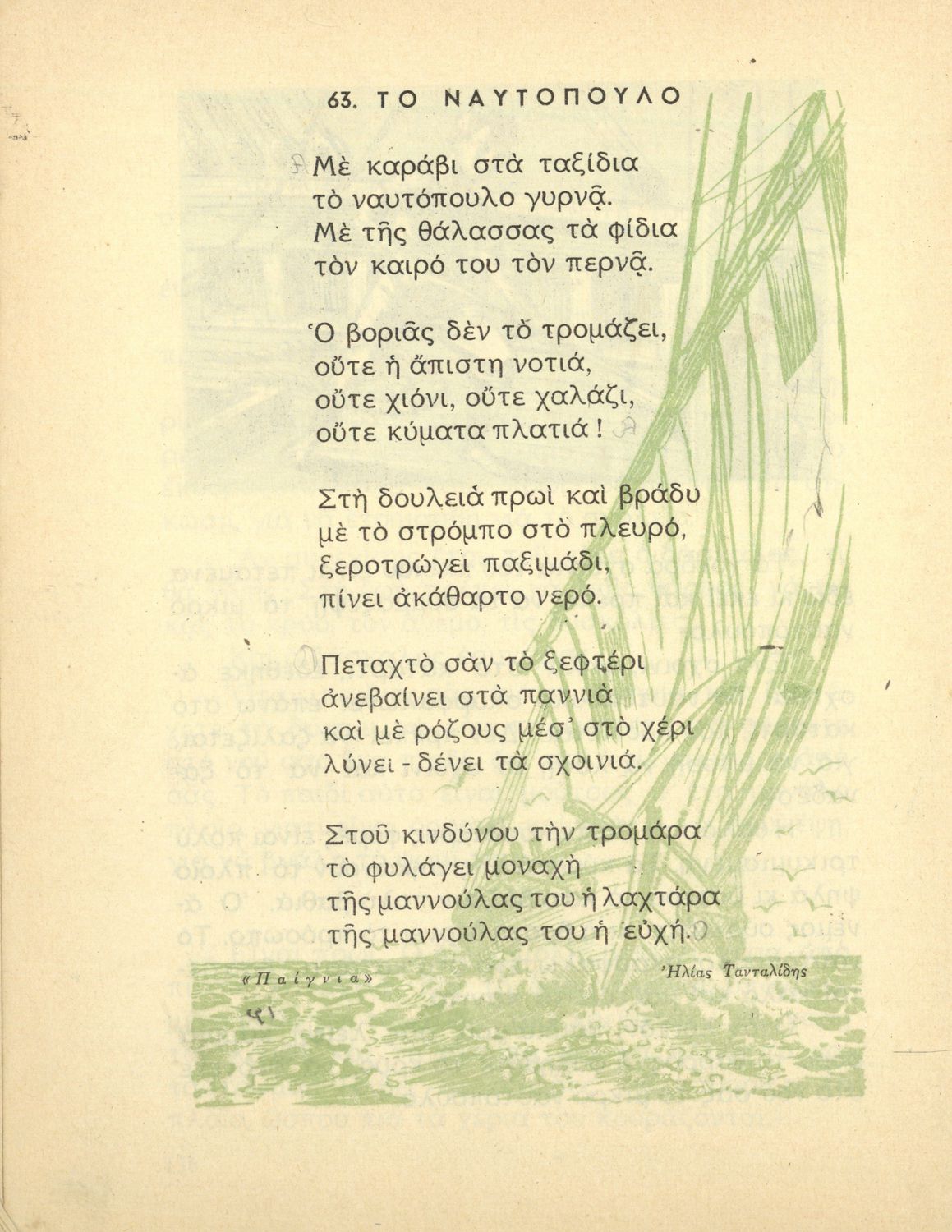 Αναγνωστικό Γ΄ Δημοτικού που περιλαμβάνει ποιήματα και πεζά εμπνευσμένα από την ελληνική φύση, τις ασχολίες των κατοίκων, την σύγχρονη ελληνική ιστορία, την ελληνική μυθολογία και τις θρησκευτικές γιορτές.