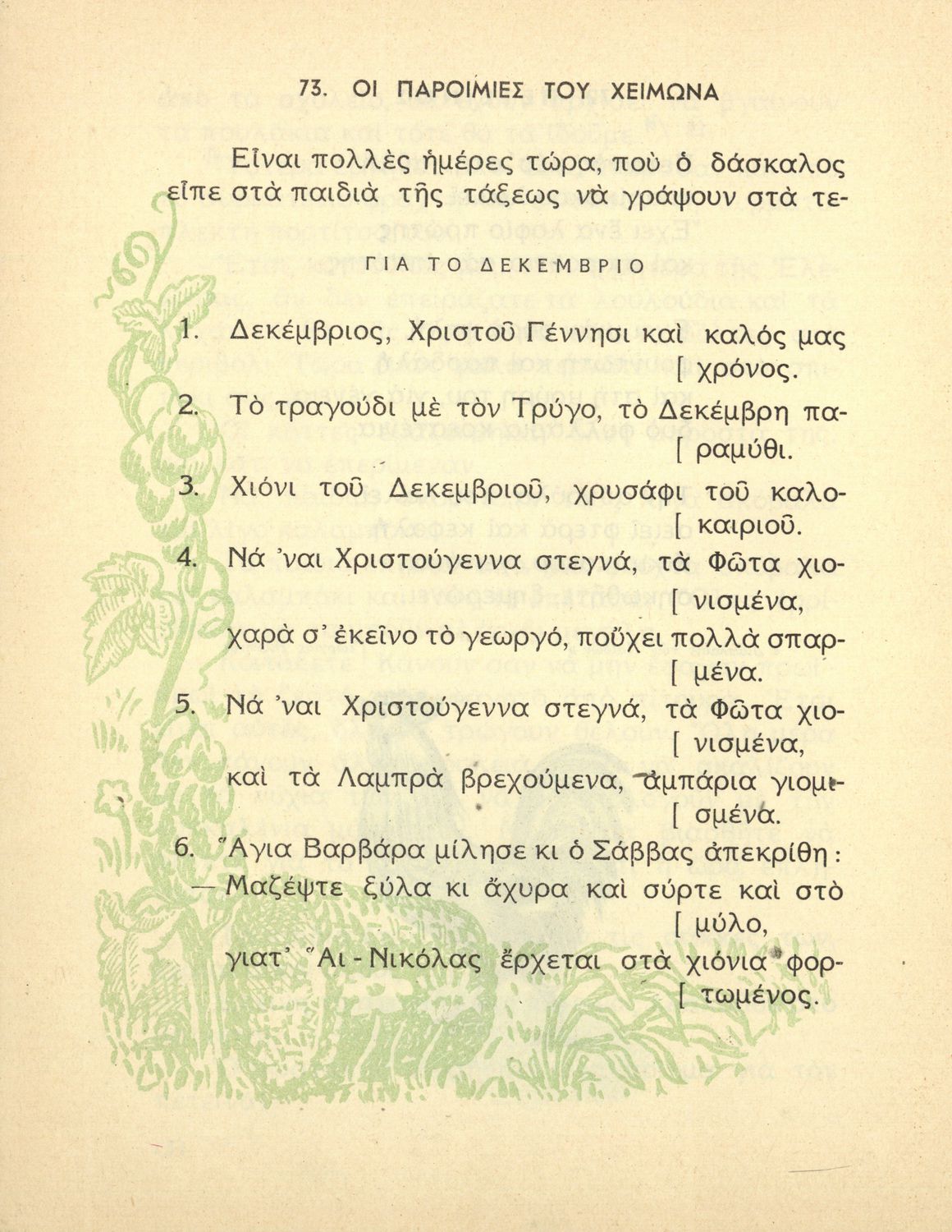 Αναγνωστικό Γ' Δημοτικού που είναι χωρισμένο σύμφωνα με τις εποχές του χρόνου και περιλαμβάνει ποιήματα και πεζά εμπνευσμένα από τη ζωή στην ύπαιθρο, την εθνική, οικογενειακή και κοινωνική ζωή, τη θρησκευτική παράδοση, τις ασχολίες των ανθρώπων, και την ελληνική φύση.