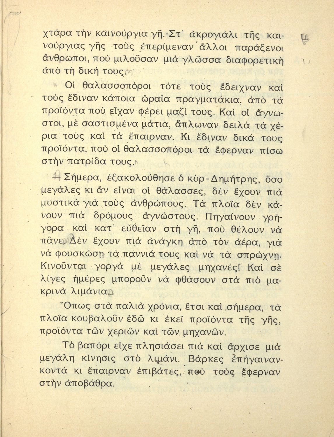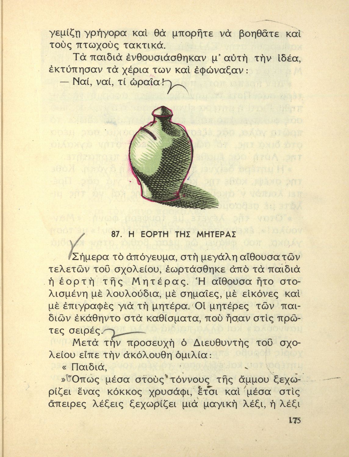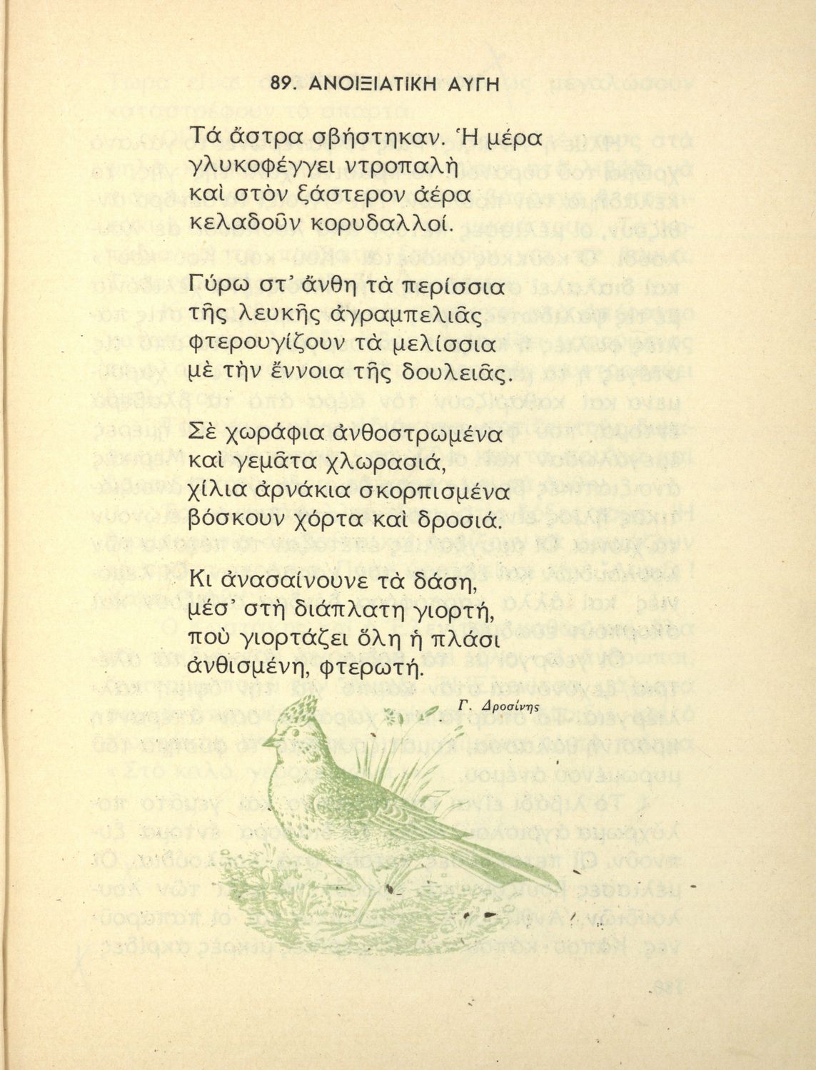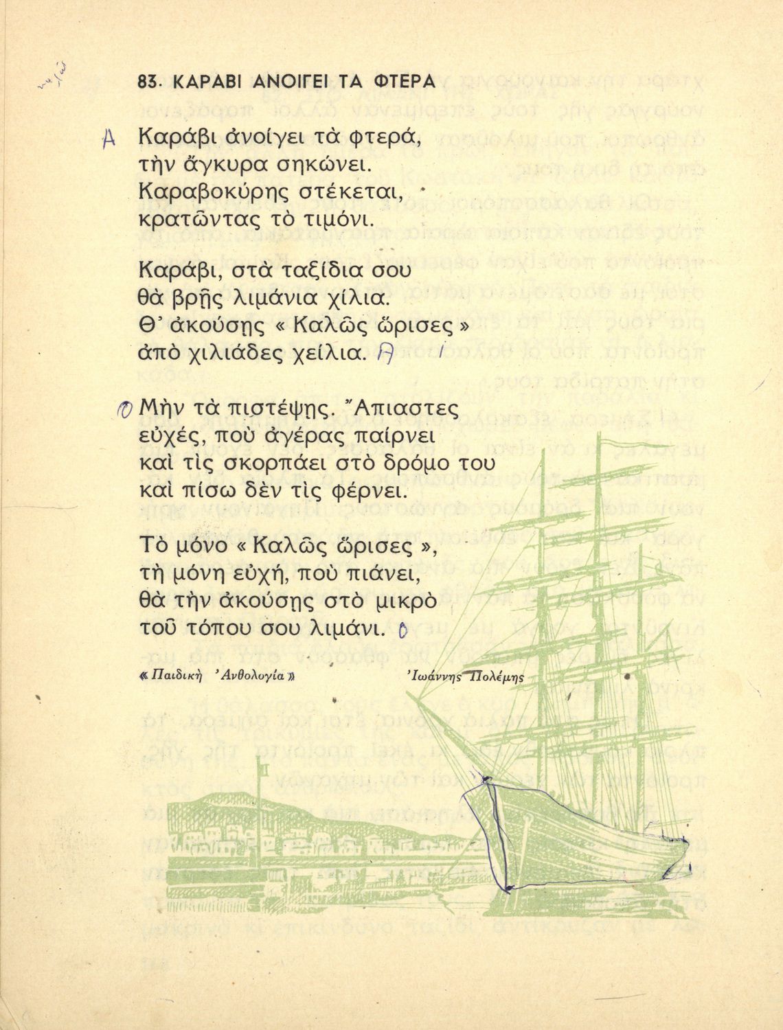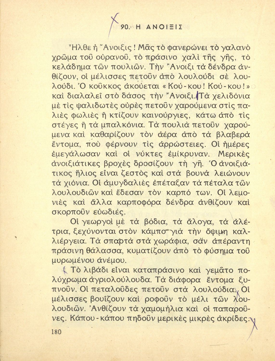 Αναγνωστικό Γ' Δημοτικού που είναι χωρισμένο σύμφωνα με τις εποχές του χρόνου και περιλαμβάνει ποιήματα και πεζά εμπνευσμένα από τη ζωή στην ύπαιθρο, την εθνική, οικογενειακή και κοινωνική ζωή, τη θρησκευτική παράδοση, τις ασχολίες των ανθρώπων, και την ελληνική φύση.