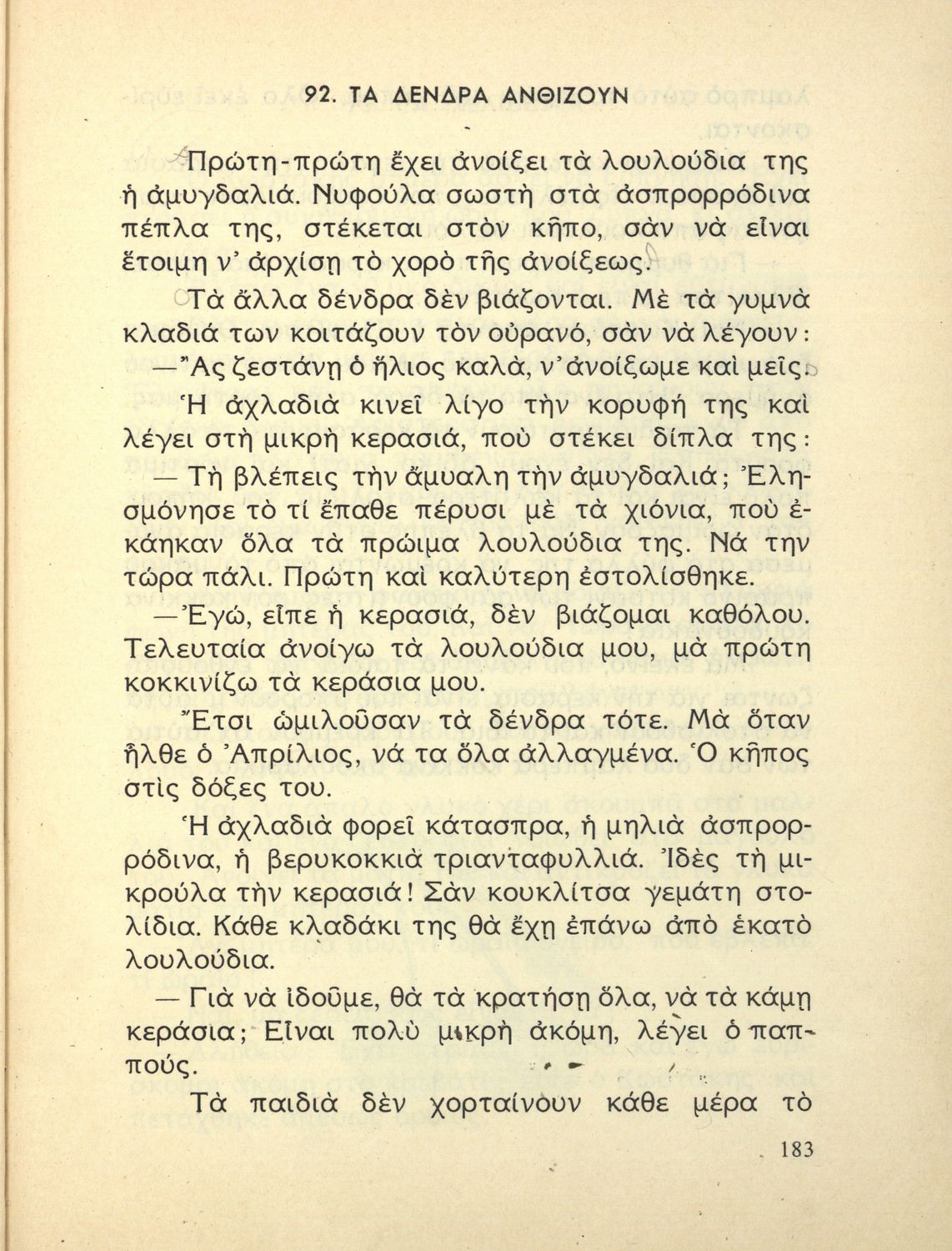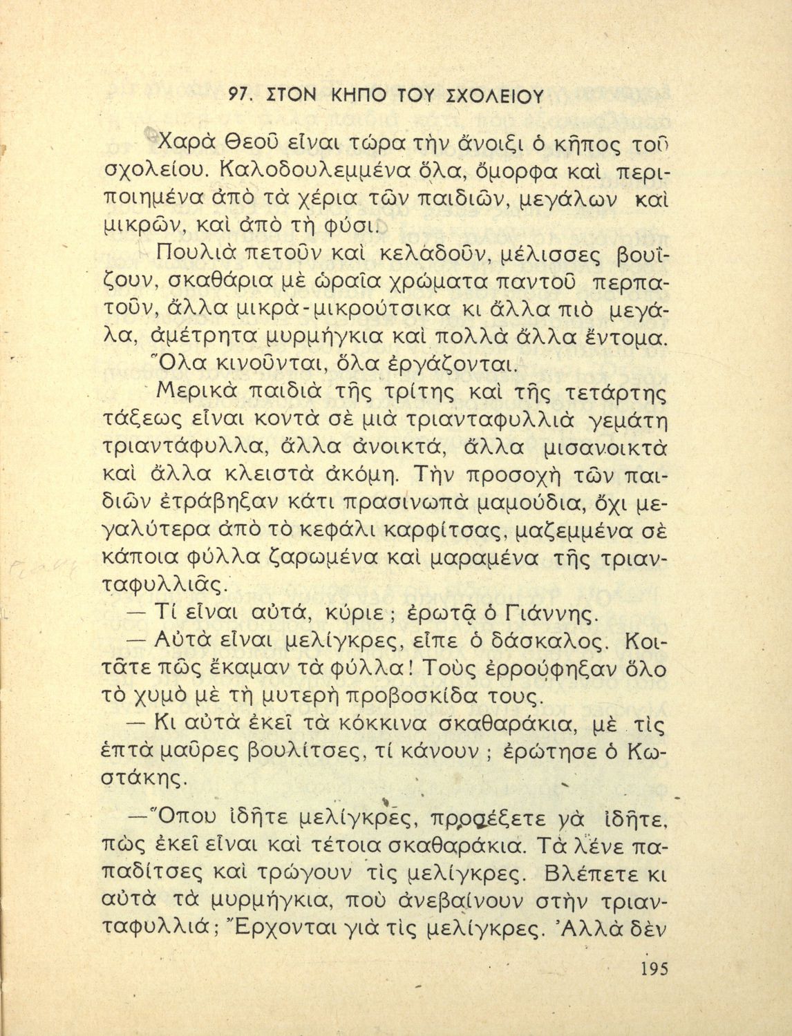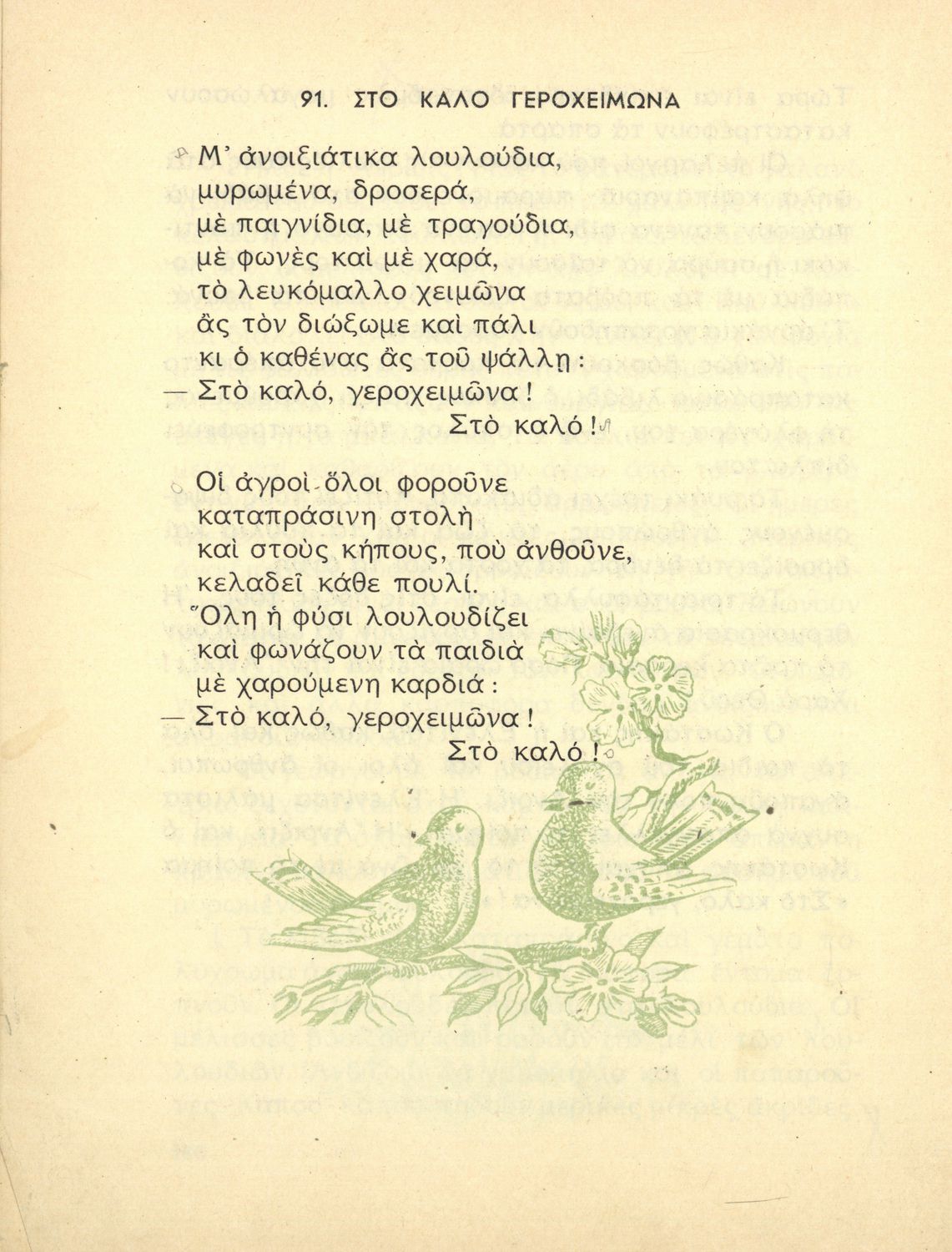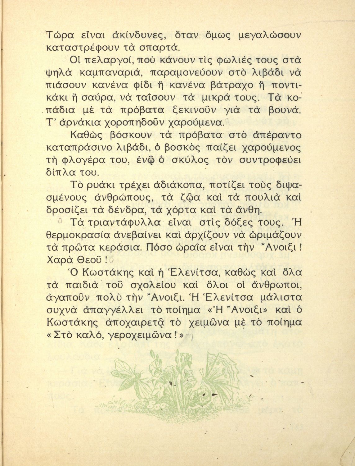 Αναγνωστικό Γ' Δημοτικού που είναι χωρισμένο σύμφωνα με τις εποχές του χρόνου και περιλαμβάνει ποιήματα και πεζά εμπνευσμένα από τη ζωή στην ύπαιθρο, την εθνική, οικογενειακή και κοινωνική ζωή, τη θρησκευτική παράδοση, τις ασχολίες των ανθρώπων, και την ελληνική φύση.