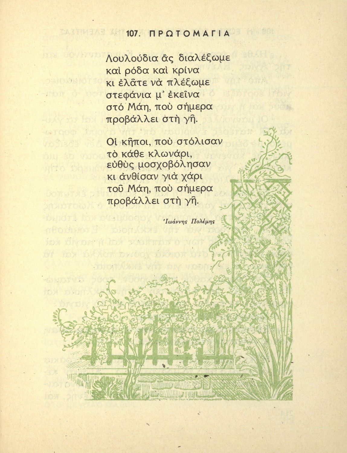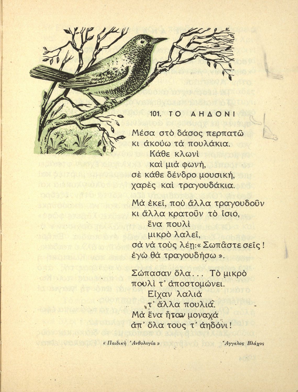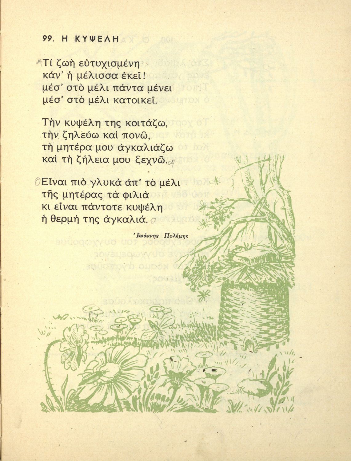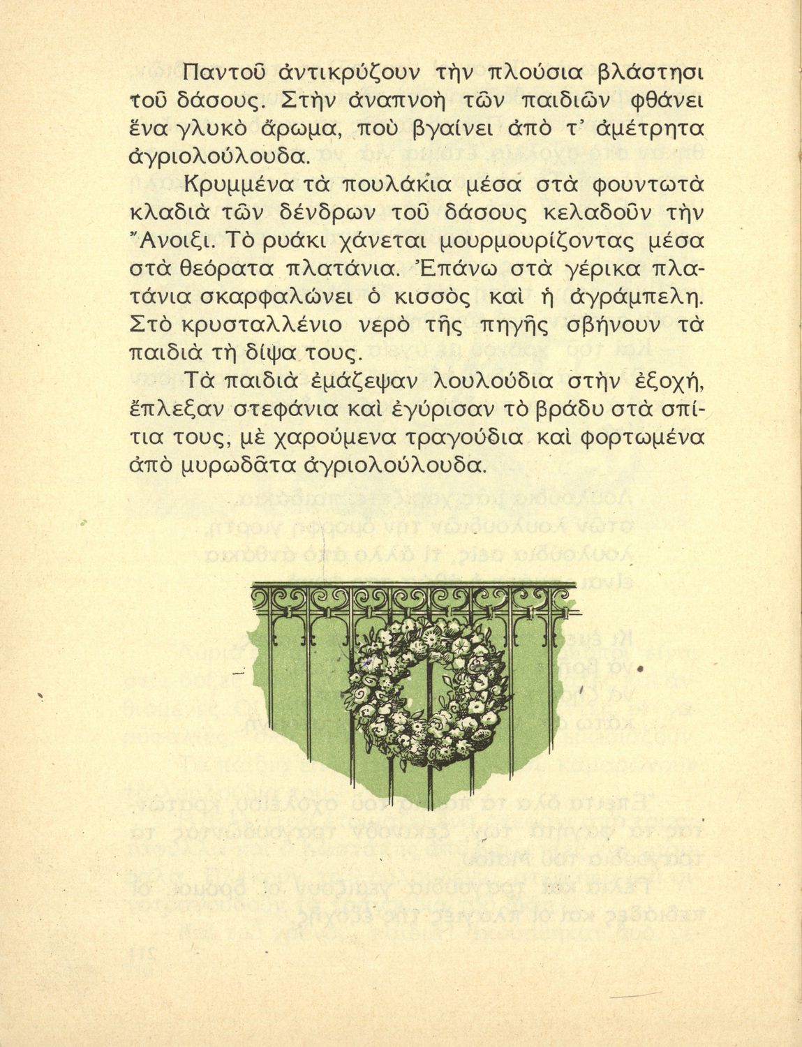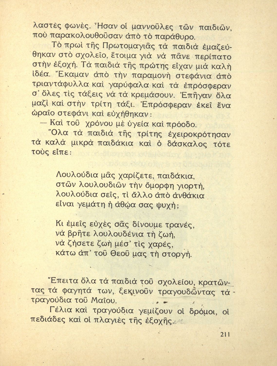 Αναγνωστικό Γ΄ Δημοτικού που περιλαμβάνει ποιήματα και πεζά εμπνευσμένα από την ελληνική φύση, τις ασχολίες των κατοίκων, την σύγχρονη ελληνική ιστορία, την ελληνική μυθολογία και τις θρησκευτικές γιορτές.