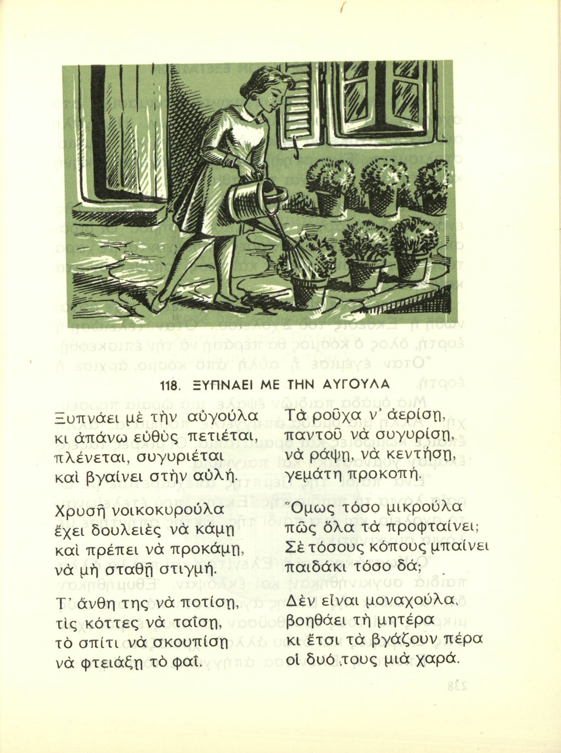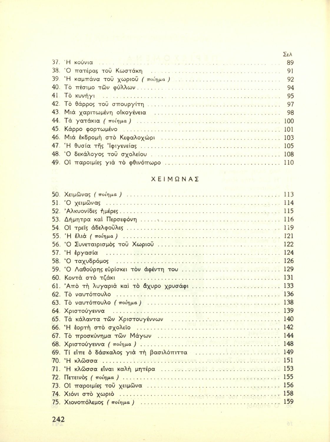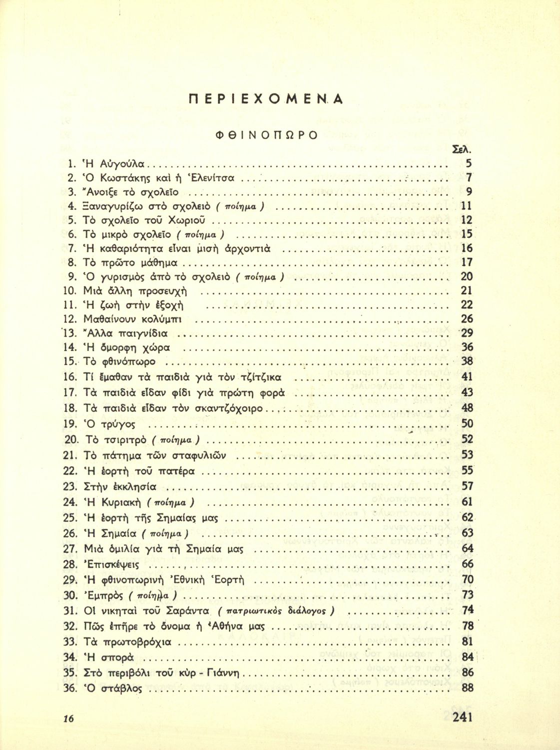 Αναγνωστικό Γ' Δημοτικού που είναι χωρισμένο σύμφωνα με τις εποχές του χρόνου και περιλαμβάνει ποιήματα και πεζά εμπνευσμένα από τη ζωή στην ύπαιθρο, την εθνική, οικογενειακή και κοινωνική ζωή, τη θρησκευτική παράδοση, τις ασχολίες των ανθρώπων, και την ελληνική φύση.
