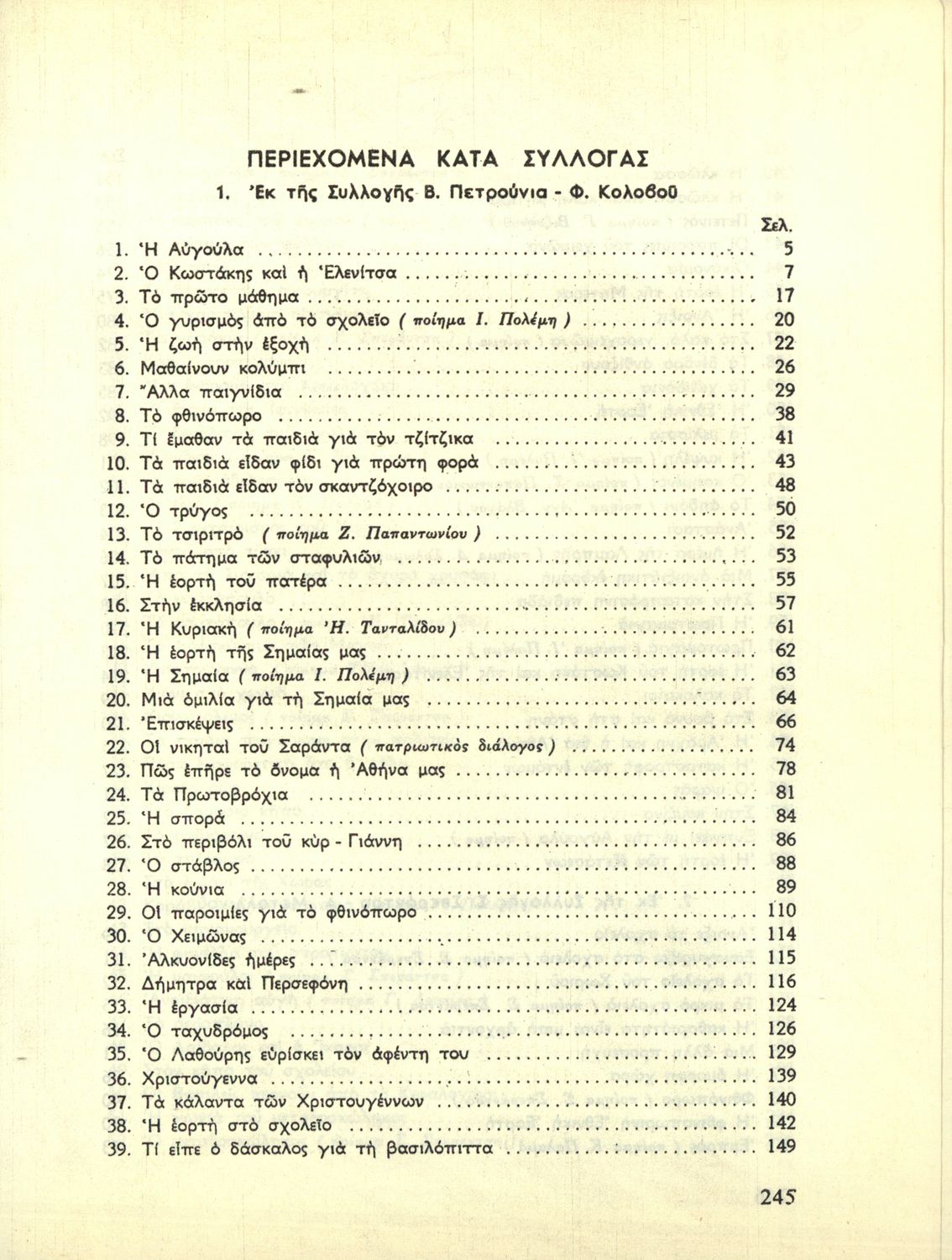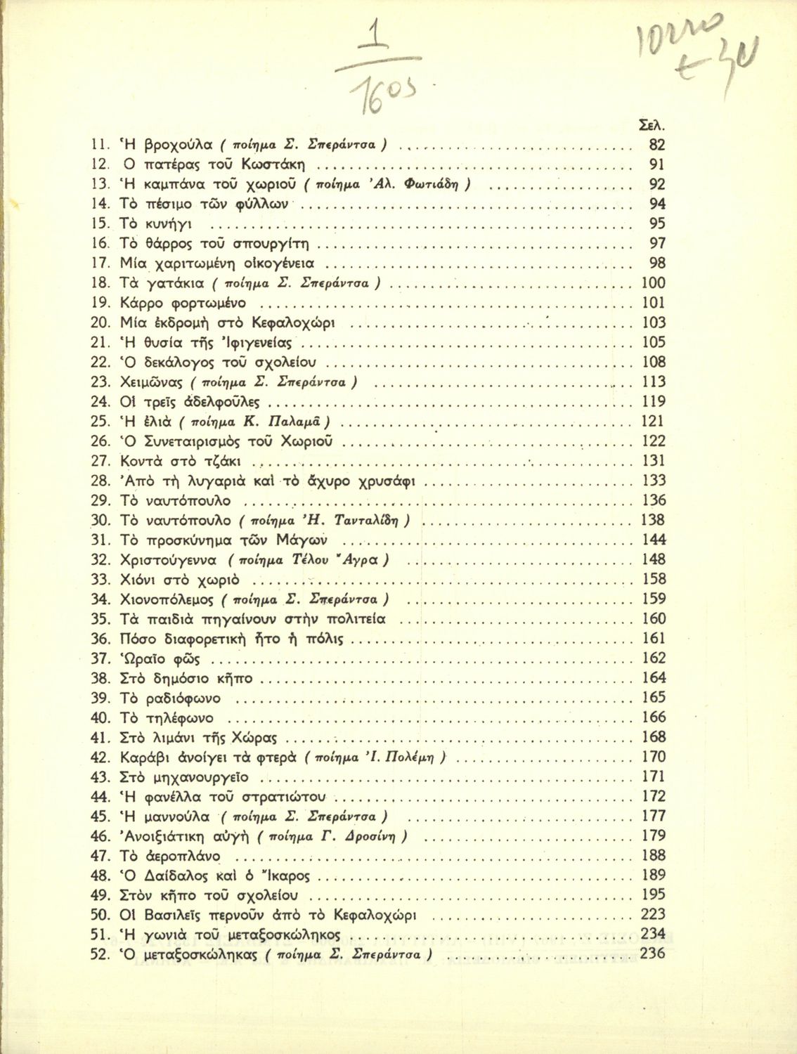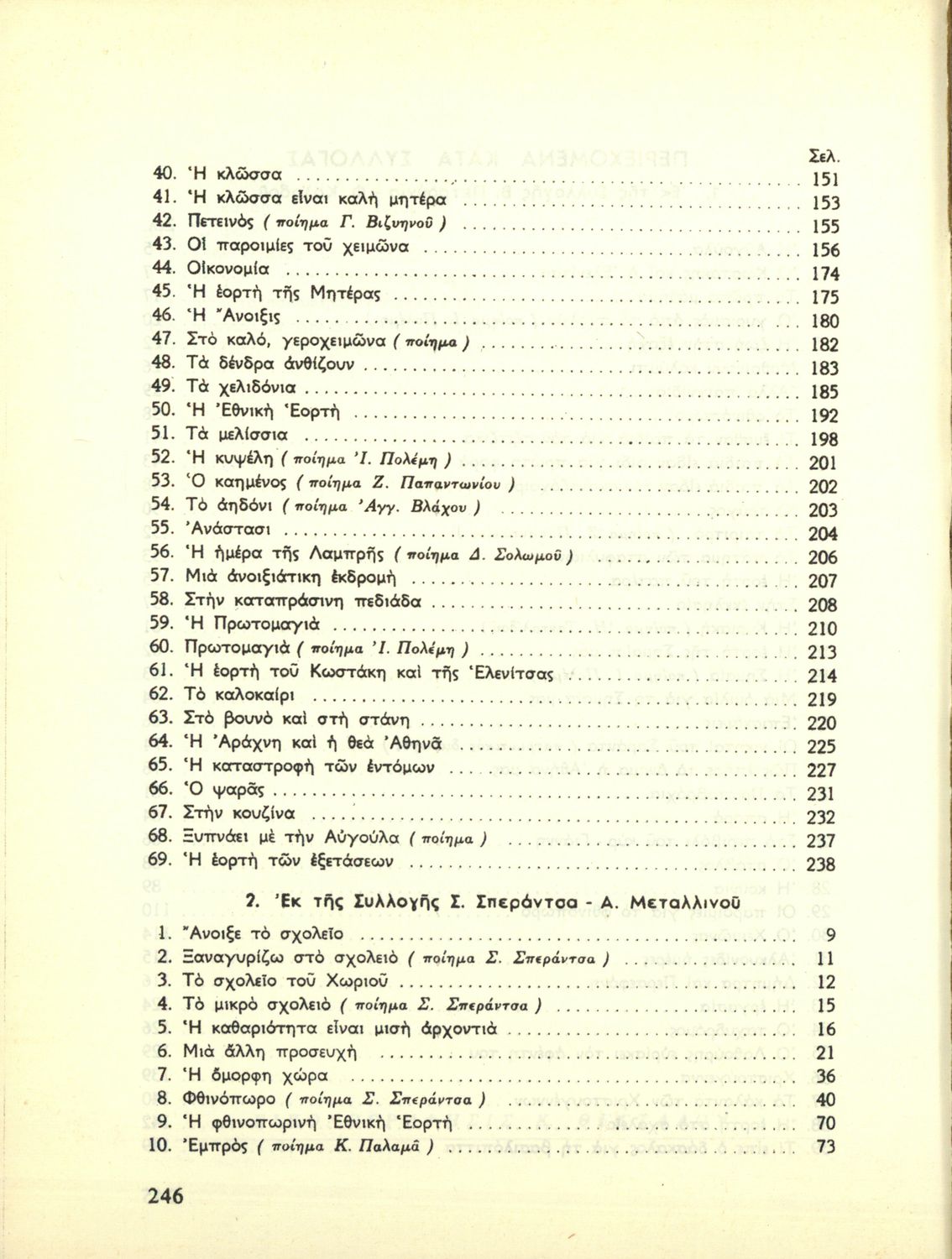 Αναγνωστικό Γ' Δημοτικού που είναι χωρισμένο σύμφωνα με τις εποχές του χρόνου και περιλαμβάνει ποιήματα και πεζά εμπνευσμένα από τη ζωή στην ύπαιθρο, την εθνική, οικογενειακή και κοινωνική ζωή, τη θρησκευτική παράδοση, τις ασχολίες των ανθρώπων, και την ελληνική φύση.