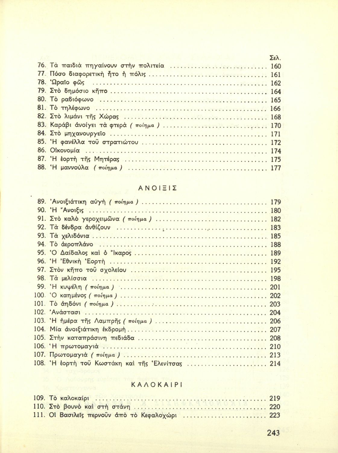 Αναγνωστικό Γ' Δημοτικού που είναι χωρισμένο σύμφωνα με τις εποχές του χρόνου και περιλαμβάνει ποιήματα και πεζά εμπνευσμένα από τη ζωή στην ύπαιθρο, την εθνική, οικογενειακή και κοινωνική ζωή, τη θρησκευτική ...