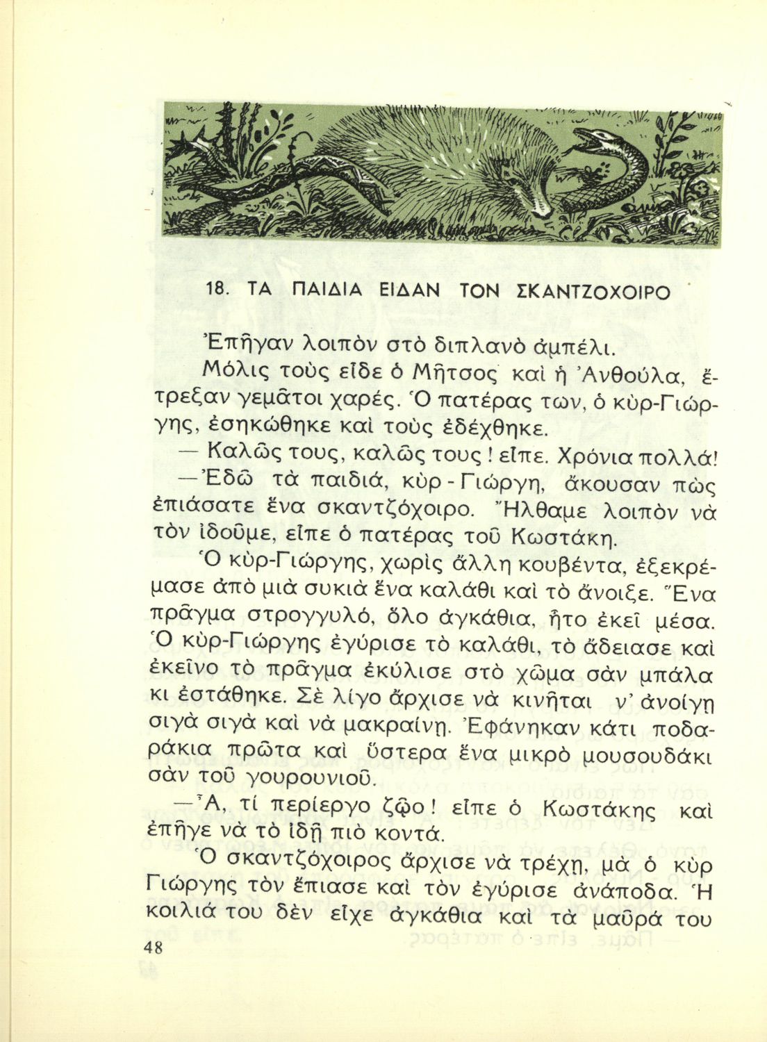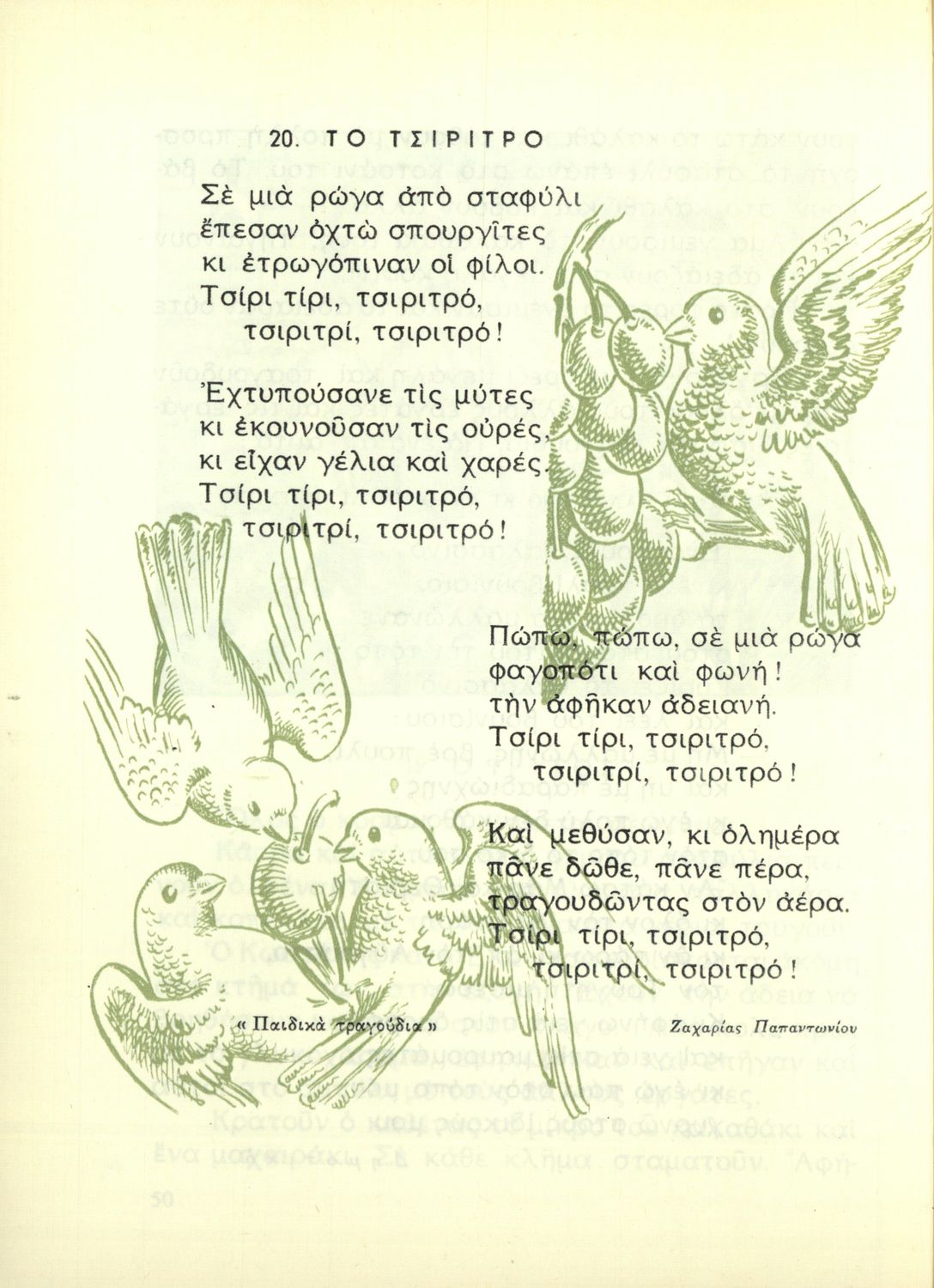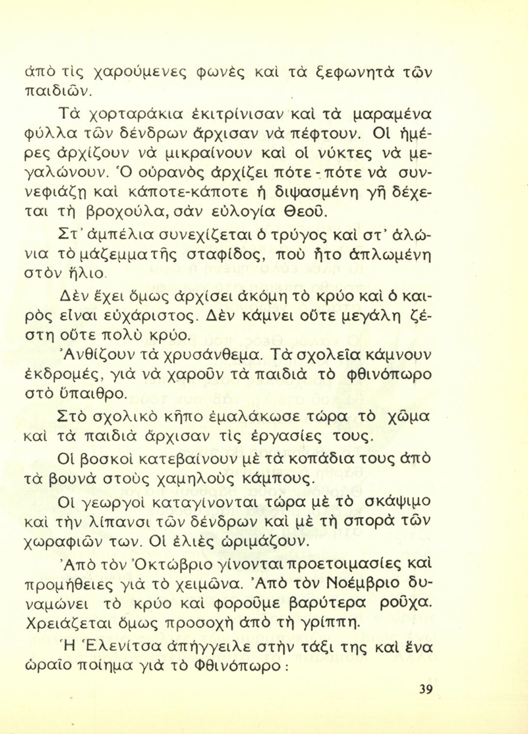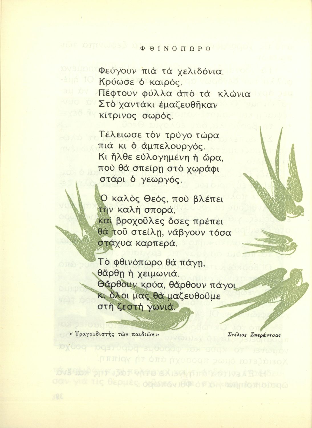 Αναγνωστικό Γ' Δημοτικού που είναι χωρισμένο σύμφωνα με τις εποχές του χρόνου και περιλαμβάνει ποιήματα και πεζά εμπνευσμένα από τη ζωή στην ύπαιθρο, την εθνική, οικογενειακή και κοινωνική ζωή, τη θρησκευτική παράδοση, τις ασχολίες των ανθρώπων, και την ελληνική φύση.