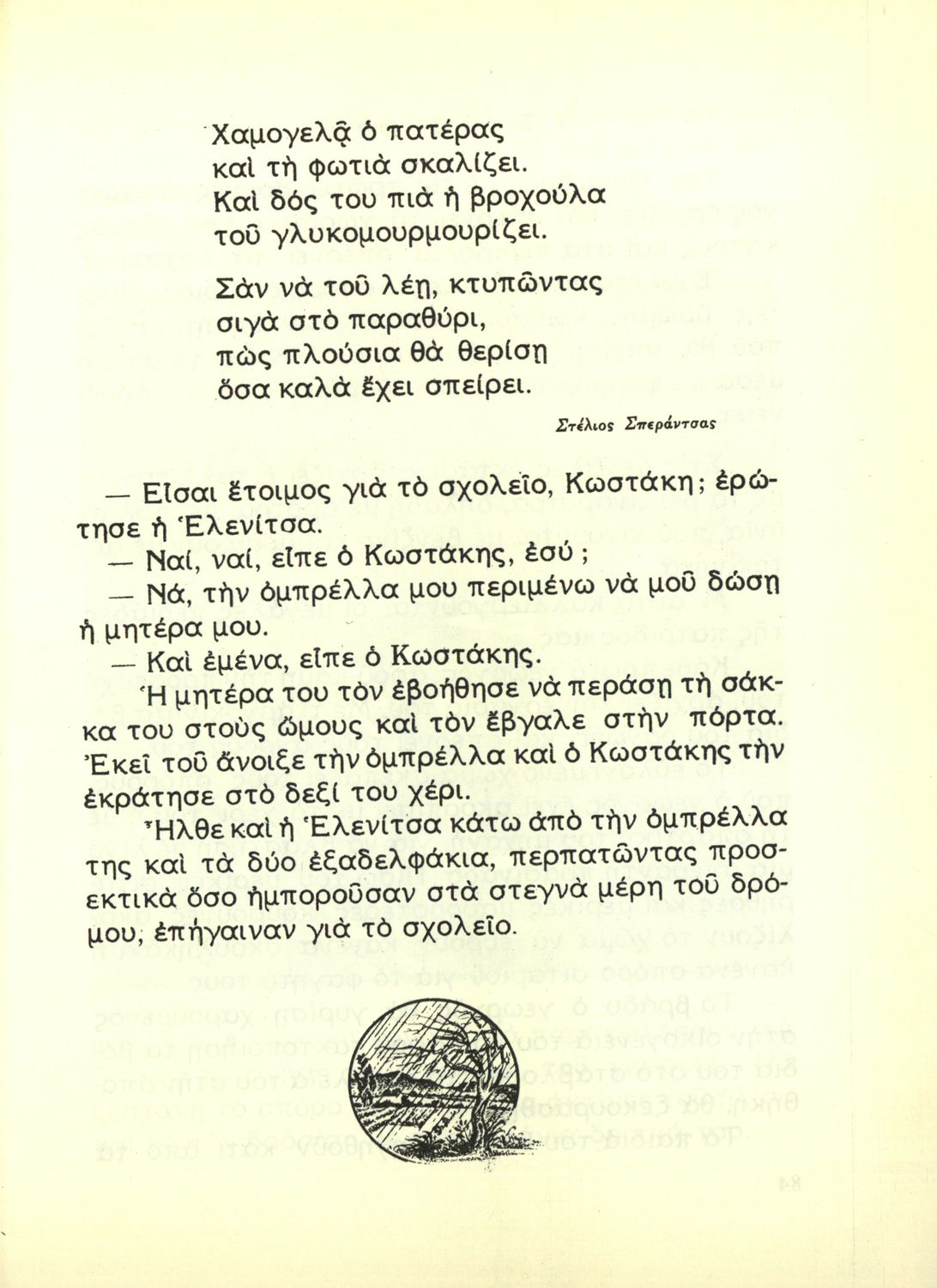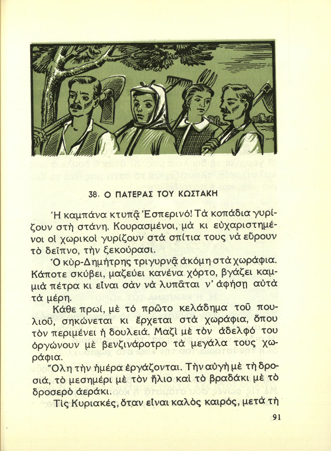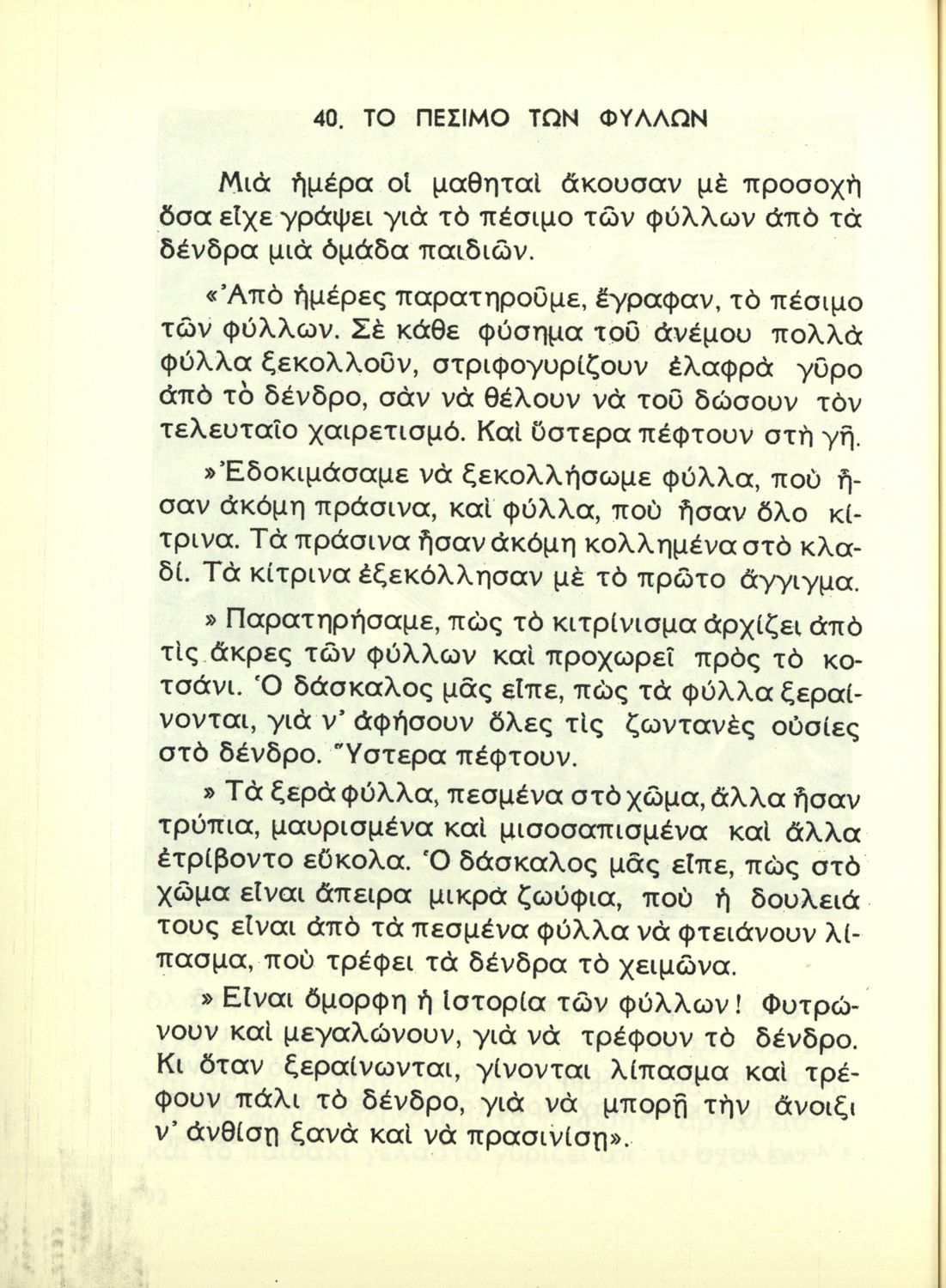 Αναγνωστικό Γ' Δημοτικού που είναι χωρισμένο σύμφωνα με τις εποχές του χρόνου και περιλαμβάνει ποιήματα και πεζά εμπνευσμένα από τη ζωή στην ύπαιθρο, την εθνική, οικογενειακή και κοινωνική ζωή, τη θρησκευτική παράδοση, τις ασχολίες των ανθρώπων, και την ελληνική φύση.