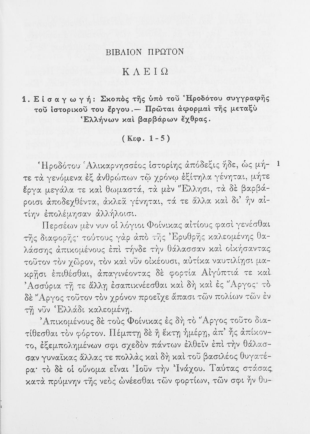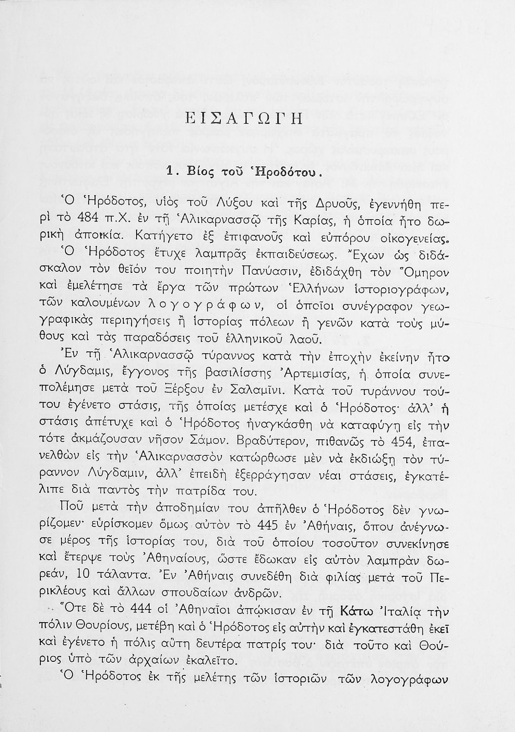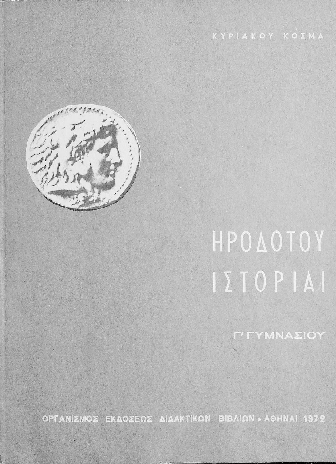 Σχολικό εγχειρίδιο Αρχαίων Ελληνικών Γ΄ Γυμνασίου που περιλαμβάνει εισαγωγή στη ζωή και το έργο του Ηρόδοτου, αποσπάσματα από την Ιστορία του, ερμηνευτικές σημειώσεις και τοπογραφικούς πίνακες με εικόνες και χάρτες. Φέρει το σύμβολο της δικτατορίας.